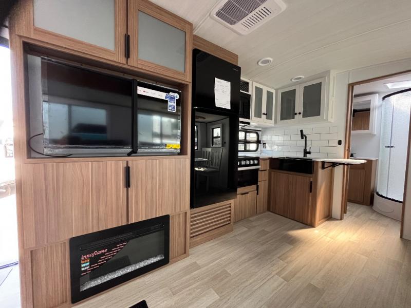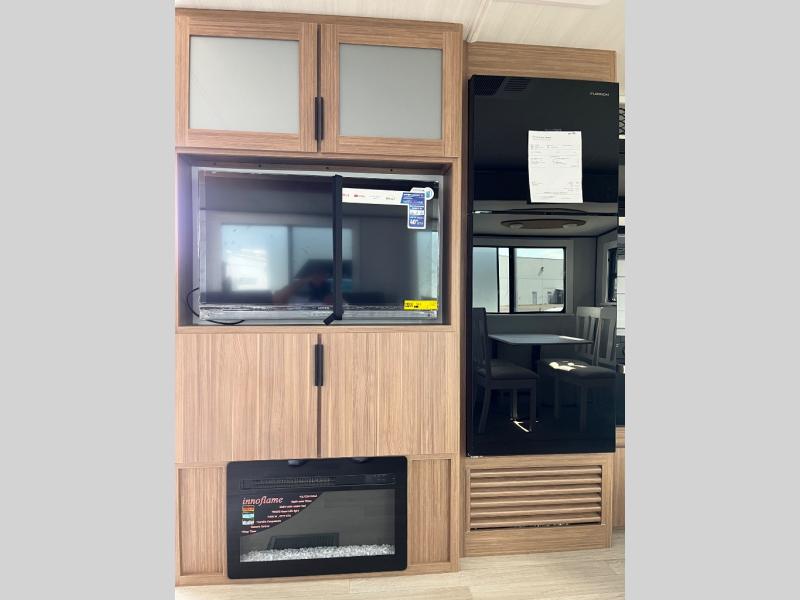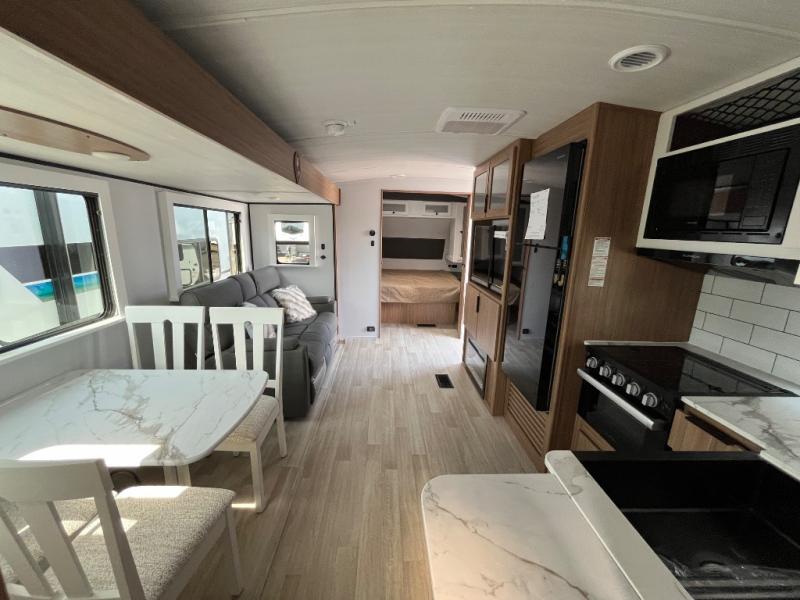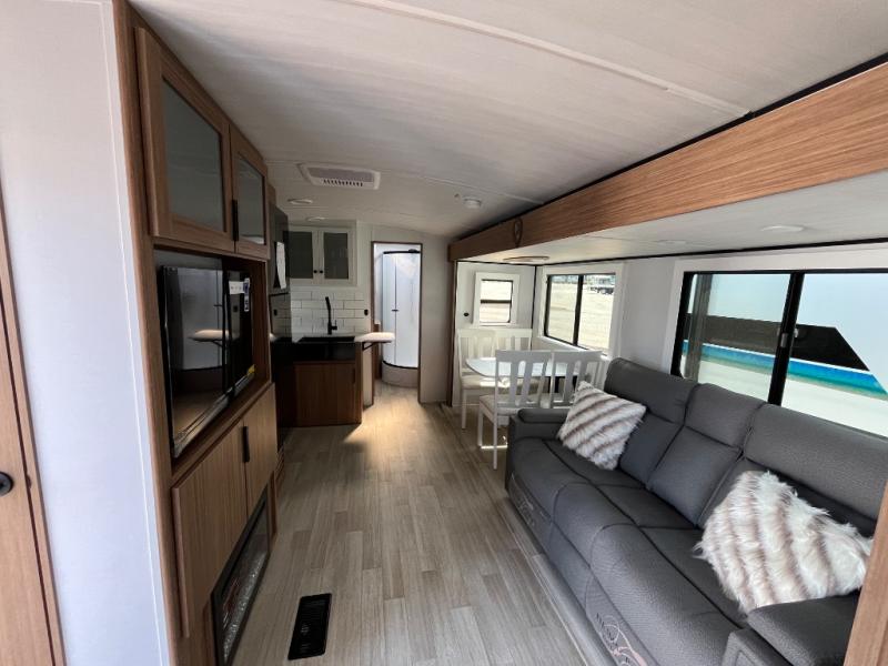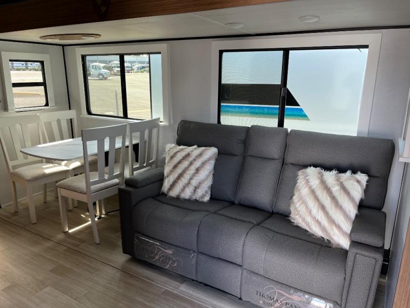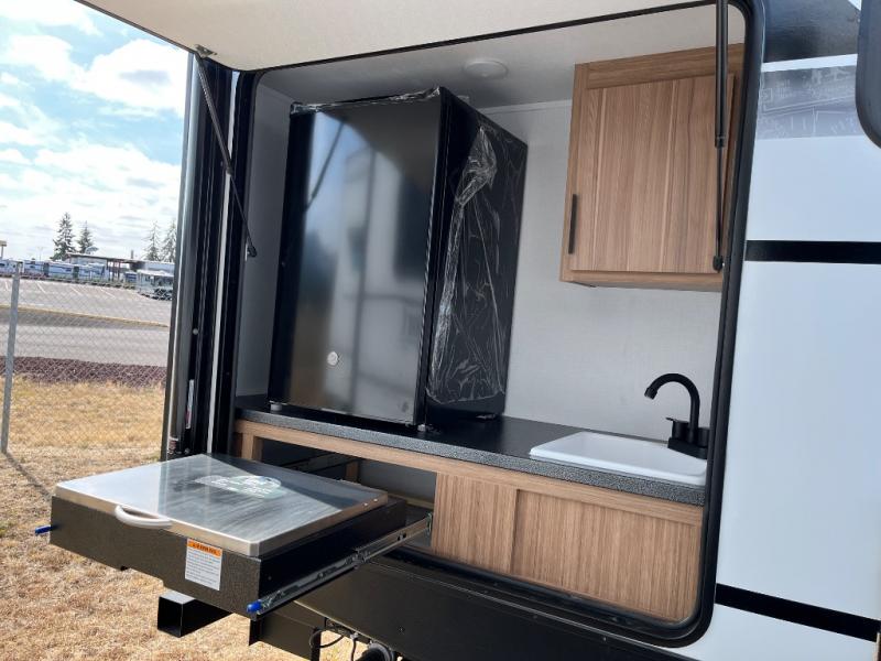 Time spent in this dual axle travel trailer will be time well spent. You can put out the 21' awning when you arrive, then unload the pass-thru storage and start lunch on the exterior kitchen with a Capital grill, sink, and mini refrigerator. The tri-fold sofa and Do-more Dinette table within the large slide out will provide a place to relax and dine each day, and there is a full interior kitchen when the weather isn't cooperating outdoors. This unit includes a front private bedroom with sliding doors for more space, a queen bed, dual wardrobes, and a nightstand to keep everything tidy. And don't overlook the full rear bath that will allow you to clean up each day without having to leave your trailer!