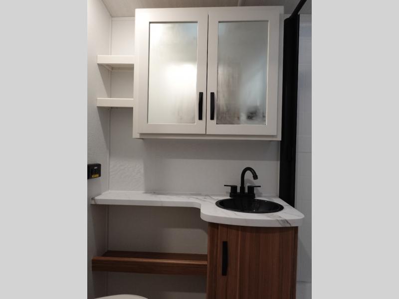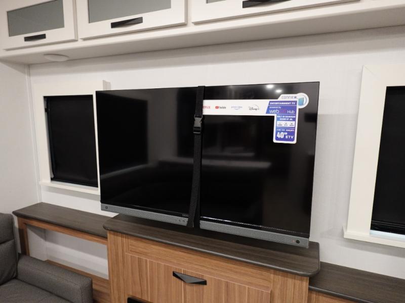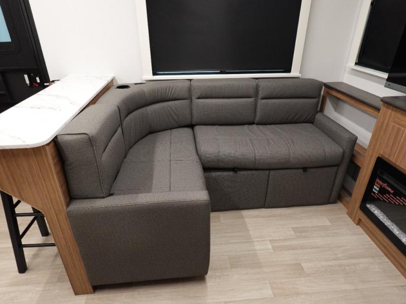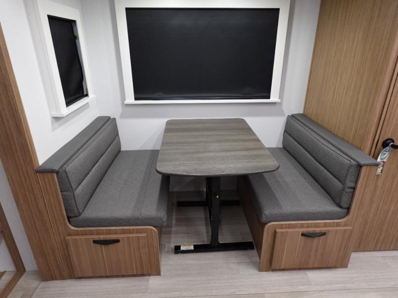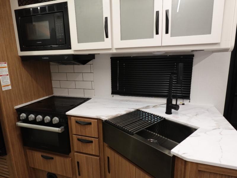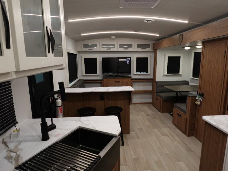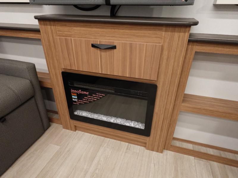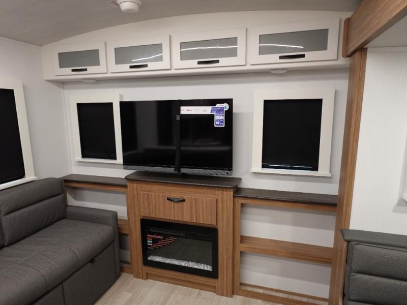 Step right into this rear living travel trailer for fun trips at the lake! There is an L-shaped sectional sofa in the back, along with an entertainment center and a fireplace to enjoy cozy evenings indoors. The booth dinette will provide a place to dine, play games, and even let a guest or two littles ones sleep. This unit also includes a spacious pantry and a coffee station where you can set up your own Keurig machine. A full kitchen will let you prepare meals each day, and the mid-coach full bath will be easily accessible for everyone to use. You will also love the front private bedroom with its queen bed, plus dual wardrobes and dual nightstands so everything has its own place!