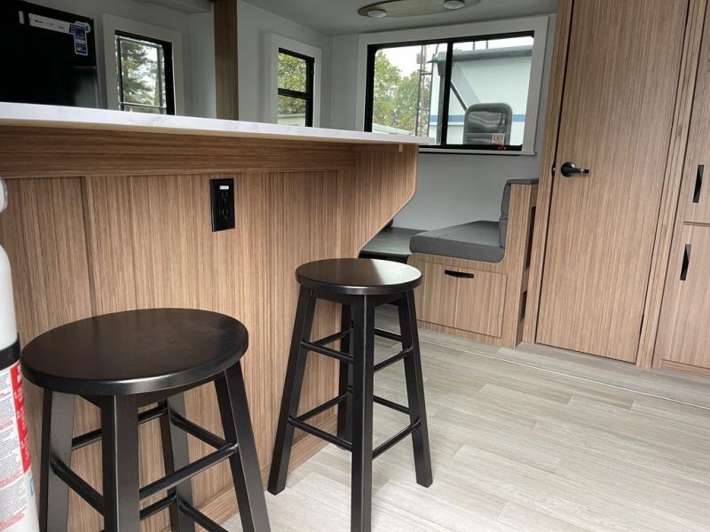 Rear living with L-Shaped sofa/loveseat at entertainment center with TV and fireplace.. Counter with two barstools. Slideout has convertible booth dinette along with floor to ceiling pantry with adjustable shelves and three areas for storage. Walk around 60x80 queen in private master. Full bath with step in shower.
