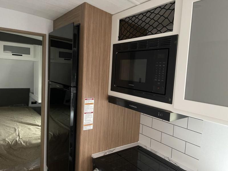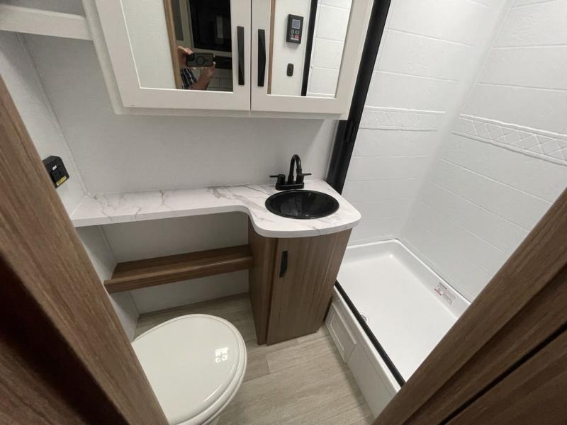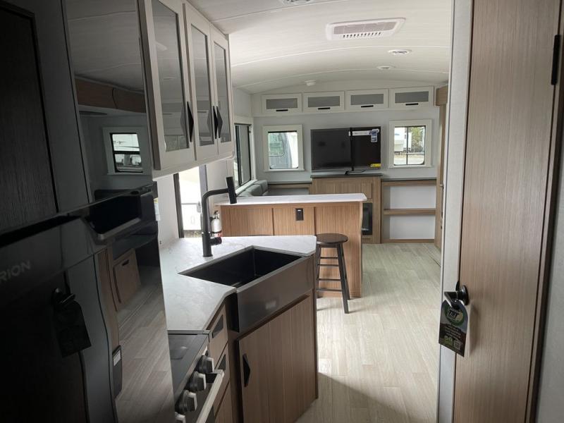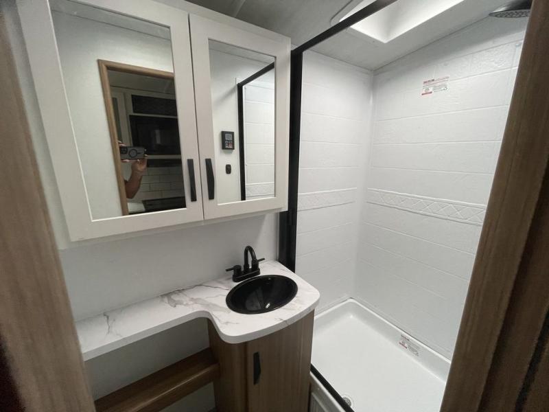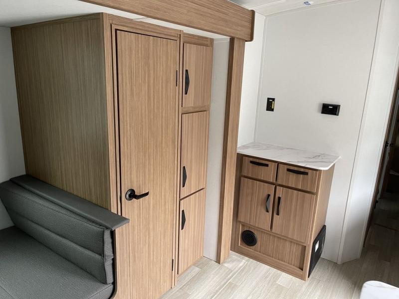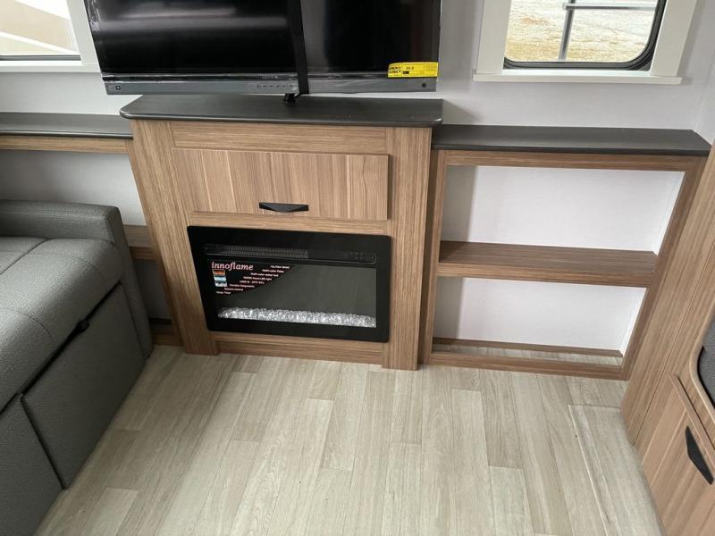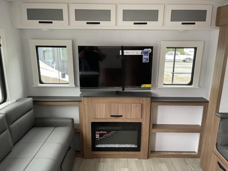 Step right into this rear living travel trailer for fun trips at the lake! There is an L-shaped sectional sofa in the back, along with an entertainment center and a fireplace to enjoy cozy evenings indoors. The booth dinette will provide a place to dine, play games, and even let a guest or two littles ones sleep. This unit also includes a spacious pantry and a coffee station where you can set up your own Keurig machine. A full kitchen will let you prepare meals each day, and the mid-coach full bath will be easily accessible for everyone to use. You will also love the front private bedroom with its queen bed, plus dual wardrobes and dual nightstands so everything has its own place!