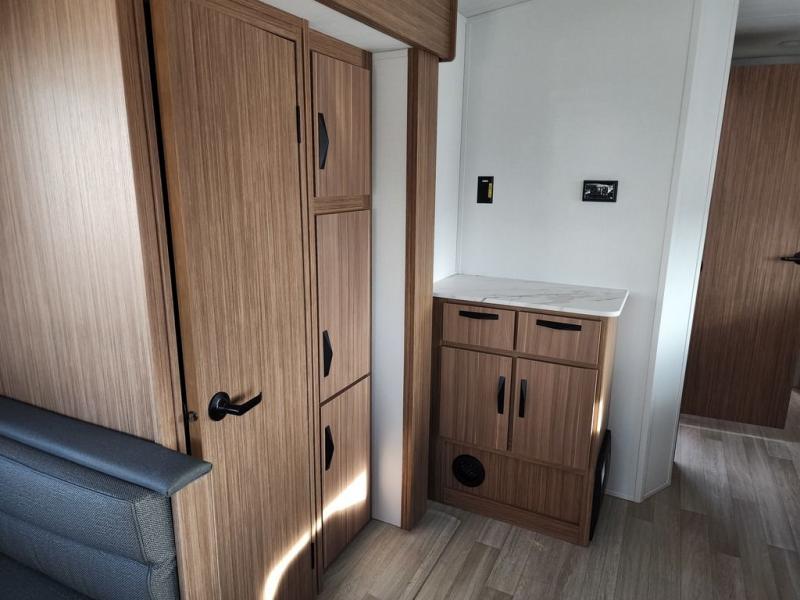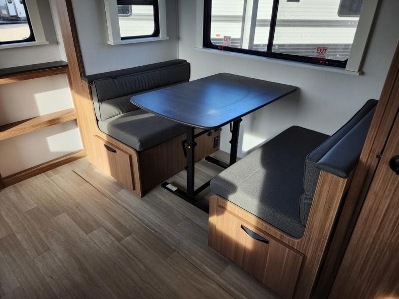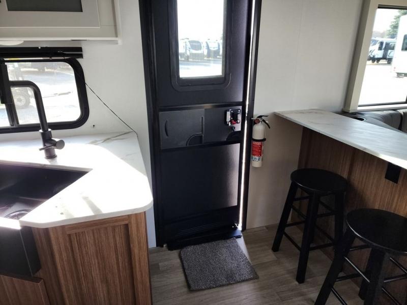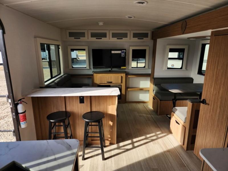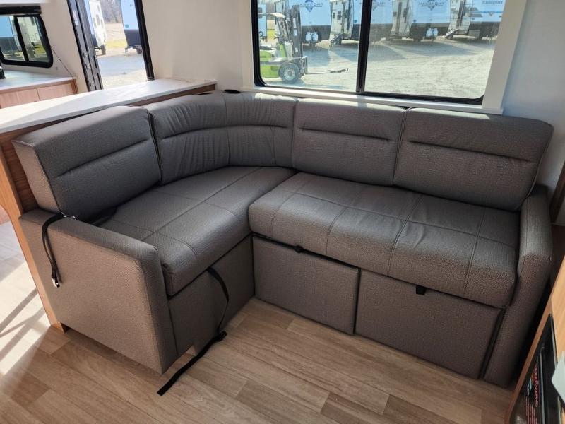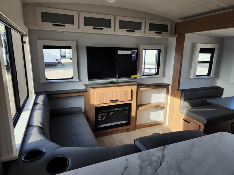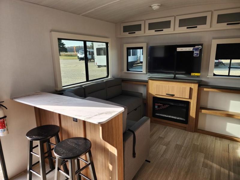Step right into this rear living travel trailer for fun trips at the lake! There is an L-shaped sectional sofa in the back, along with an entertainment center and a fireplace to enjoy cozy evenings indoors. The booth dinette will provide a place to dine, play games, and even let a guest or two littles ones sleep. This unit also includes a spacious pantry and a coffee station where you can set up your own Keurig machine. A full kitchen will let you prepare meals each day, and the mid-coach full bath will be easily accessible for everyone to use. You will also love the front private bedroom with its queen bed, plus dual wardrobes and dual nightstands so everything has its own place!