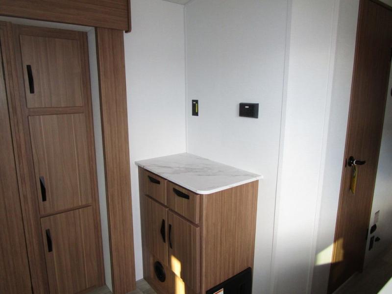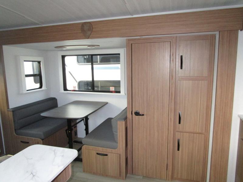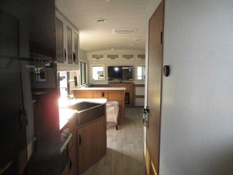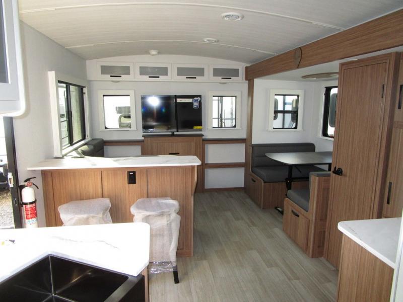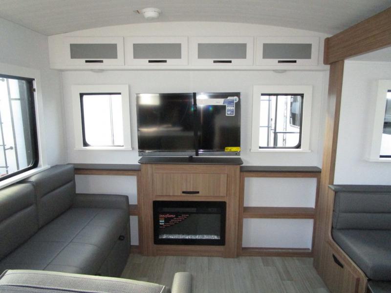 Step right into this rear living travel trailer for fun trips at the lake! There is an L-shaped sectional sofa in the back, along with an entertainment center and a fireplace to enjoy cozy evenings indoors. The booth dinette will provide a place to dine, play games, and even let a guest or two littles ones sleep. This unit also includes a spacious pantry and a coffee station where you can set up your own Keurig machine. A full kitchen will let you prepare meals each day, and the mid-coach full bath will be easily accessible for everyone to use. You will also love the front private bedroom with its queen bed, plus dual wardrobes and dual nightstands so everything has its own place!