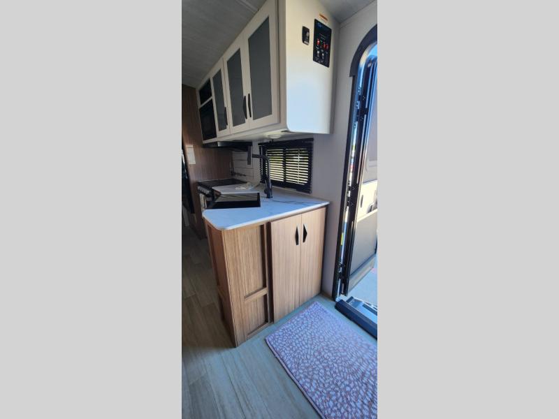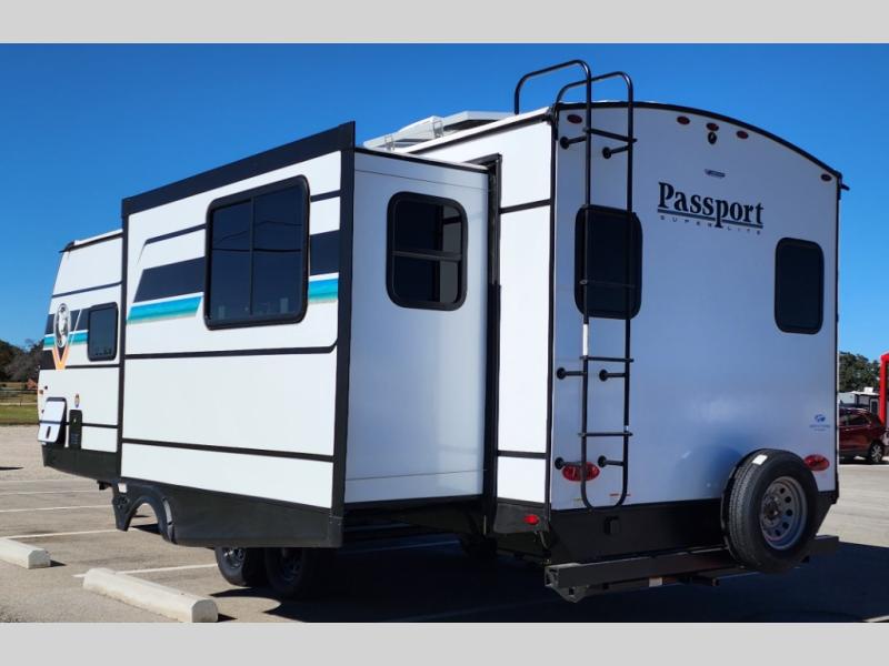 With any Keystone Passport Super Lite travel trailer you will enjoy lightweight towing and lots of interior comforts! The power tongue jack lets you hitch up at the drop of a hat, and the Dexter torsion axle rubber ride suspension will make towing easier than ever. You will appreciate having power stabilizer jacks for quick setup and an exterior convenience center to monitor tank levels. These trailers are constructed with a seamless, laminated and gel-coated filon exterior, 80% tinted safety glass windows, and a one-piece polypropylene underbelly. The interior will have you feeling right at home with residential durable Beauflor vinyl flooring, deluxe night shades, LED lighting throughout, and seamless kitchen countertops to name a few comforts.