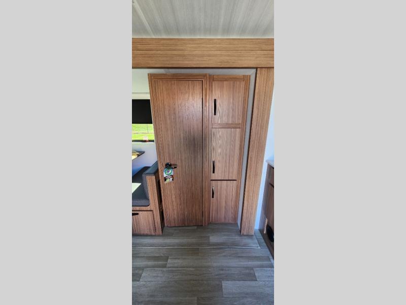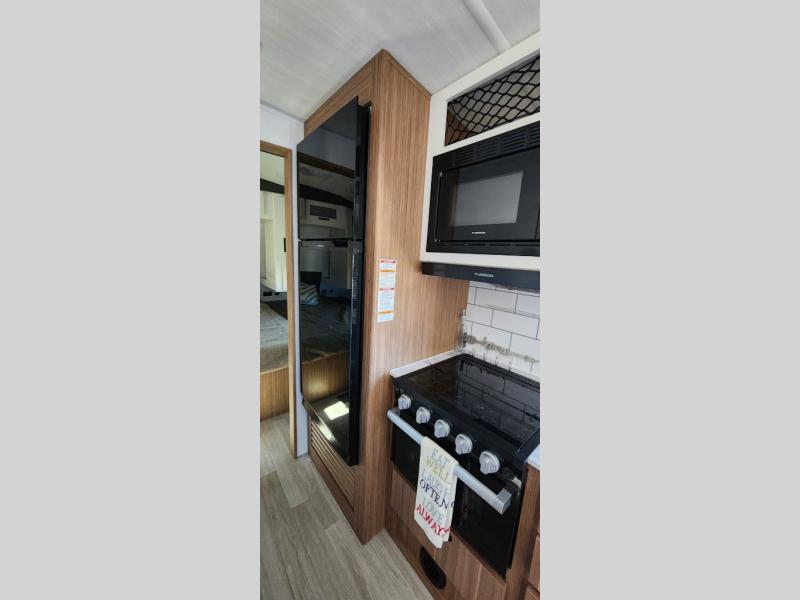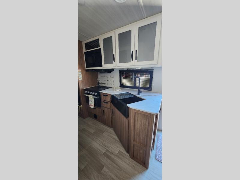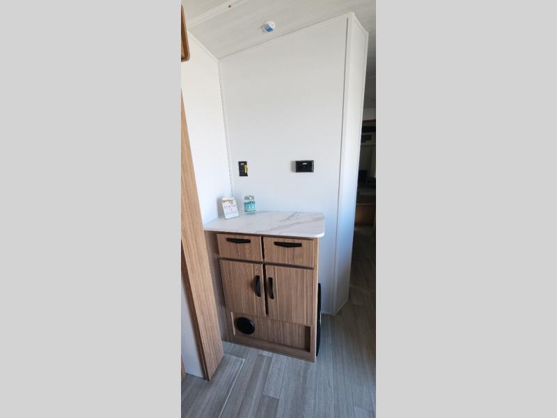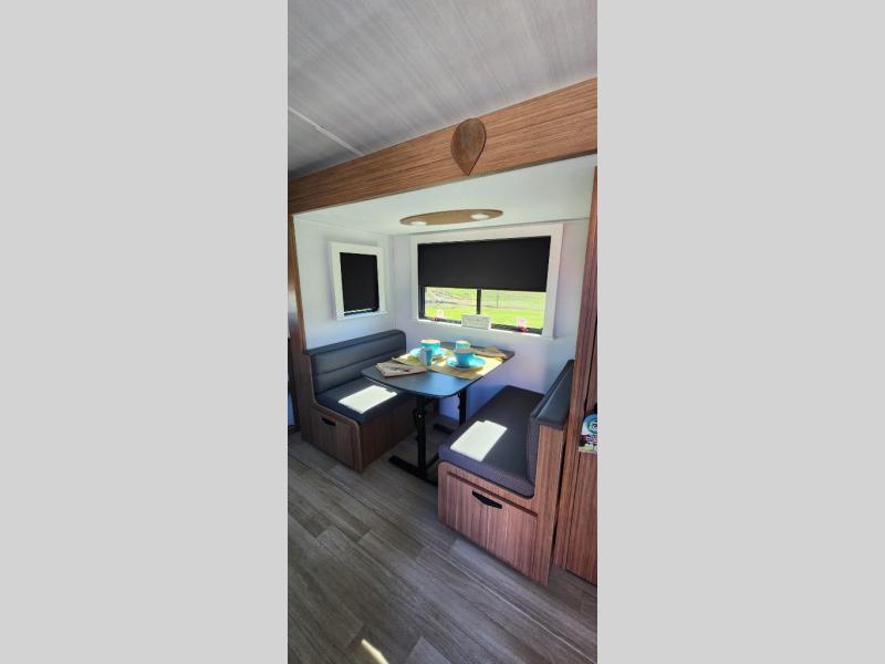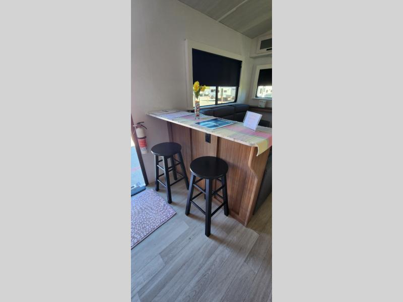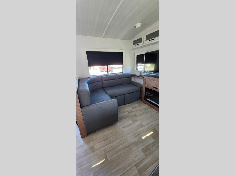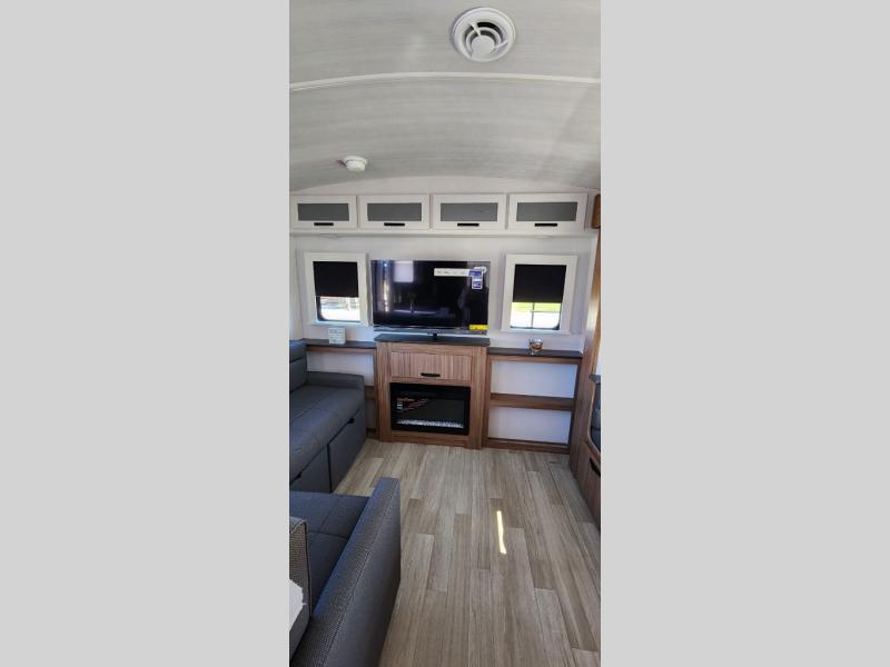Step right into this rear living travel trailer for fun trips at the lake! There is an L-shaped sectional sofa in the back, along with an entertainment center and a fireplace to enjoy cozy evenings indoors. The booth dinette will provide a place to dine, play games, and even let a guest or two littles ones sleep. This unit also includes a spacious pantry and a coffee station where you can set up your own Keurig machine. A full kitchen will let you prepare meals each day, and the mid-coach full bath will be easily accessible for everyone to use. You will also love the front private bedroom with its queen bed, plus dual wardrobes and dual nightstands so everything has its own place!