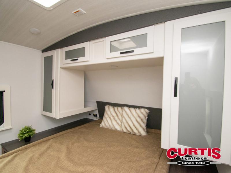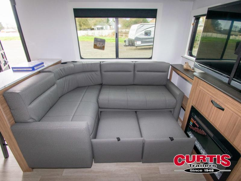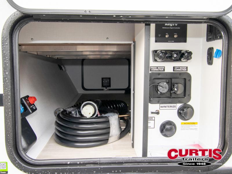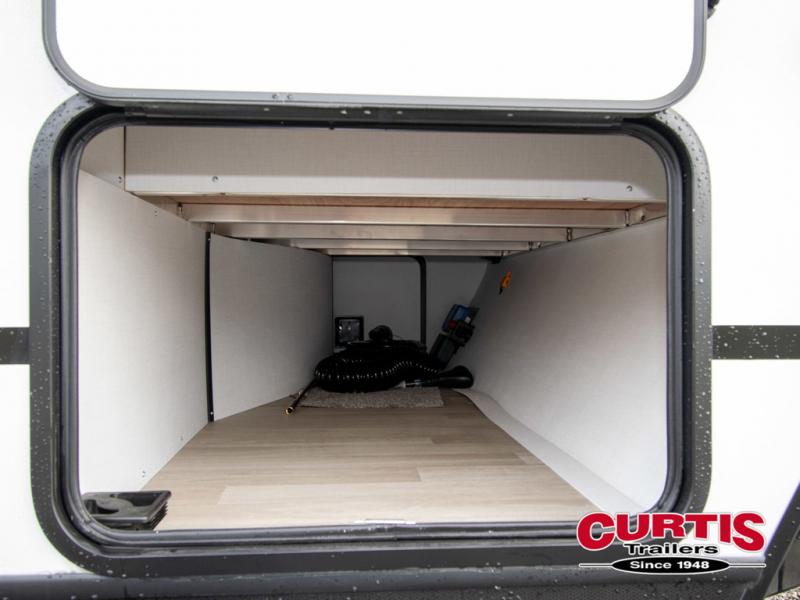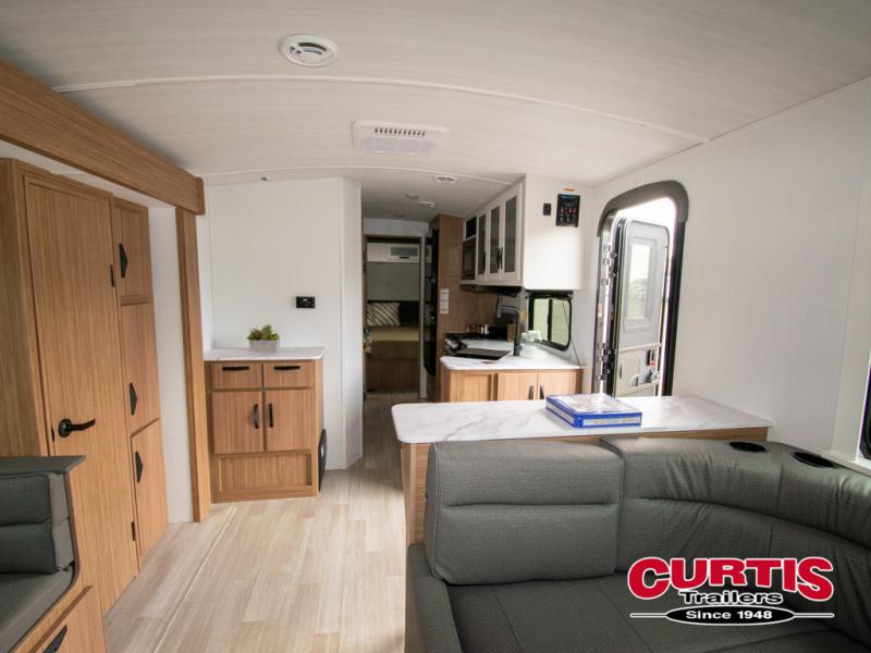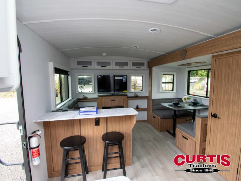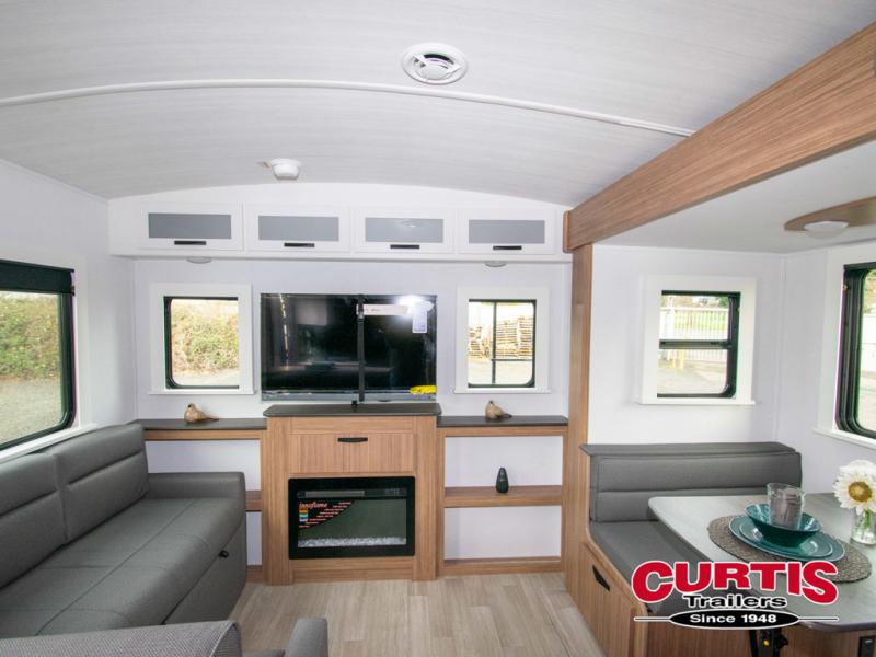 Step right into this rear living travel trailer for fun trips at the lake! There is an L-shaped sectional sofa in the back, along with an entertainment center and a fireplace to enjoy cozy evenings indoors. The booth dinette will provide a place to dine, play games, and even let a guest or two littles ones sleep. This unit also includes a spacious pantry and a coffee station where you can set up your own Keurig machine. A full kitchen will let you prepare meals each day, and the mid-coach full bath will be easily accessible for everyone to use. You will also love the front private bedroom with its queen bed, plus dual wardrobes and dual nightstands so everything has its own place!