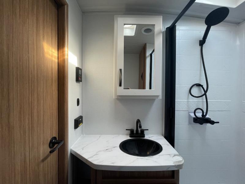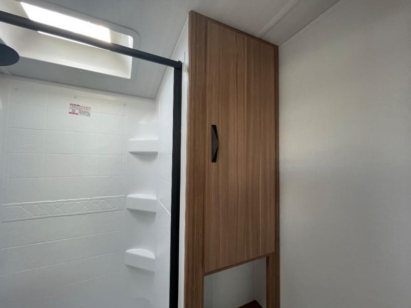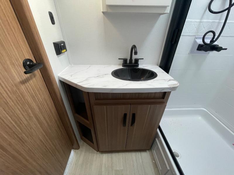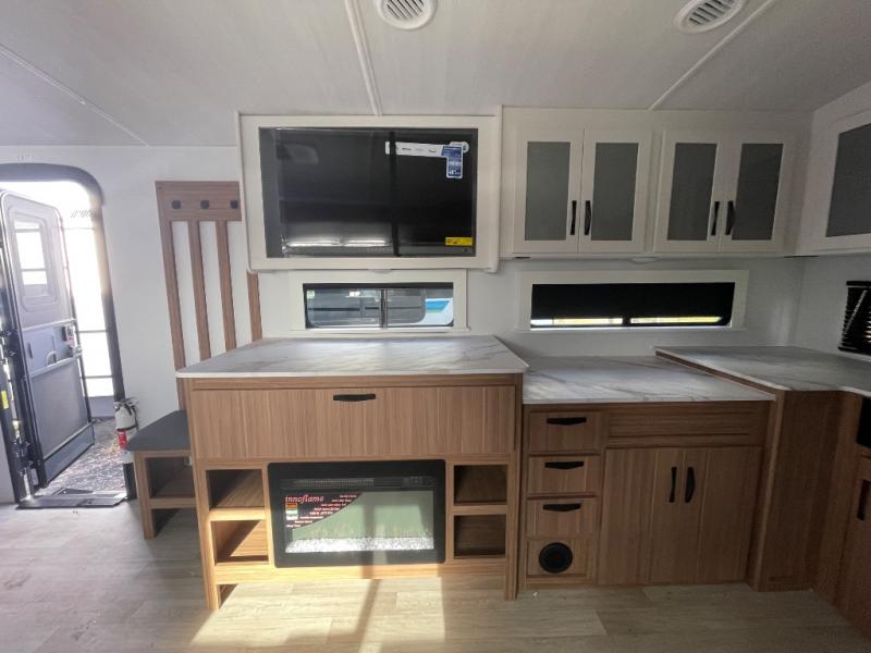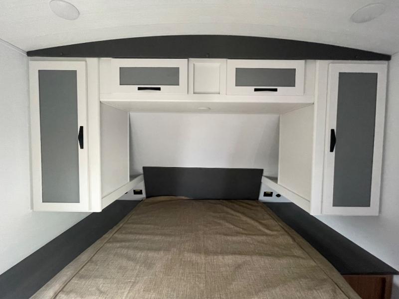 You'll love every minute spent in this rear kitchen travel trailer. There is extended counter space the chef is sure to love, and the pull-out dinette table provides a place to dine together. If the weather is nice, you might want to cook on the outdoor kitchen and dine under the 19' awning. Back inside there is a tri-fold sofa and luxury cinema recliners to relax on in the evening, and the full bath will let you freshen up before bed. Speaking of bedtime; the front private bedroom will be waiting for you with a queen bed, a closet, plus dual nightstands and dual wardrobes!