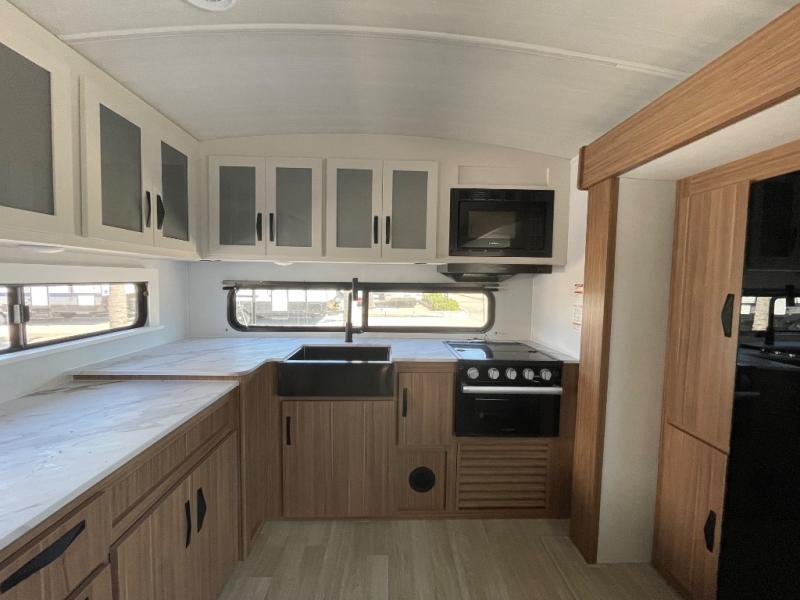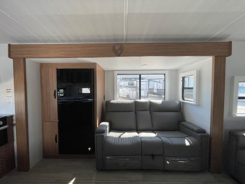 You'll love every minute spent in this rear kitchen travel trailer. There is extended counter space the chef is sure to love, and the pull-out dinette table provides a place to dine together. If the weather is nice, you might want to cook on the outdoor kitchen and dine under the 19' awning. Back inside there is a tri-fold sofa and luxury cinema recliners to relax on in the evening, and the full bath will let you freshen up before bed. Speaking of bedtime; the front private bedroom will be waiting for you with a queen bed, a closet, plus dual nightstands and dual wardrobes!