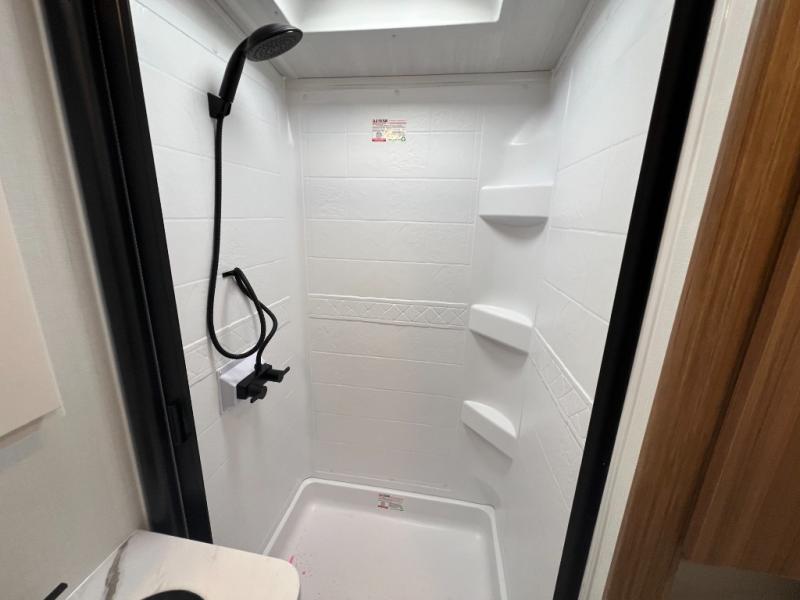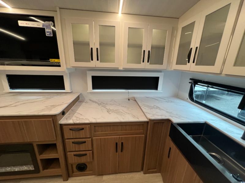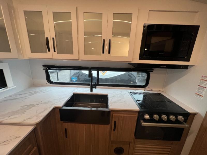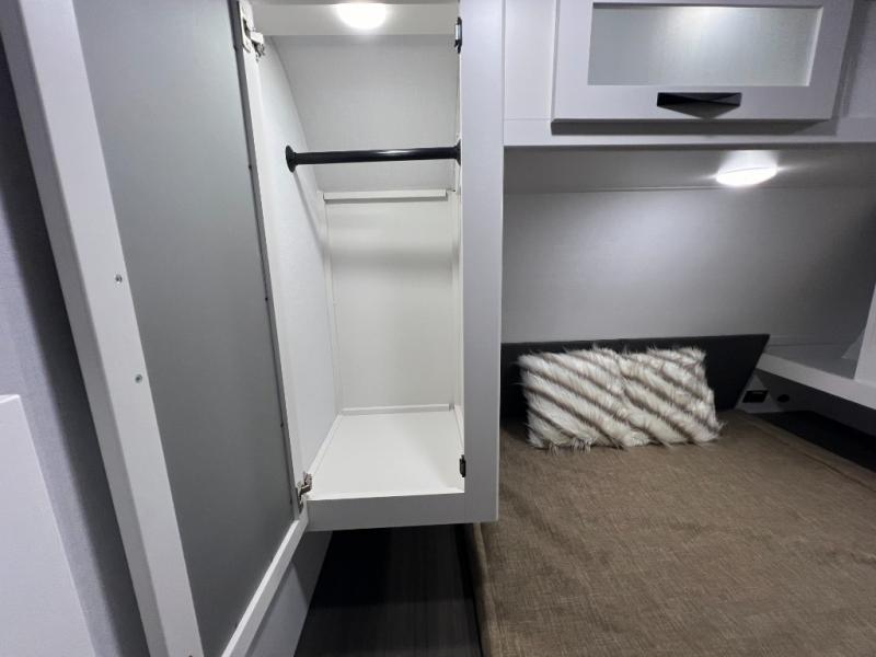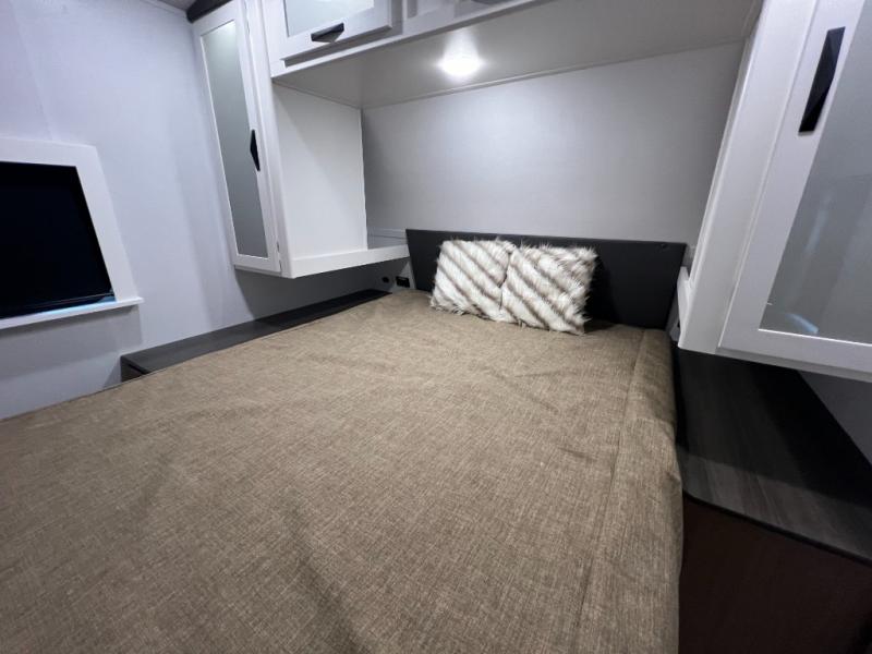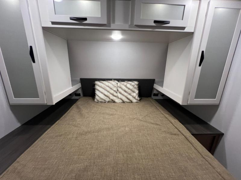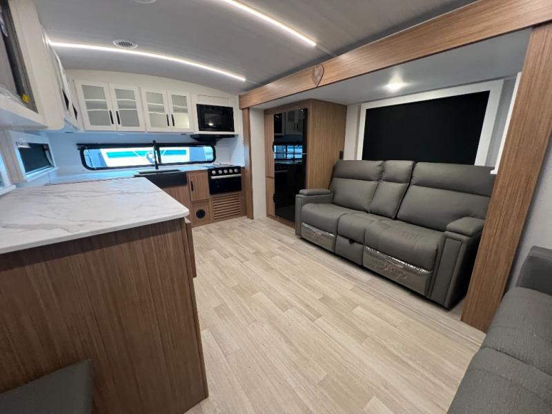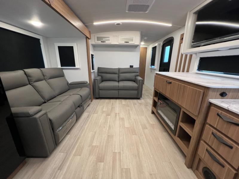 You'll love every minute spent in this rear kitchen travel trailer. There is extended counter space the chef is sure to love, and the pull-out dinette table provides a place to dine together. If the weather is nice, you might want to cook on the outdoor kitchen and dine under the 19' awning. Back inside there is a tri-fold sofa and luxury cinema recliners to relax on in the evening, and the full bath will let you freshen up before bed. Speaking of bedtime; the front private bedroom will be waiting for you with a queen bed, a closet, plus dual nightstands and dual wardrobes!
