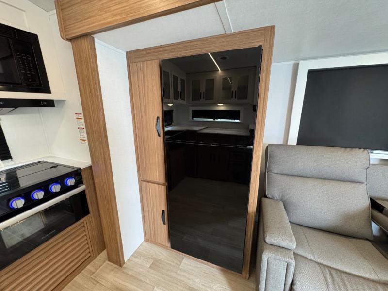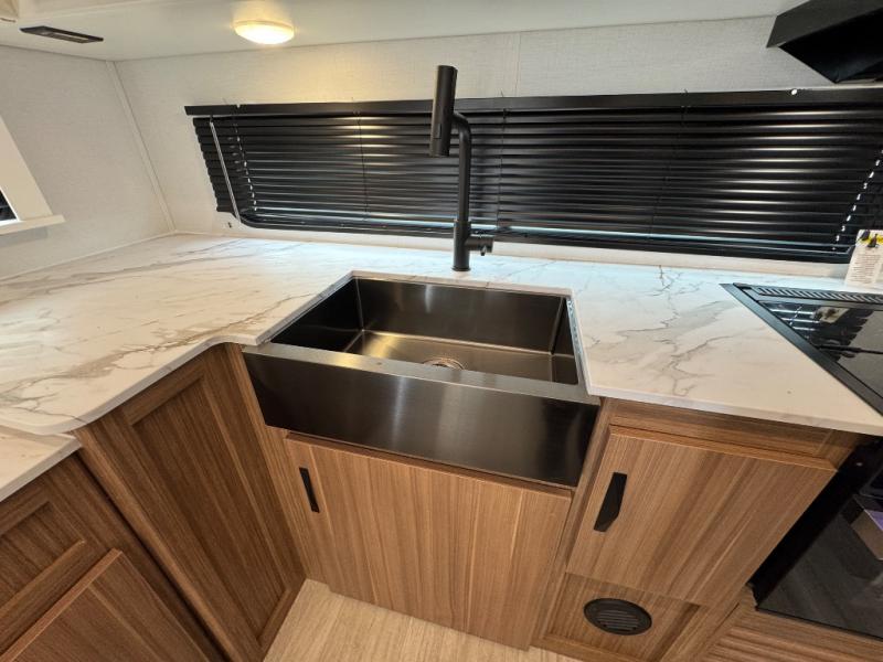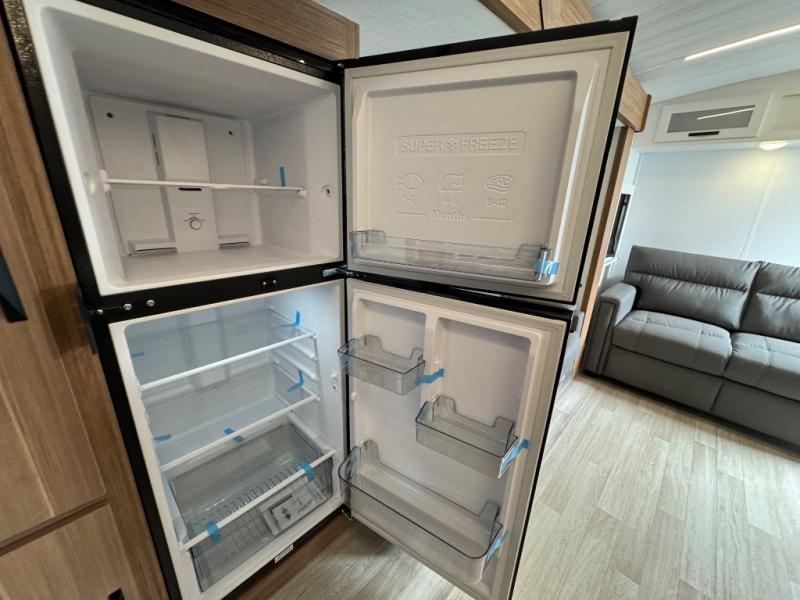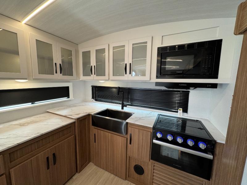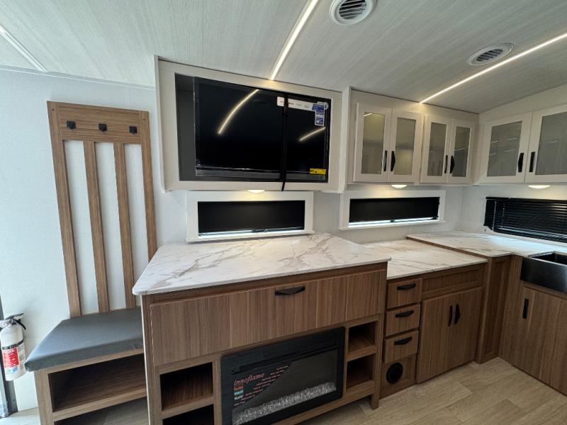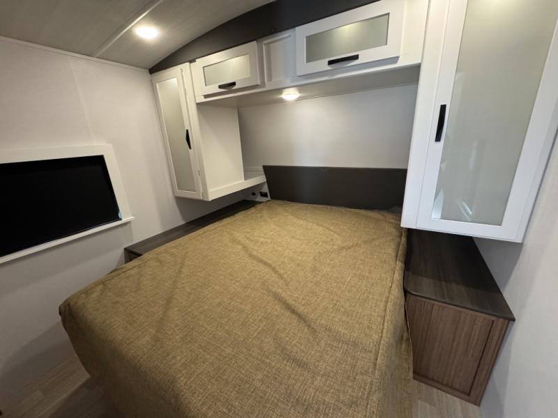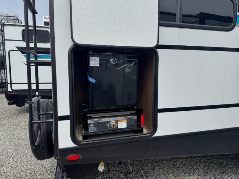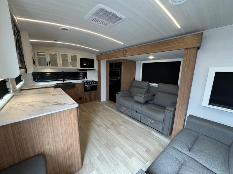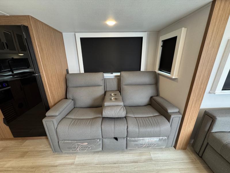You'll love every minute spent in this rear kitchen travel trailer. There is extended counter space the chef is sure to love, and the pull-out dinette table provides a place to dine together. If the weather is nice, you might want to cook on the outdoor kitchen and dine under the 19' awning. Back inside there is a tri-fold sofa and luxury cinema recliners to relax on in the evening, and the full bath will let you freshen up before bed. Speaking of bedtime; the front private bedroom will be waiting for you with a queen bed, a closet, plus dual nightstands and dual wardrobes!