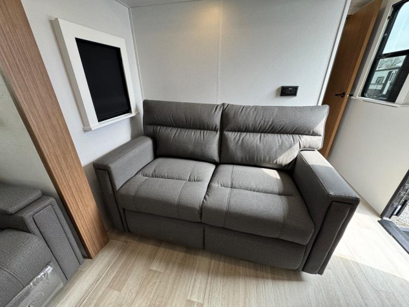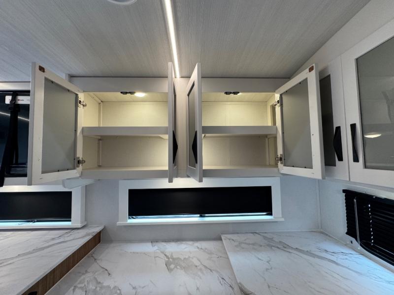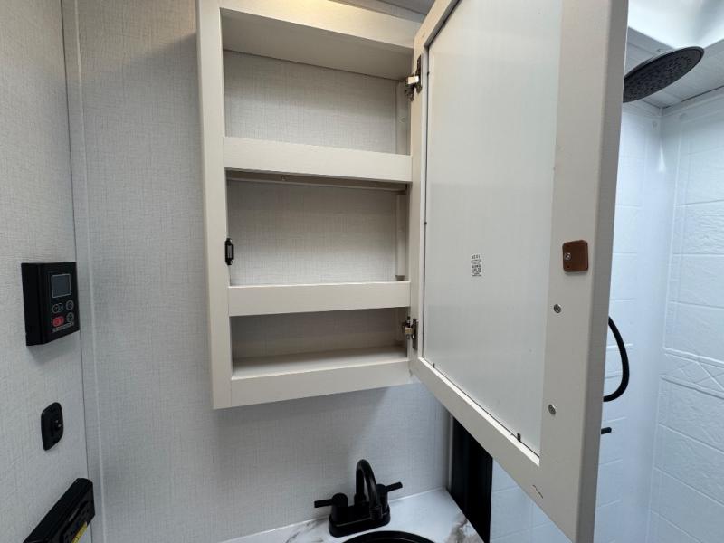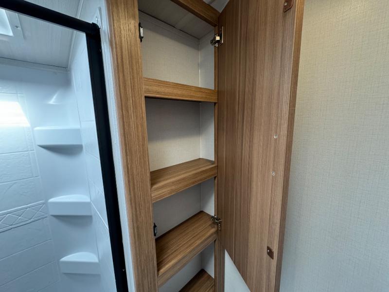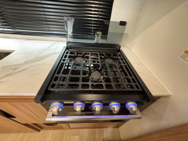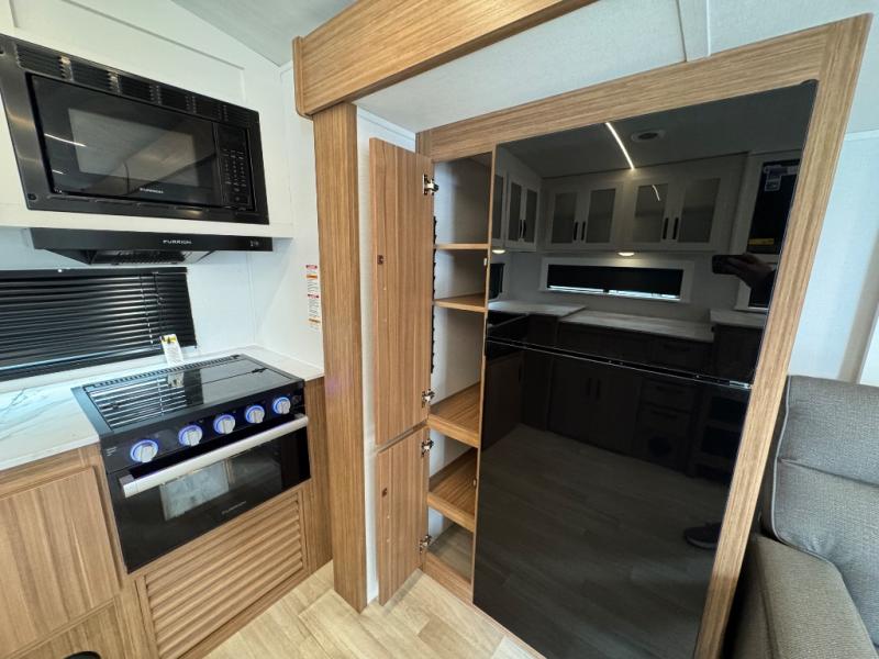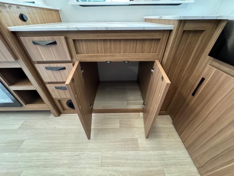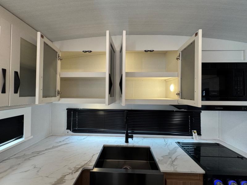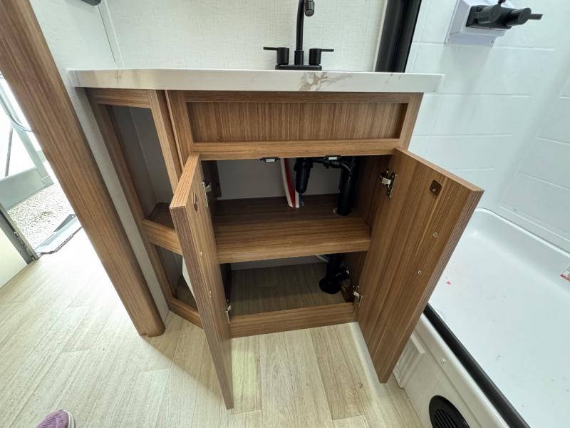 You'll love every minute spent in this rear kitchen travel trailer. There is extended counter space the chef is sure to love, and the pull-out dinette table provides a place to dine together. If the weather is nice, you might want to cook on the outdoor kitchen and dine under the 19' awning. Back inside there is a tri-fold sofa and luxury cinema recliners to relax on in the evening, and the full bath will let you freshen up before bed. Speaking of bedtime; the front private bedroom will be waiting for you with a queen bed, a closet, plus dual nightstands and dual wardrobes!