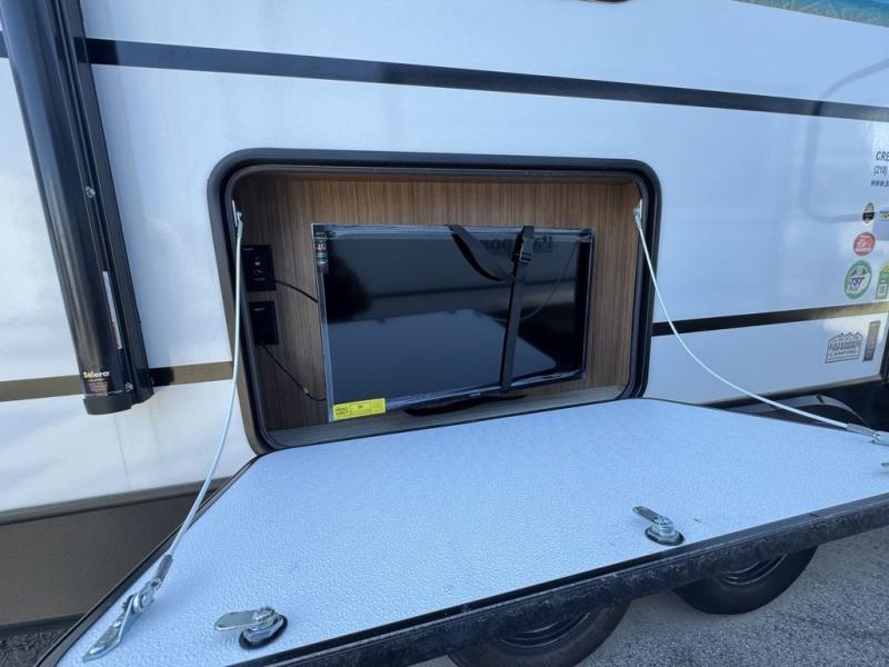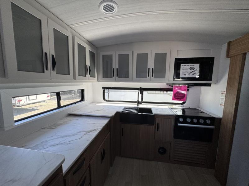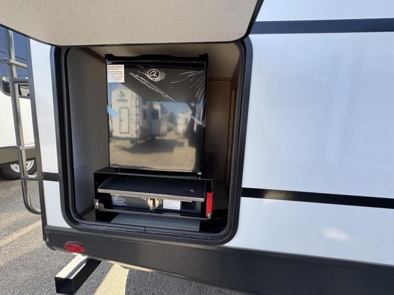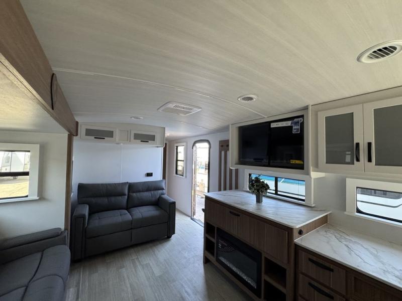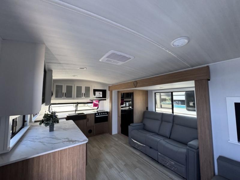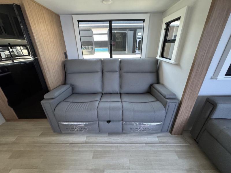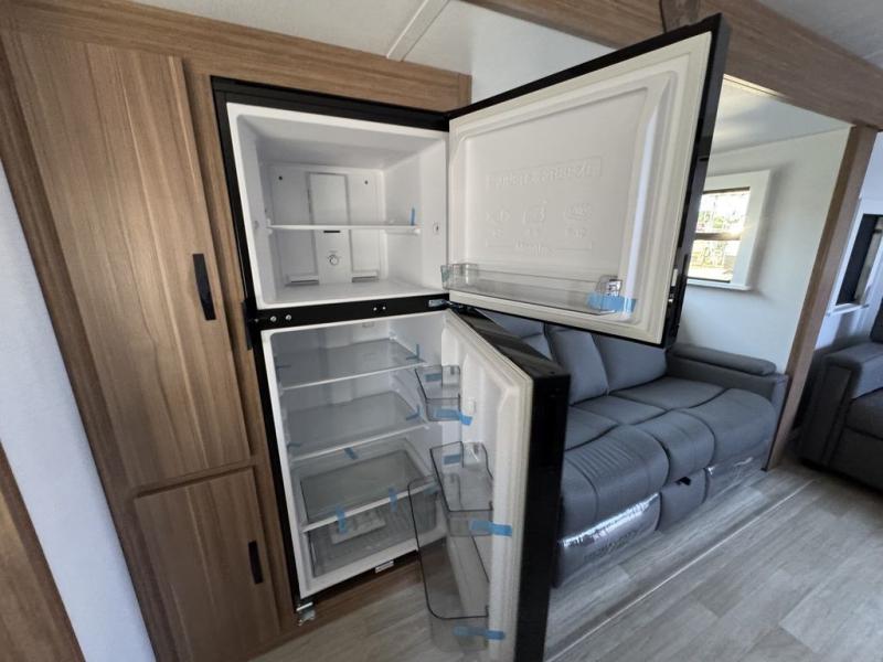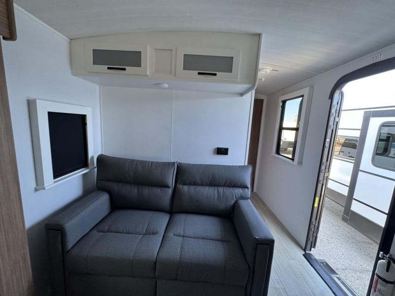 You'll love every minute spent in this rear kitchen travel trailer. There is extended counter space the chef is sure to love, and the pull-out dinette table provides a place to dine together. If the weather is nice, you might want to cook on the outdoor kitchen and dine under the 19' awning. Back inside there is a tri-fold sofa and optional luxury cinema recliners to relax on in the evening, and the full bath will let you freshen up before bed. Speaking of bedtime; the front private bedroom will be waiting for you with a queen bed, a closet, plus dual nightstands and dual wardrobes!