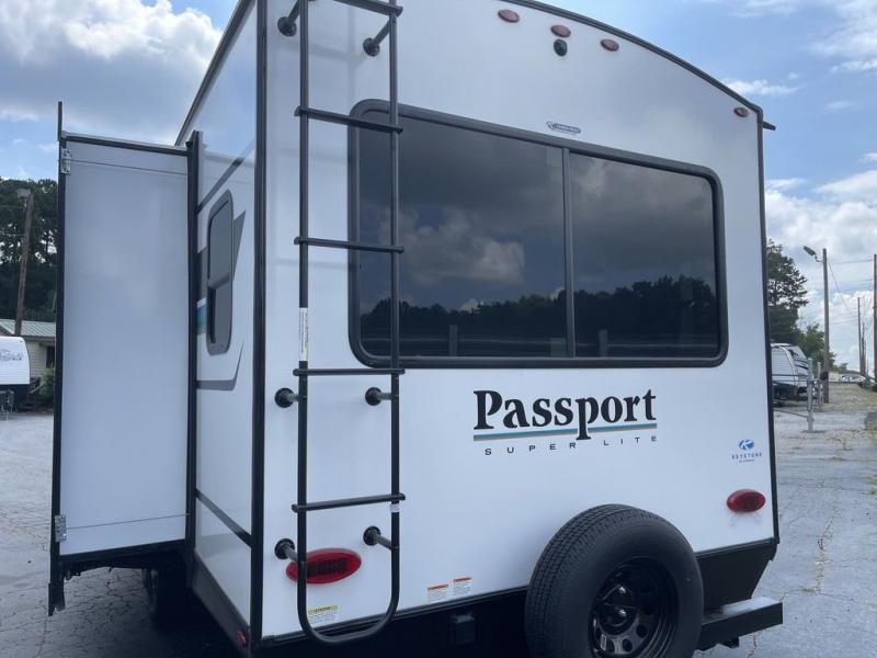 With any Keystone Passport Super Lite travel trailer you will enjoy lightweight towing and lots of interior comforts! The power tongue jack lets you hitch up at the drop of a hat, and the Dexter torsion axle rubber ride suspension will make towing easier than ever. You will appreciate having power stabilizer jacks for quick setup and an exterior convenience center to monitor tank levels. These trailers are constructed with a seamless, laminated and gel-coated filon exterior, 80% tinted safety glass windows, and a one-piece polypropylene underbelly. The interior will have you feeling right at home with residential durable Beauflor vinyl flooring, deluxe night shades, LED lighting throughout, and seamless kitchen countertops to name a few comforts.