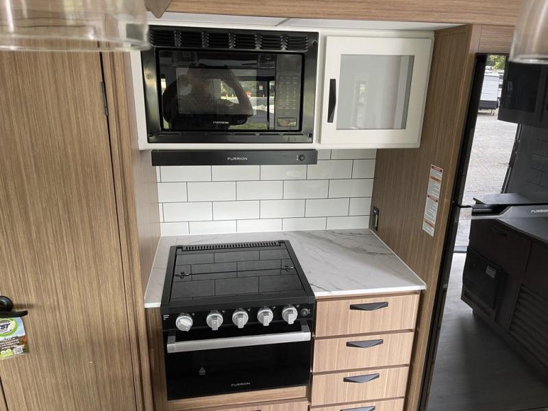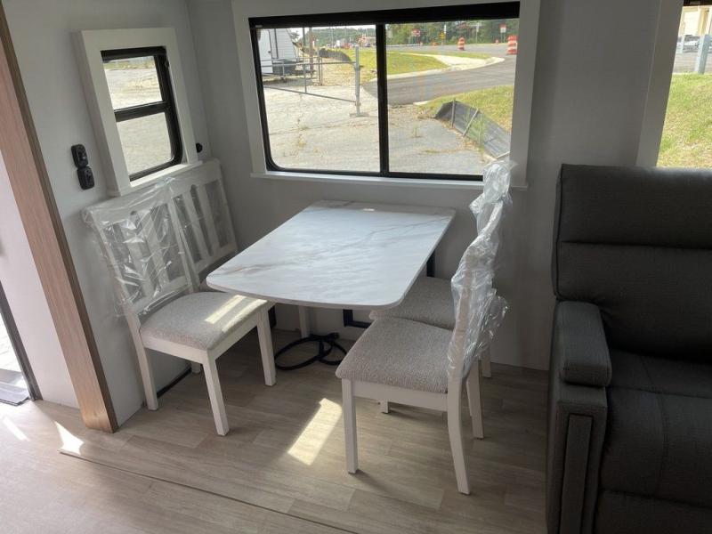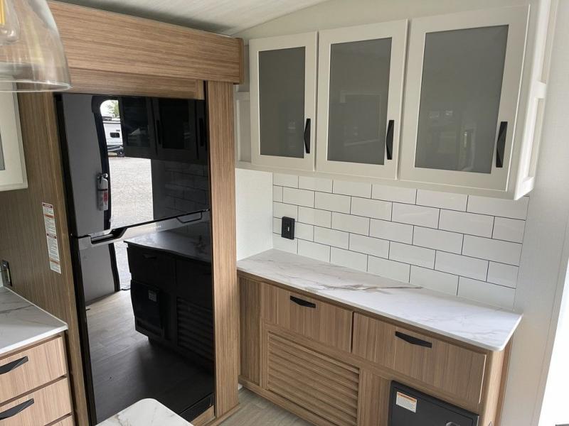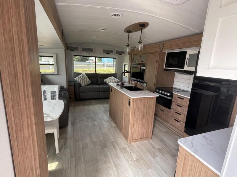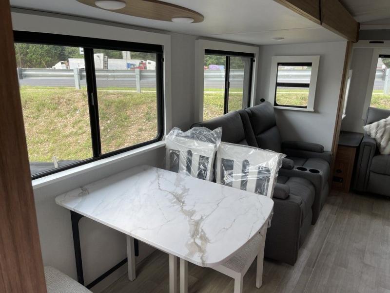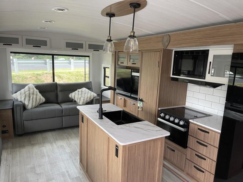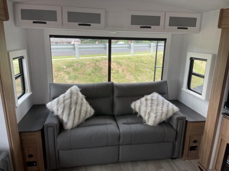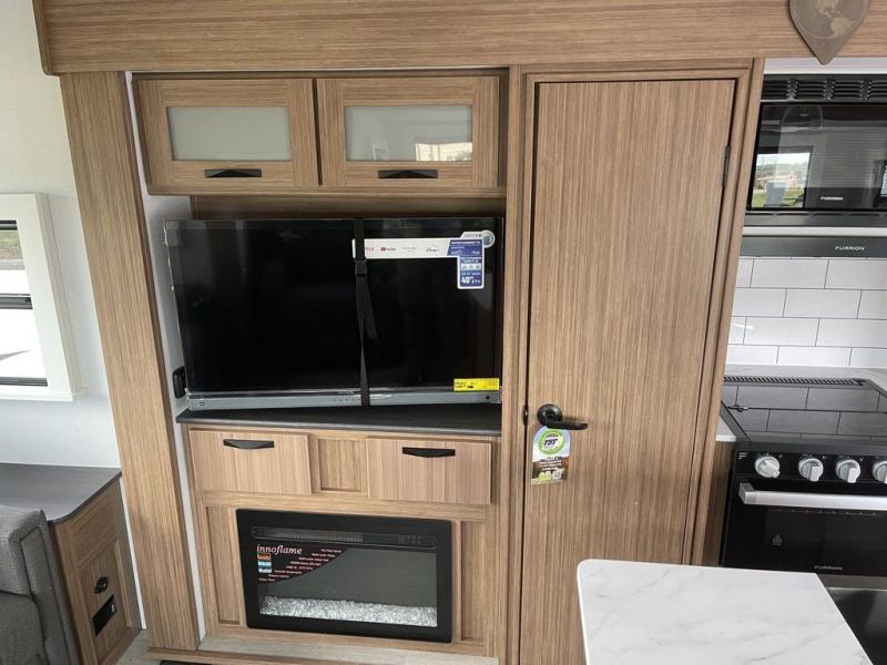 This is the travel trailer you've been searching for with a spacious interior, a front private bedroom, and a kitchen island for more counter space! Your crew can relax on the tri-fold sofa sleeper and luxury cinema theater seating, or play a game at the Do-More dinette table. There is also an entertainment center and a fireplace to make this space feel more like home. A full kitchen, complete with a large pantry and 12V refrigerator will keep the chef of your group happy, and the full bath will let everyone clean up before bed. When it's time to call it a night, the front bedroom with a queen bed will be waiting for you, while your guests sleep on the sofa and dinette.