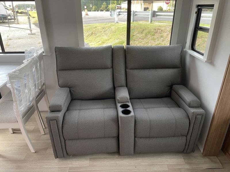 Rear entertainment with opposing slides. Island kitchen with ample storage space and large pantry, shirt closets and floor to ceiling closet. Theater seating across from entertainment center with smart tv and electric fireplace. Tri fold sofa at rear with lot's of windows. Private master with walk around 60x80 queen, shirt closets and floor to ceiling closet. Side aisle bath with walk in shower.