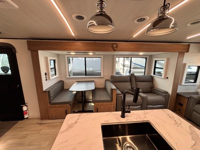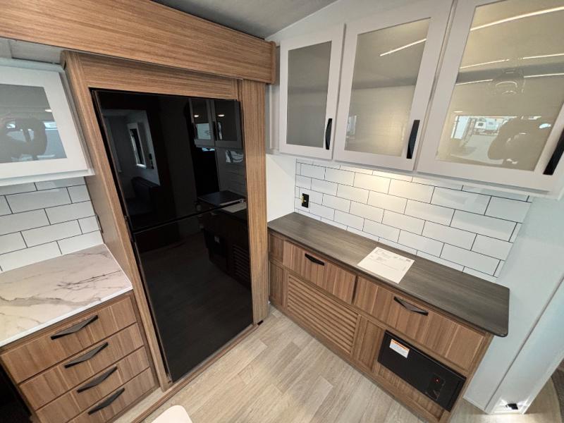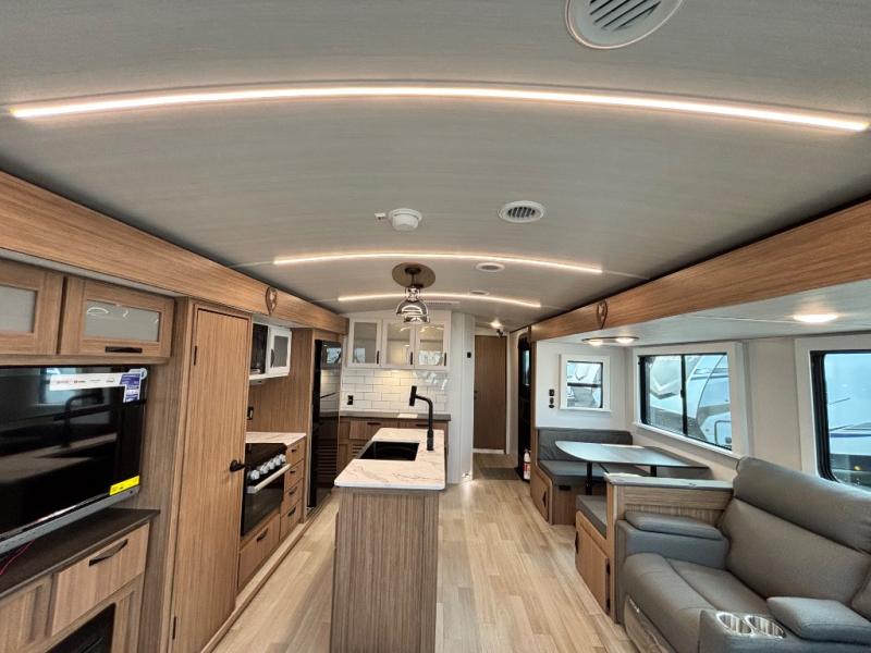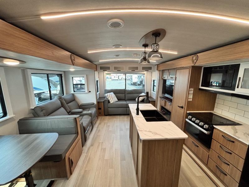 This is the travel trailer you've been searching for with a spacious interior, a front private bedroom, and a kitchen island for more counter space! Your crew can relax on the tri-fold sofa sleeper and luxury cinema theater seating, or play a game at the Do-More dinette table. There is also an entertainment center and a fireplace to make this space feel more like home. A full kitchen, complete with a large pantry and 12V refrigerator will keep the chef of your group happy, and the full bath will let everyone clean up before bed. When it's time to call it a night, the front bedroom with a queen bed will be waiting for you, while your guests sleep on the sofa and dinette.