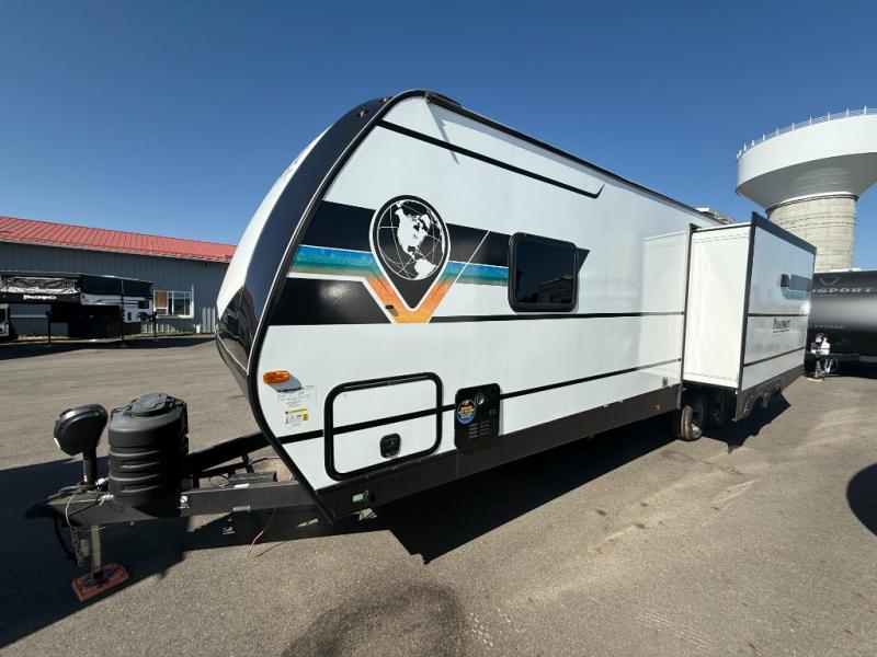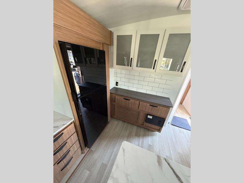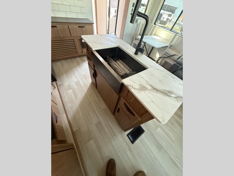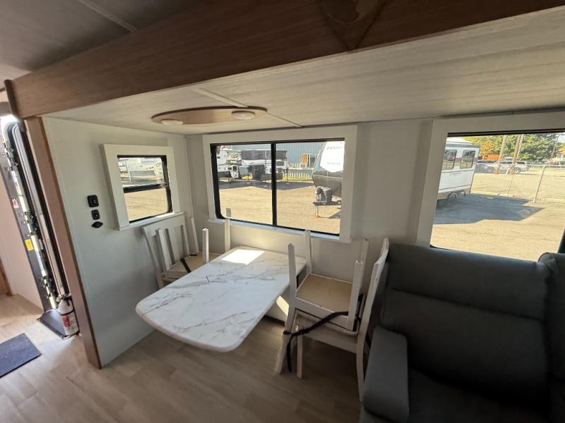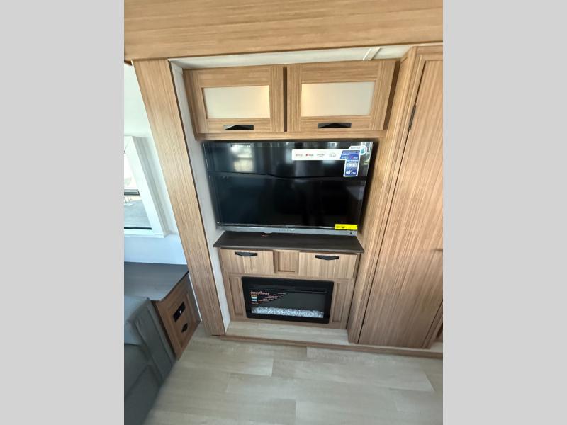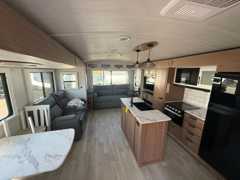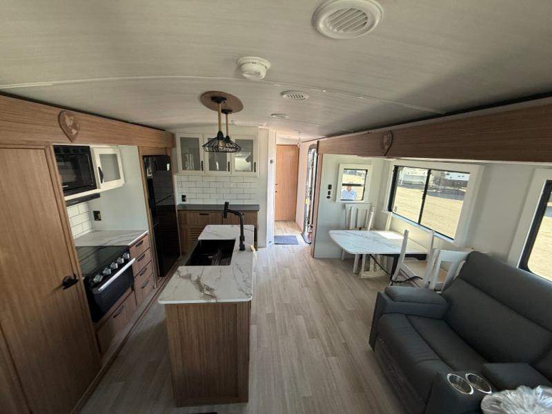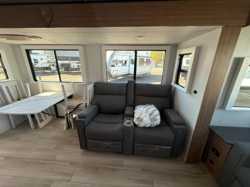 This is the travel trailer you've been searching for with a spacious interior, a front private bedroom, and a kitchen island for more counter space! Your crew can relax on the tri-fold sofa sleeper and luxury cinema theater seating, or play a game at the Do-More dinette table. There is also an entertainment center and a fireplace to make this space feel more like home. A full kitchen, complete with a large pantry and 12V refrigerator will keep the chef of your group happy, and the full bath will let everyone clean up before bed. When it's time to call it a night, the front bedroom with a queen bed will be waiting for you, while your guests sleep on the sofa and dinette.