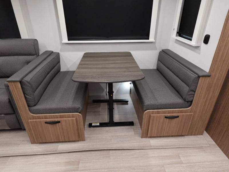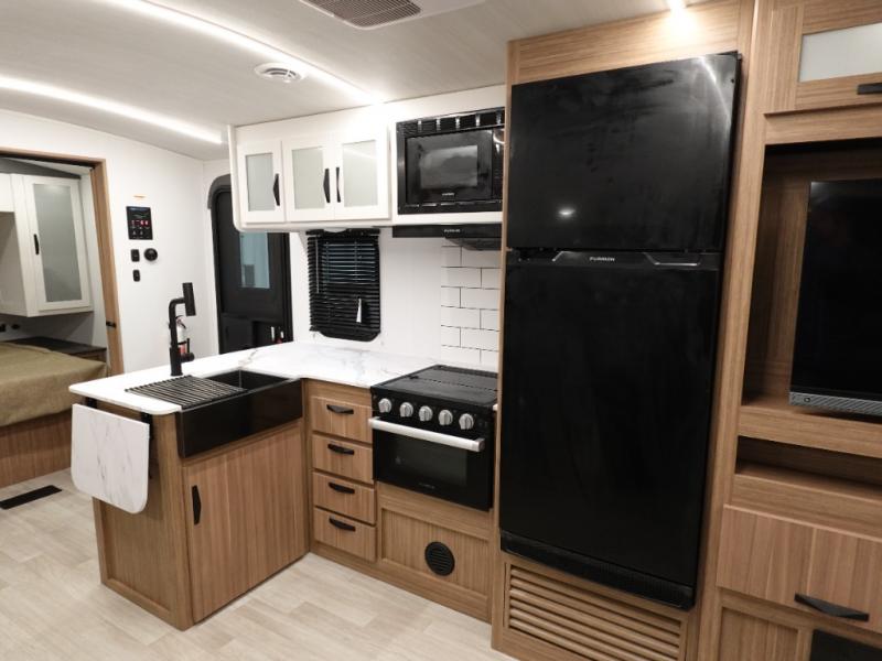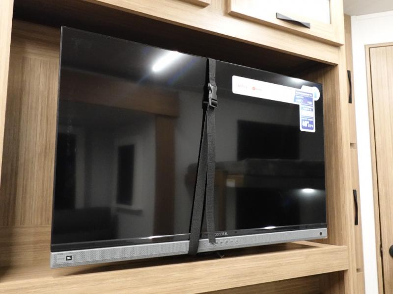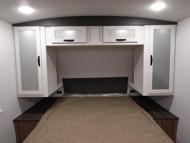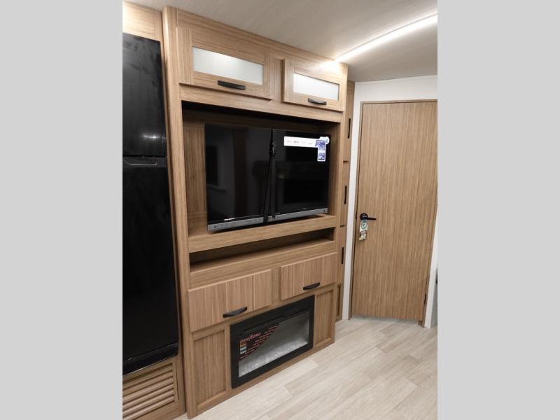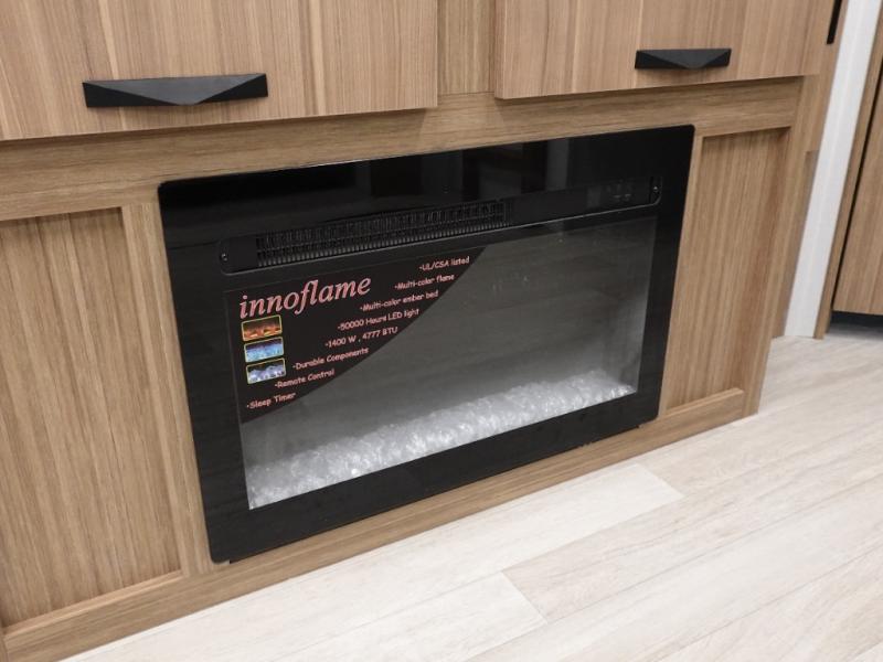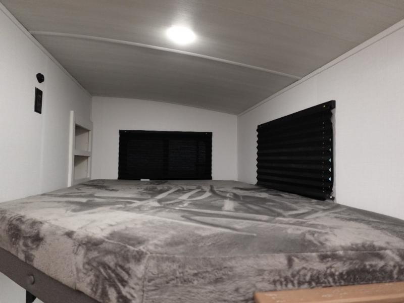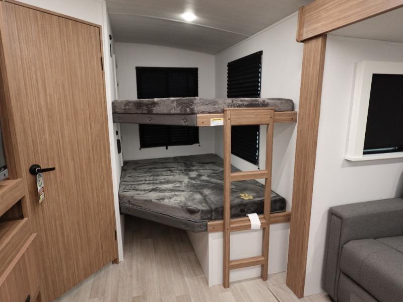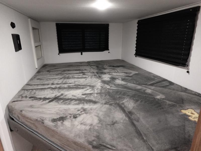 Camping at your favorite campground in this bunkhouse model will be just what the doctor ordered! One of the bunks is a flip-up bunk for added storage, and the full bath with its own exterior entry door is close by for easy nighttime use. The combined living area and kitchen is made spacious by the large slide out, and here you can relax on the tri-fold sofa and Do-more dinette table. There is also an entertainment center with a fireplace to make this space feel a little more like home. The chef of your group can choose to cook indoors or outdoors on the exterior kitchen, and there is a 21' awning for shade. This unit also includes a front private bedroom with a queen bed and dual wardrobes to keep your things tidy.