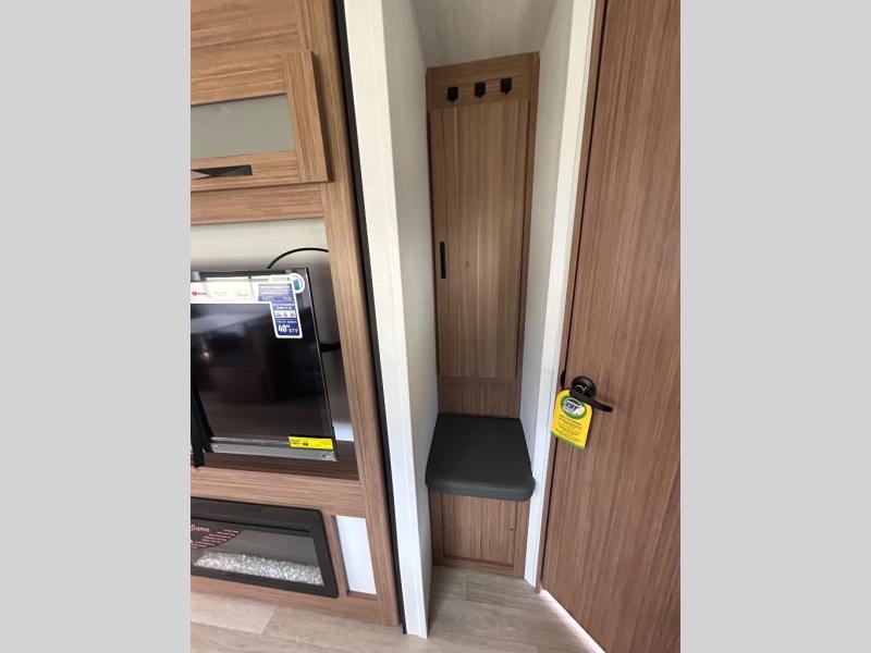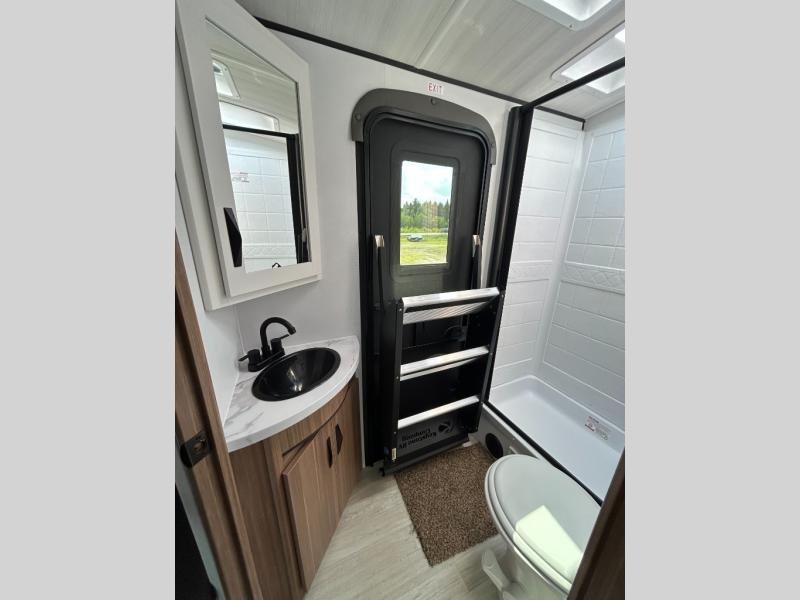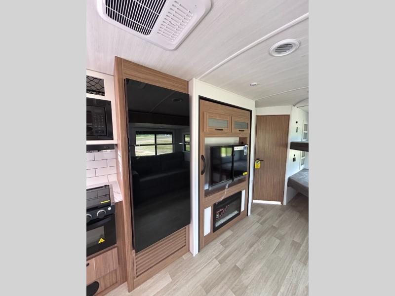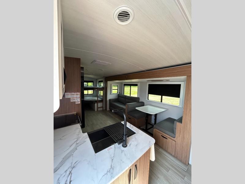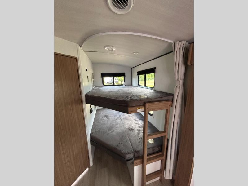 Camping at your favorite campground in this bunkhouse model will be just what the doctor ordered! One of the bunks is a flip-up bunk for added storage, and the full bath with its own exterior entry door is close by for easy nighttime use. The combined living area and kitchen is made spacious by the large slide out, and here you can relax on the tri-fold sofa and Do-more dinette table. There is also an entertainment center with a fireplace to make this space feel a little more like home. The chef of your group can choose to cook indoors or outdoors on the exterior kitchen, and there is a 21' awning for shade. This unit also includes a front private bedroom with a queen bed and dual wardrobes to keep your things tidy.