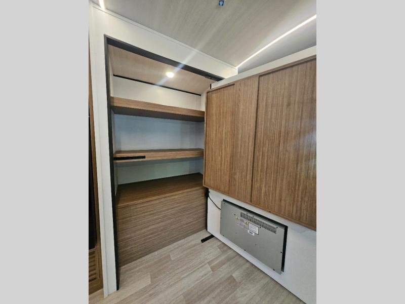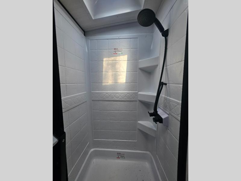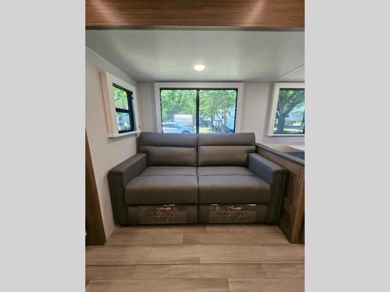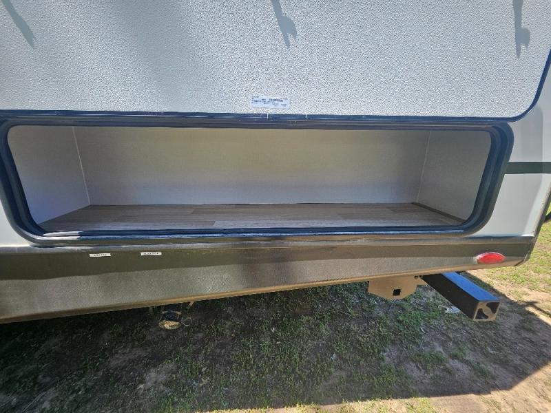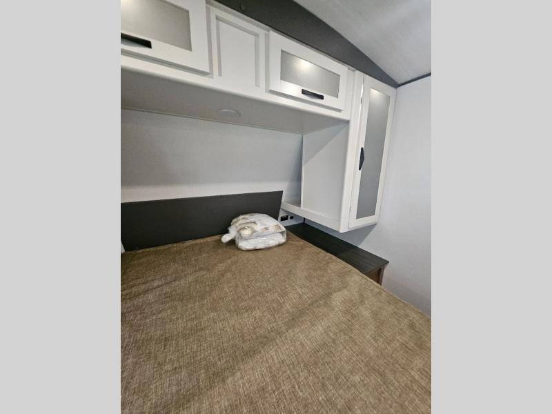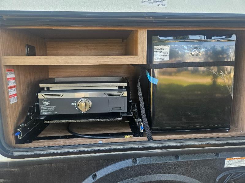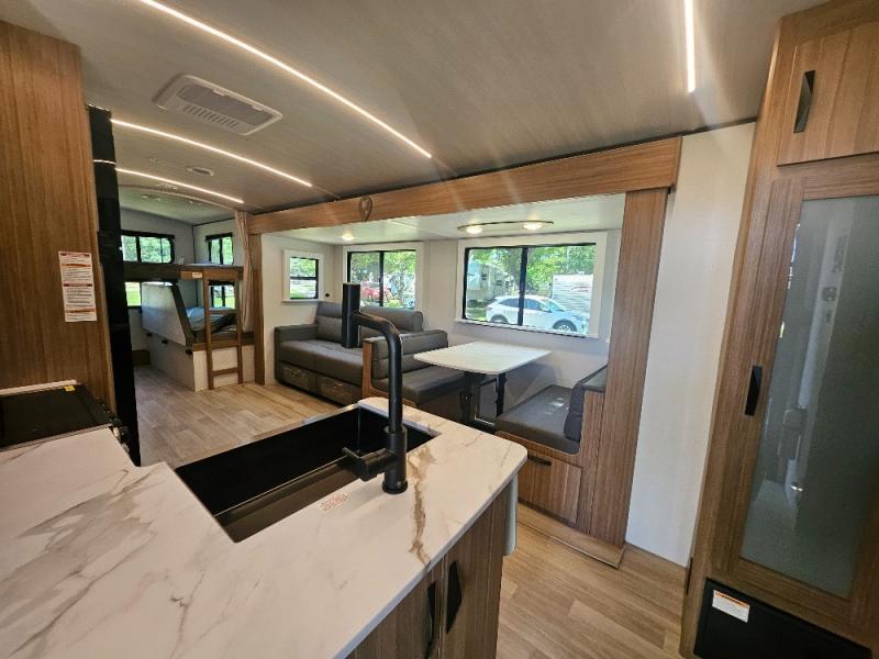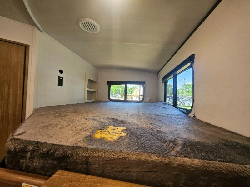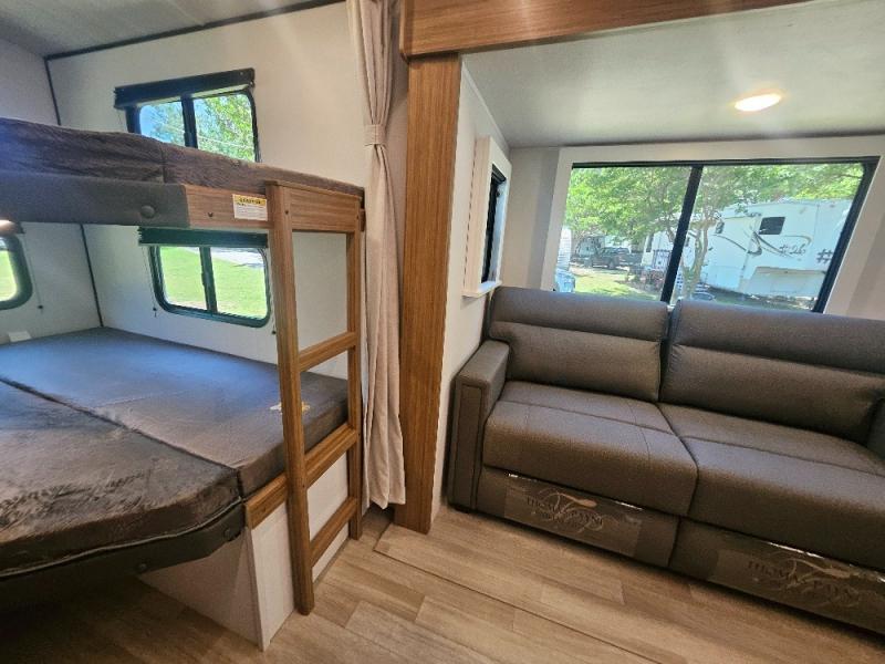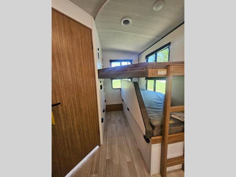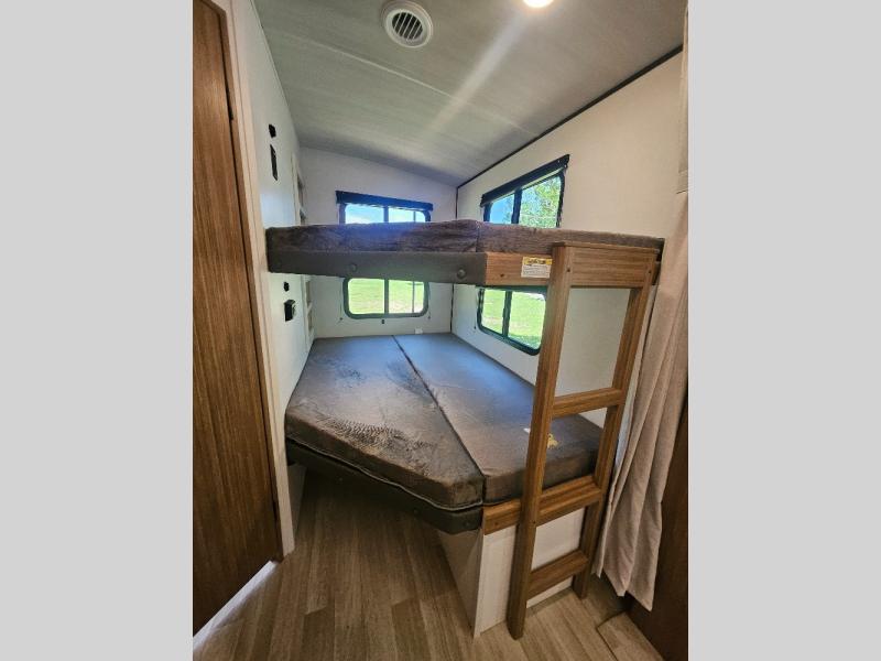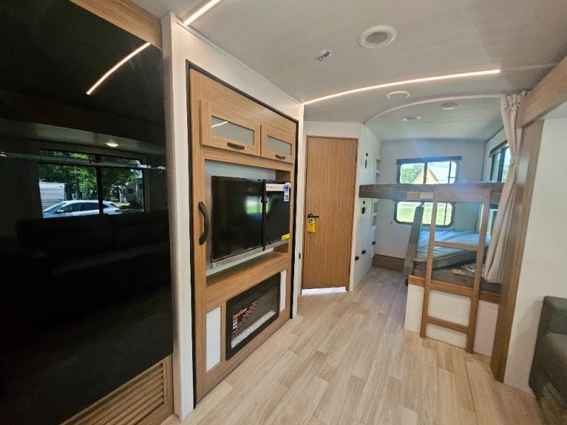Camping at your favorite campground in this bunkhouse model will be just what the doctor ordered! One of the bunks is a flip-up bunk for added storage, and the full bath with its own exterior entry door is close by for easy nighttime use. The combined living area and kitchen is made spacious by the large slide out, and here you can relax on the tri-fold sofa and Do-more dinette table. There is also an entertainment center with a fireplace to make this space feel a little more like home. The chef of your group can choose to cook indoors or outdoors on the exterior kitchen, and there is a 21' awning for shade. This unit also includes a front private bedroom with a queen bed and dual wardrobes to keep your things tidy.