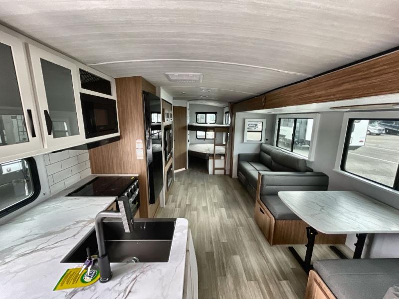 Camping at your favorite campground in this bunkhouse model will be just what the doctor ordered! One of the bunks is a flip-up bunk for added storage, and the full bath with its own exterior entry door is close by for easy nighttime use. The combined living area and kitchen is made spacious by the large slide out, and here you can relax on the tri-fold sofa and Do-more dinette table. There is also an entertainment center with a fireplace to make this space feel a little more like home. The chef of your group can choose to cook indoors or outdoors on the exterior kitchen, and there is a 21' awning for shade. This unit also includes a front private bedroom with a queen bed and dual wardrobes to keep your things tidy.