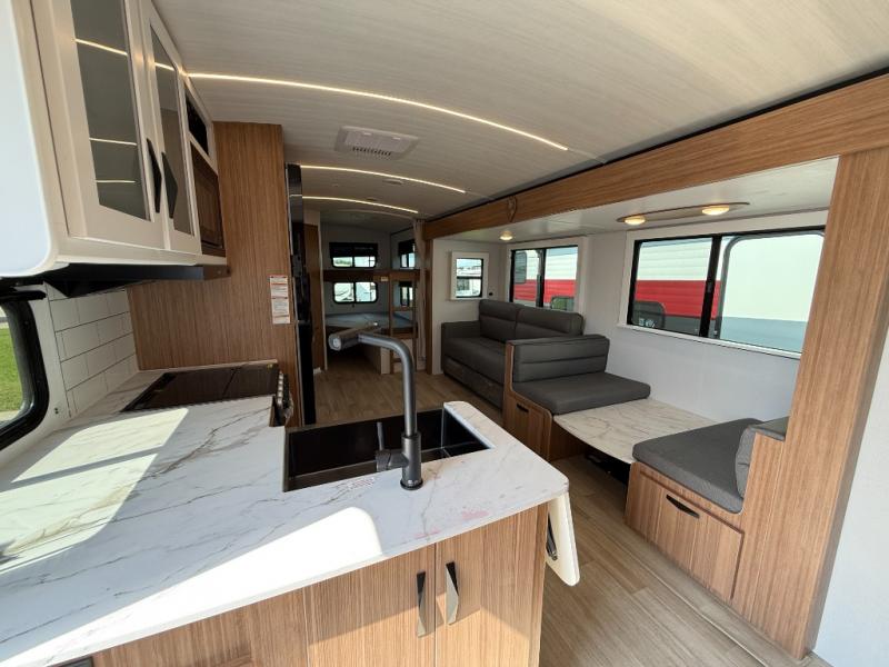 With any Keystone Passport Super Lite travel trailer you will enjoy lightweight towing and lots of interior comforts! The power tongue jack lets you hitch up at the drop of a hat, and the Dexter torsion axle rubber ride suspension will make towing easier than ever. You will appreciate having power stabilizer jacks for quick setup and an exterior convenience center to monitor tank levels. These trailers are constructed with a seamless, laminated and gel-coated filon exterior, 80% tinted safety glass windows, and a one-piece polypropylene underbelly. The interior will have you feeling right at home with residential durable Beauflor vinyl flooring, deluxe night shades, LED lighting throughout, and seamless kitchen countertops to name a few comforts.