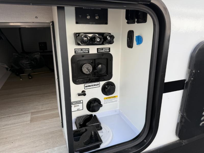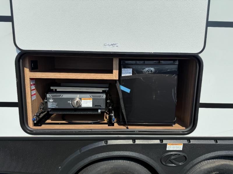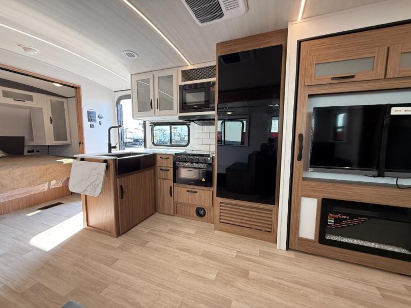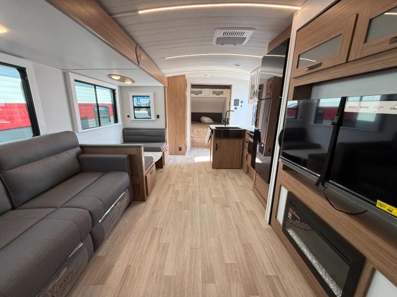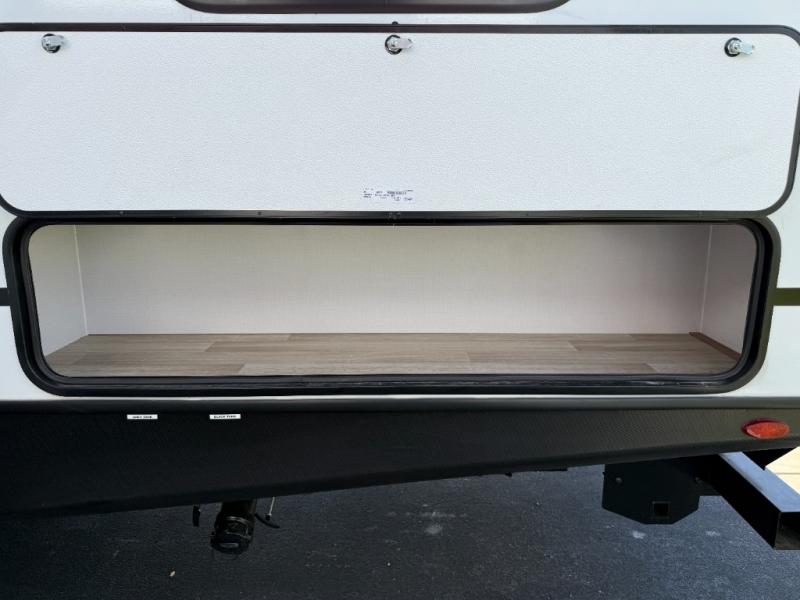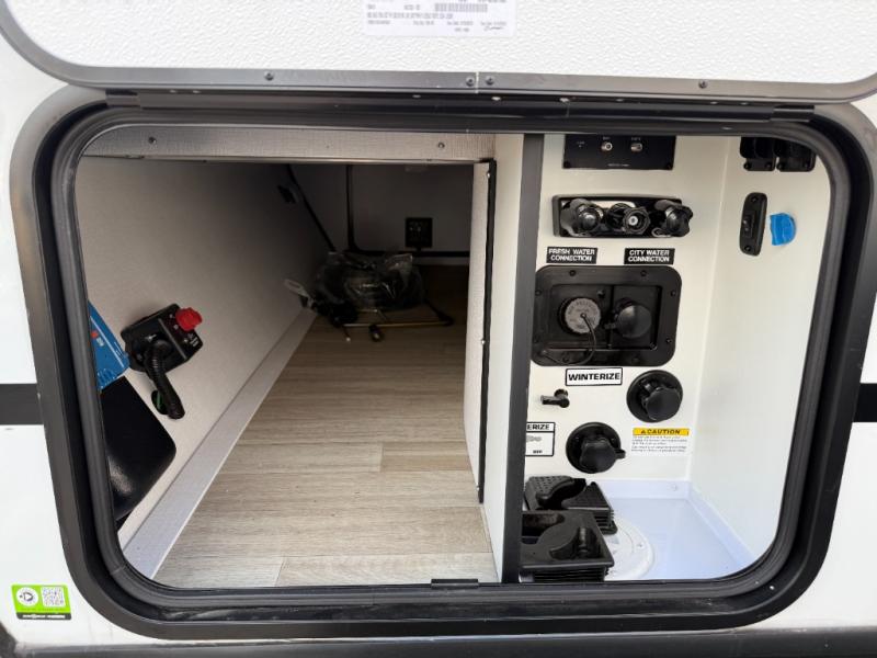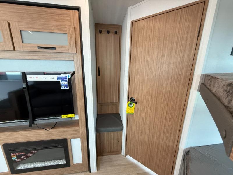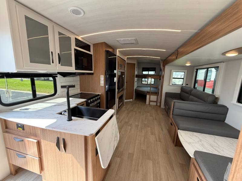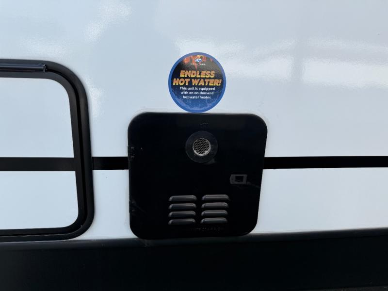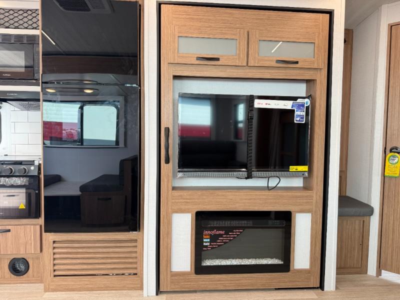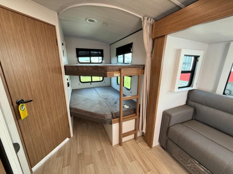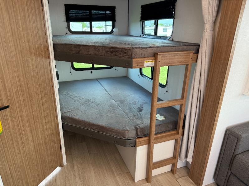 Camping at your favorite campground in this bunkhouse model will be just what the doctor ordered! One of the bunks is a flip-up bunk for added storage, and the full bath with its own exterior entry door is close by for easy nighttime use. The combined living area and kitchen is made spacious by the large slide out, and here you can relax on the tri-fold sofa and Do-More Dinette. There is also an entertainment center with a fireplace to make this space feel a little more like home. The chef of your group can choose to cook indoors or outdoors on the exterior kitchen with a griddle, and there is a 21' awning for shade. This unit also includes a front private bedroom with a queen bed and dual wardrobes to keep your things tidy.