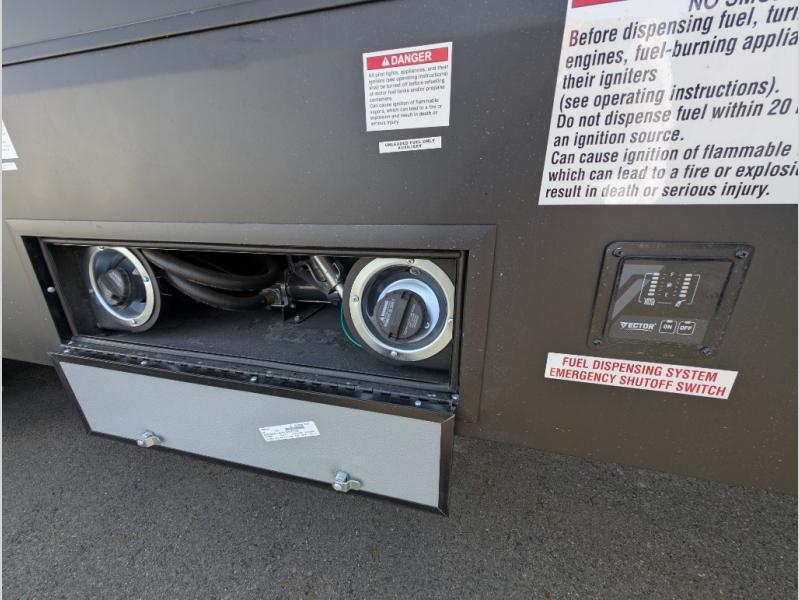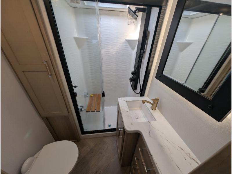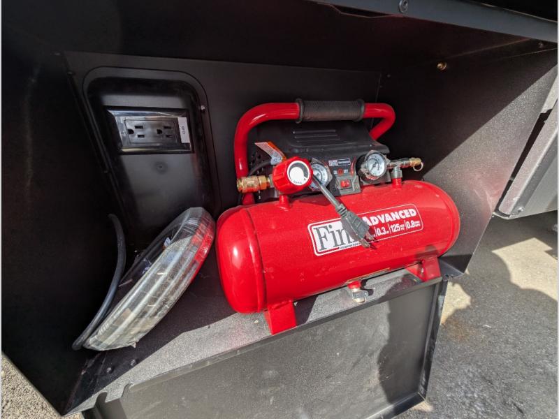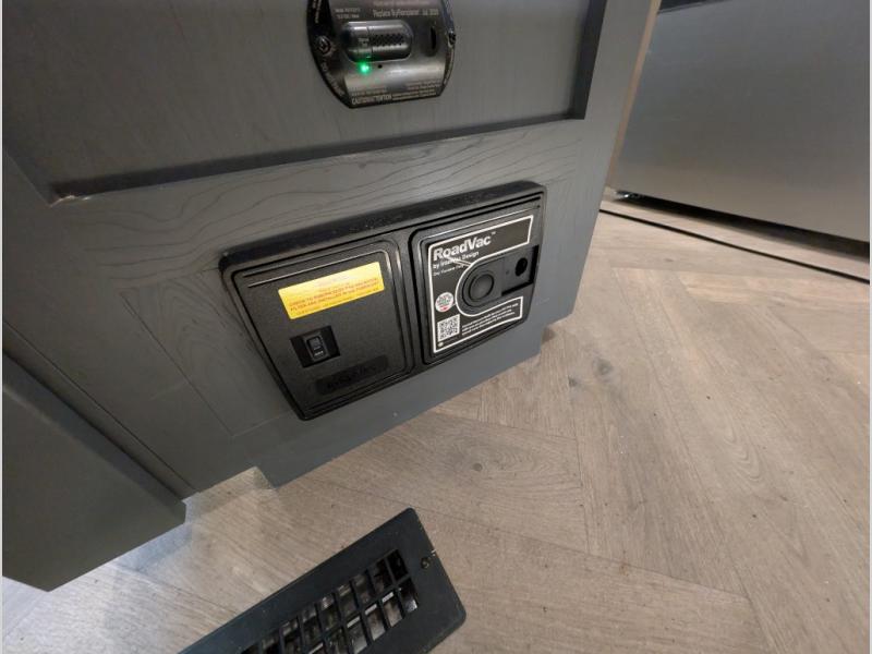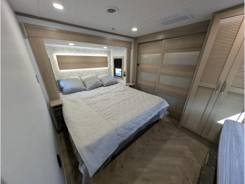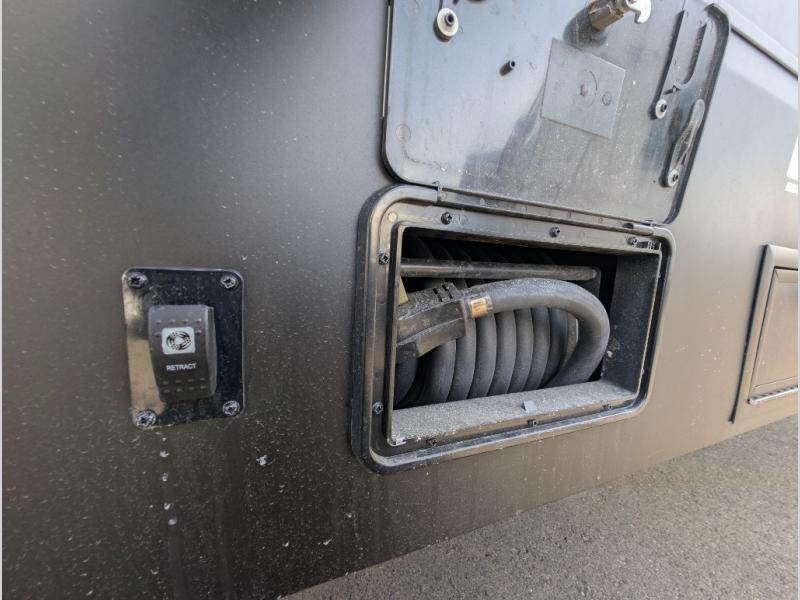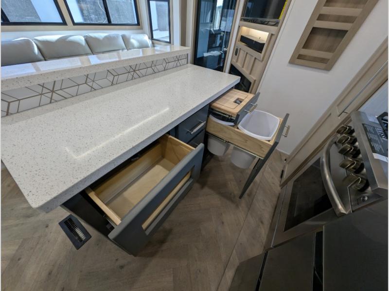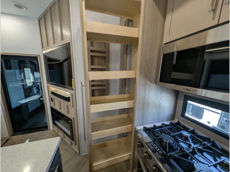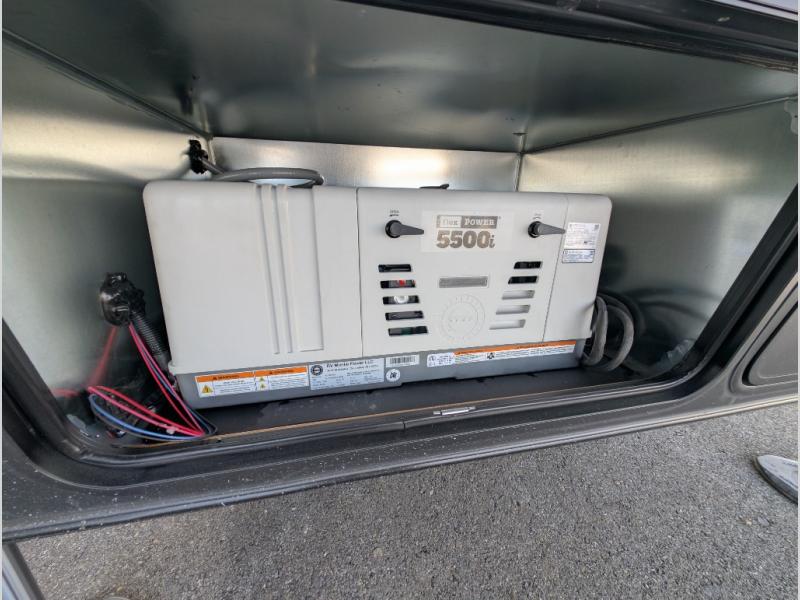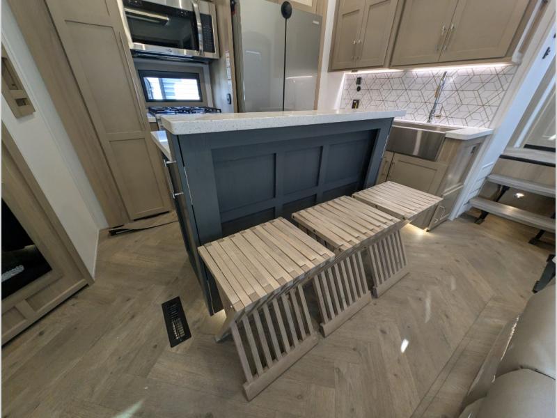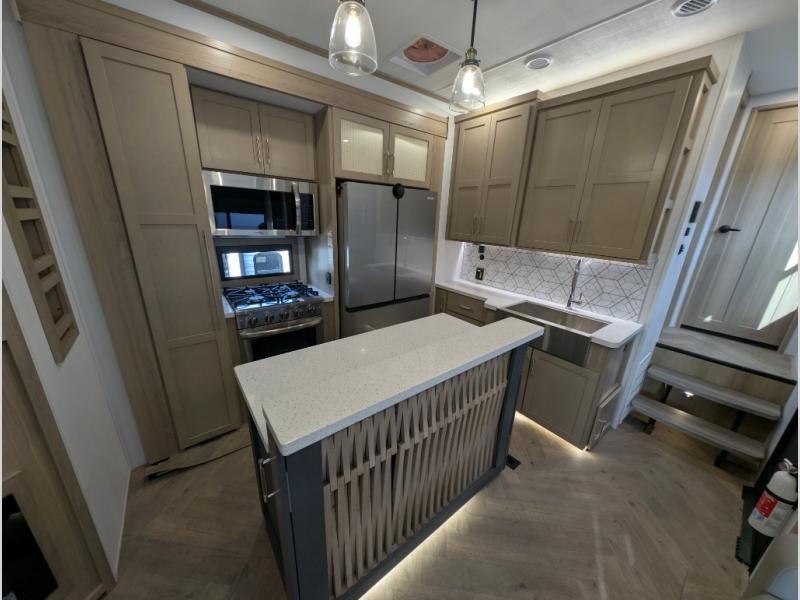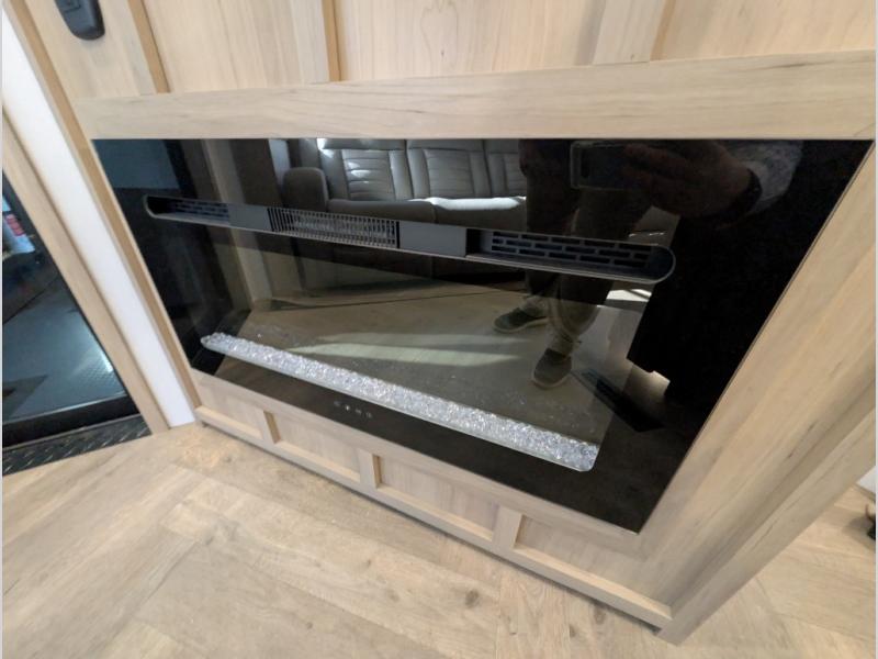 Start camping in luxury with this decked out toy hauler fifth wheel RV! The front private bedroom has a king bed slide for more interior space, a Vizio Smart LED TV, a front large wardrobe, plus washer and dryer prep. Freshen up each morning in the full bathroom with the fiberglass one-piece shower then head to the kitchen to fry up some eggs on the four burner cooktop. Grab a cold cup of orange juice from the 16.5 cu. ft. 12 volt refrigerator and enjoy it along with the eggs at the kitchen island which includes two flip-up bar stools. The 4-seat recliner slide is conveniently across from the entertainment center with a 55" Vizio Smart LED TV and fireplace. As you head into the 11' garage area, you will notice a loft with a twin bed, dual opposing sofas with a table in between below an electric bed, and a half bathroom, plus one of the dual entry doors to the unit!