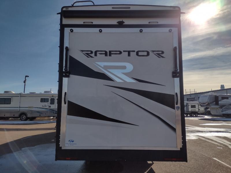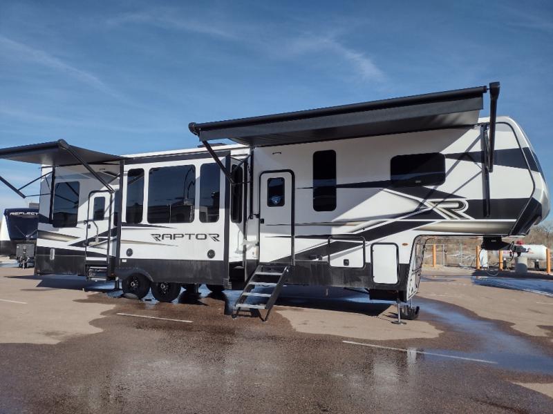 Experience a breath of fresh air with one of these Keystone RV Raptor fifth wheel toy haulers! Their rugged construction consists of a one-piece Alpha Super Flex TPO roof membrane, Dyna Span floor decking, and 5,000 lb. frame-welded tie- downs to keep your toys in place as you travel. Some unexpected conveniences you will appreciate include an Omni-Chill A/C system to keep you cool on those hot summer days, a Furrion backup camera and Hitch Vision to prevent damages, and a Generation 3 iN-Command smart automation system with Global Connect to make life easier. There is also designer style vinyl flooring throughout, along with hardwood ceiling treatment with LED accent lighting, beach wood and white cabinetry, and many more interior comforts!