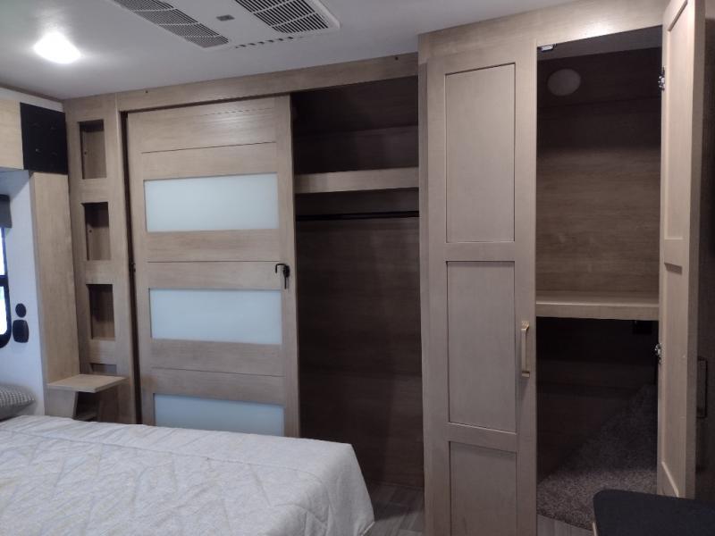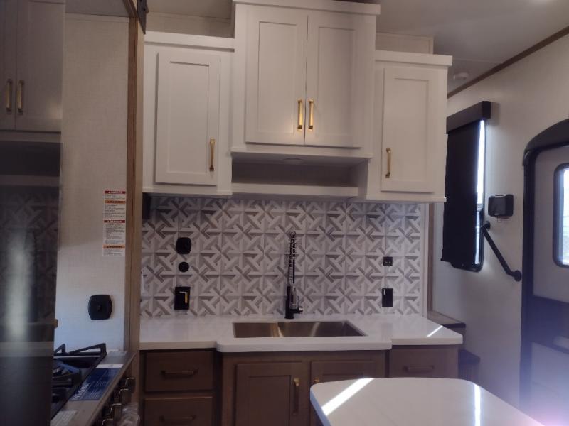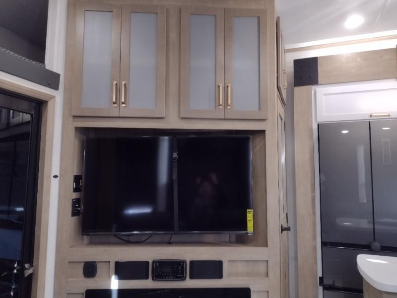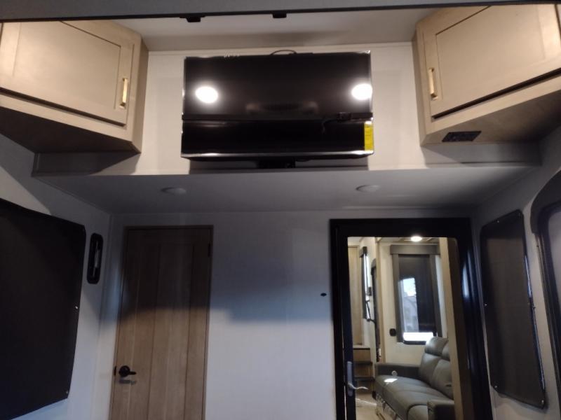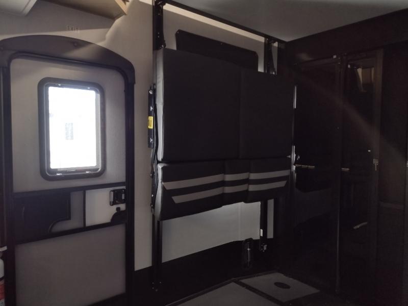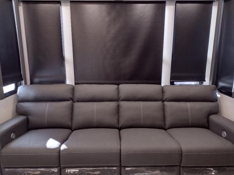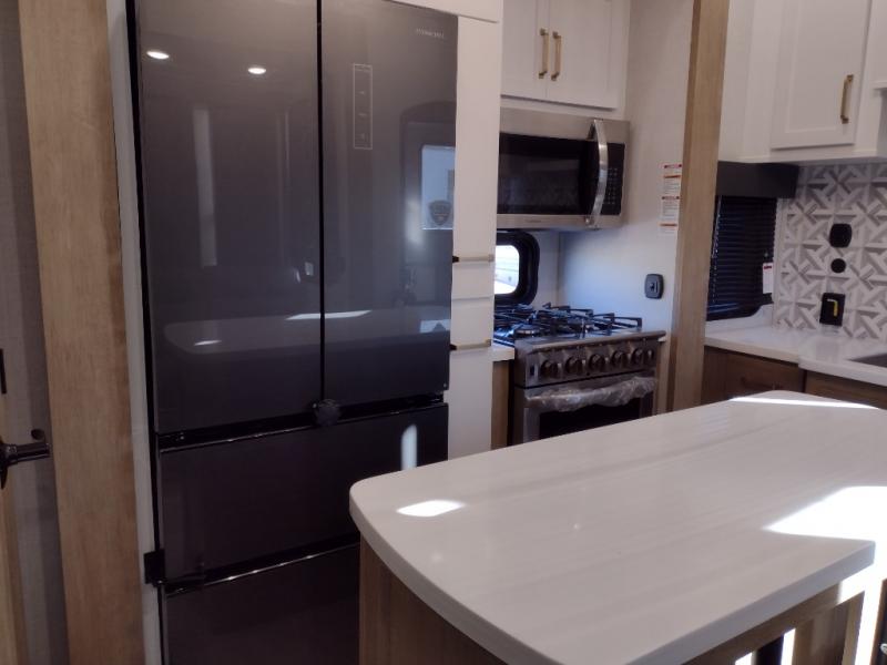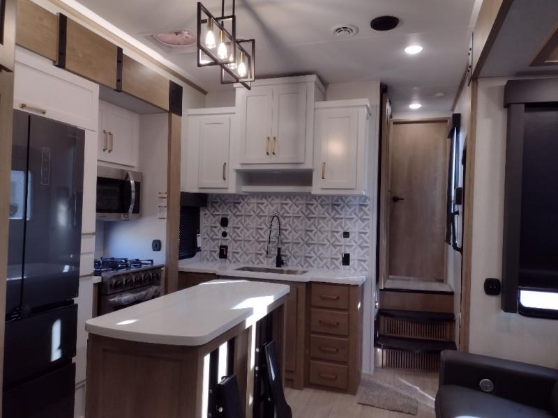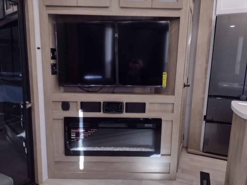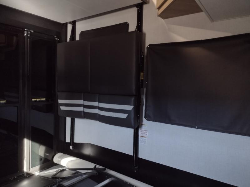 Start camping in luxury with this decked out toy hauler! The front private bedroom has a king bed slide for more interior space, a Vizio Smart LED TV, a front large wardrobe, plus washer and dryer prep. Freshen up each morning in the full bathroom with the fiberglass one-piece shower then head to the kitchen to fry up some eggs on the four burner cooktop. Grab a cold cup of orange juice from the 16.5 cu. ft. 12 volt refrigerator and enjoy it along with the eggs at the kitchen island which includes two flip-up bar stools. The 4-seat recliner slide is conveniently across from the entertainment center with a 55" Vizio Smart LED TV and fireplace. As you head into the 11' garage area, you will notice a loft with a twin bed, dual opposing sofas with a table in between below an electric bed, and a half bathroom, plus one of the dual entry doors to the unit!