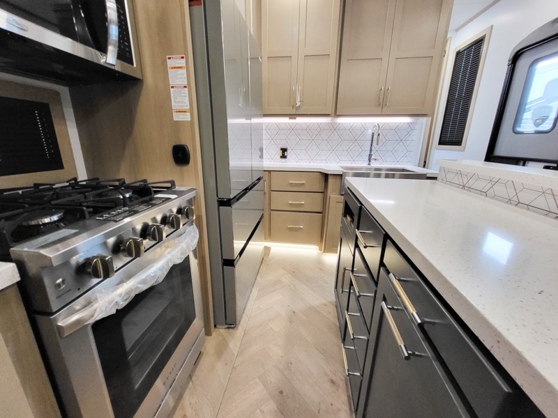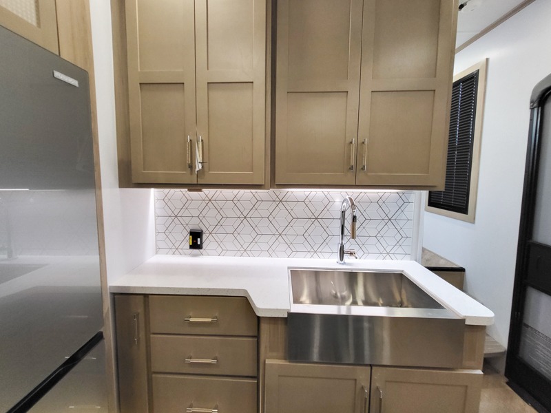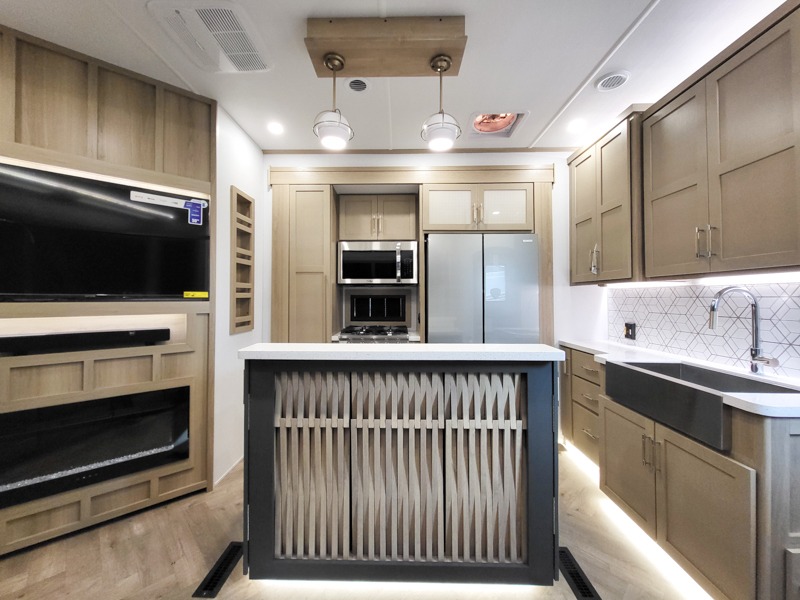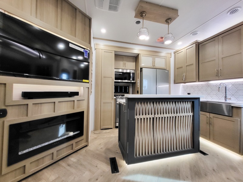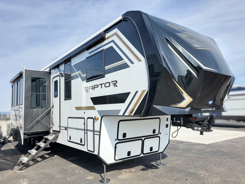 Experience a breath of fresh air with one of these Keystone RV Raptor fifth wheel toy haulers! Their rugged construction consists of a one-piece Alpha Super Flex TPO roof membrane, Dyna Span floor decking, and 5,000 lb. frame-welded tie- downs to keep your toys in place as you travel. Some unexpected conveniences you will appreciate include an Omni-Chill A/C system to keep you cool on those hot summer days, a Furrion backup camera, MaxTurn™ technology with a Helux™ pin box, and a Generation 3 iN-Command smart automation system with Global Connect to make life easier. There is also designer style vinyl flooring throughout, along with hardwood ceiling treatment with LED accent lighting, beach wood and white cabinetry, and many more interior comforts!