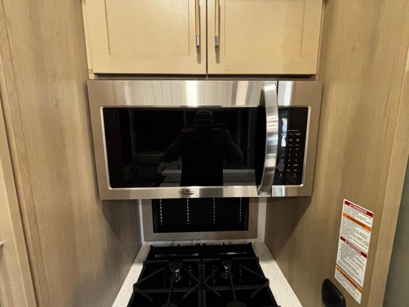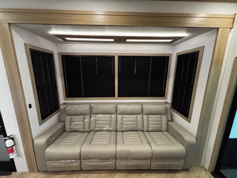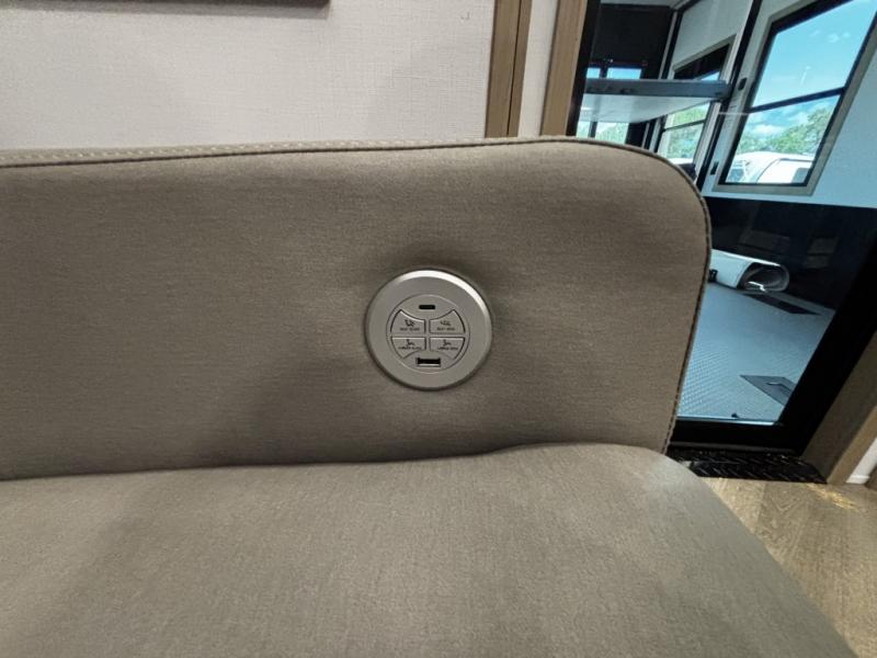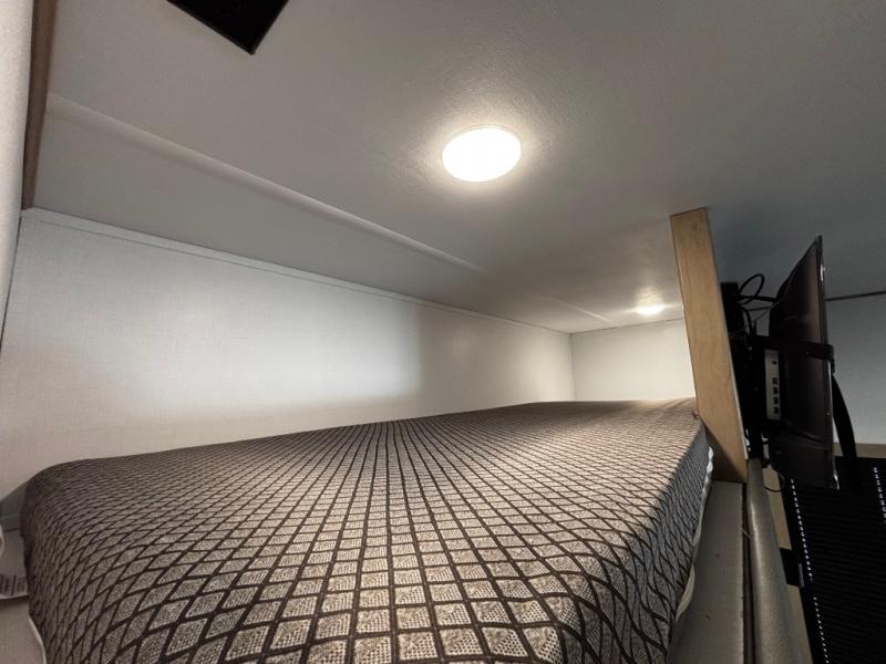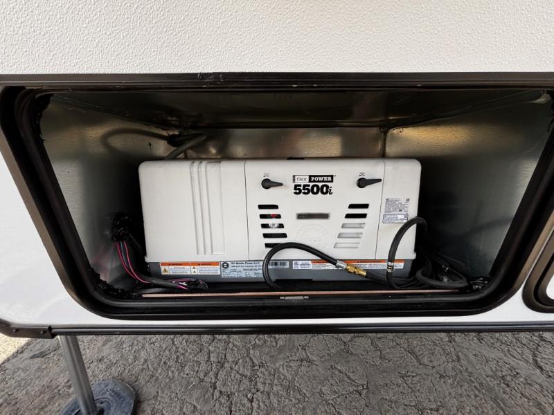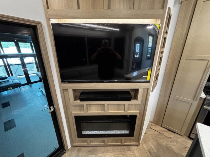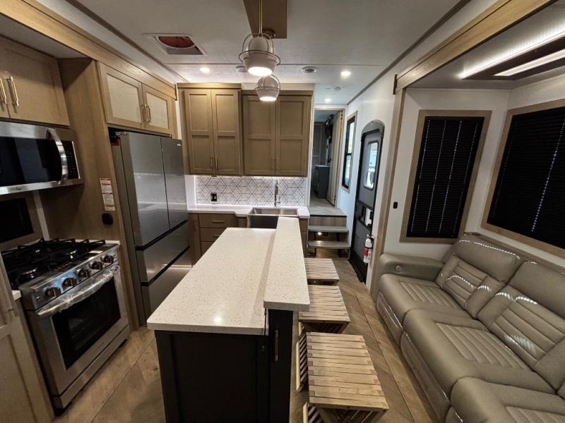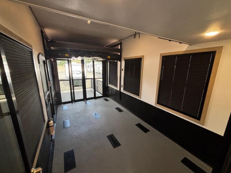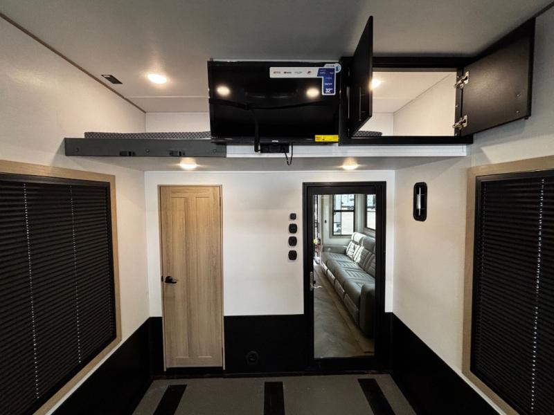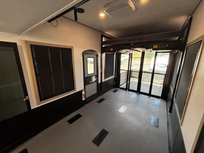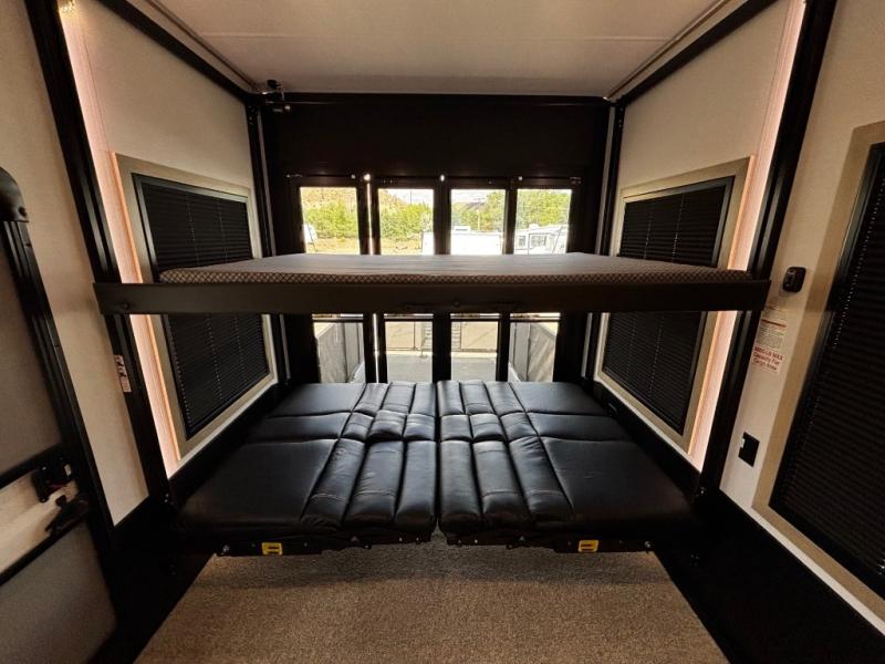 You will have everything you need for a comfortable camping trip and then some with this toy hauler! Load your toys into the 16' garage area with the zero gravity ramp door and secure them with 5,000 lb. frame welded tie-downs. The garage also has an electric bed above dual opposing sofas with a table in between, a loft with a twin bed, a half bathroom, and washer and dryer prep. Create your best meals with the four burner cooktop and enjoy the company of others sitting at the kitchen island with three bar stools while you prepare it. Relax in true comfort on the 4-seat recliner across from the entertainment center with a fireplace. When you're ready to wind down your nights, take a hot shower in the dual entry bathroom then head directly into the front private bedroom which features a king bed suite with a large front wardrobe for clothing storage, and washer/dryer prep in case you wish to add appliances so you can wash your clothes while you are away!
