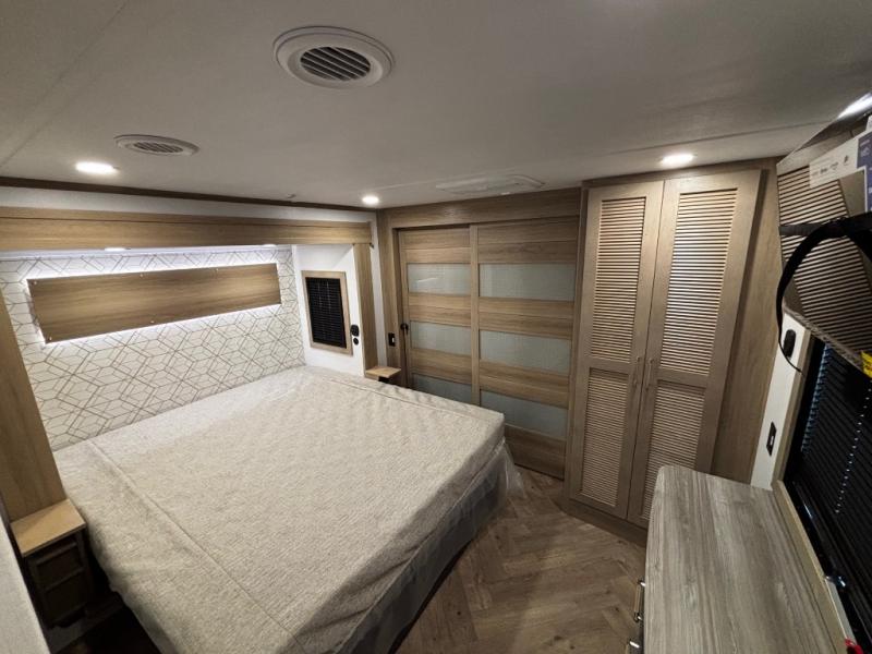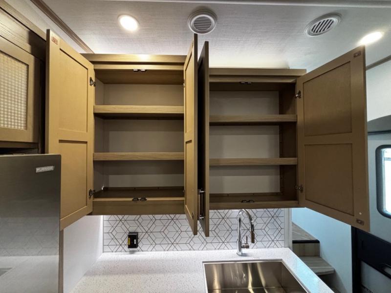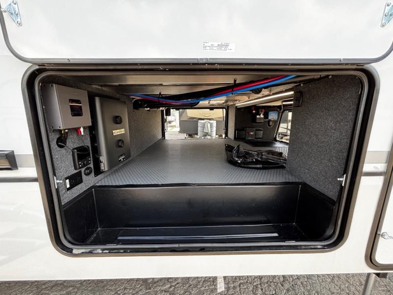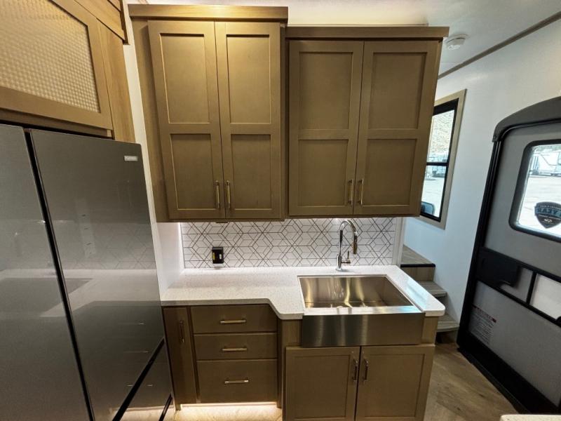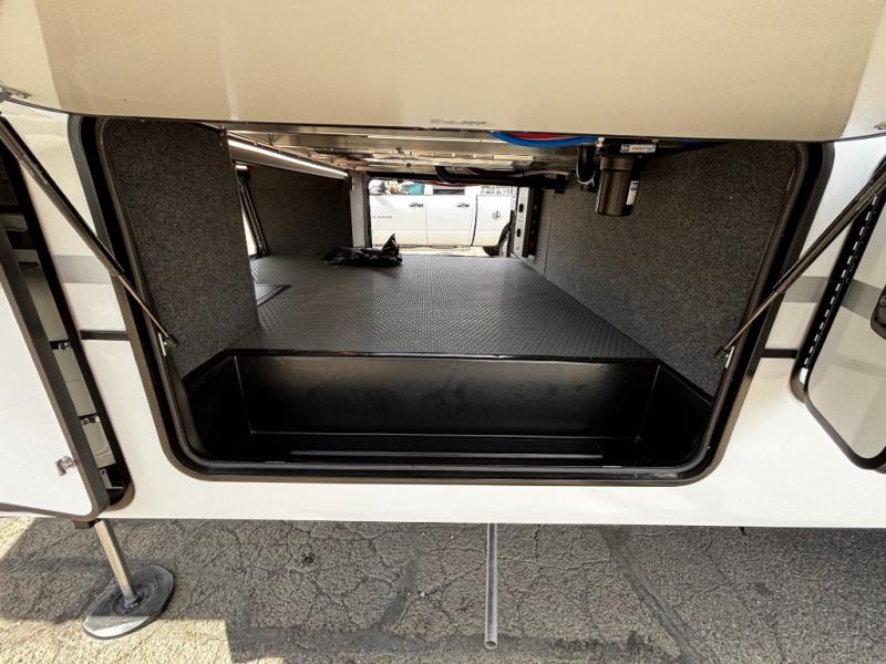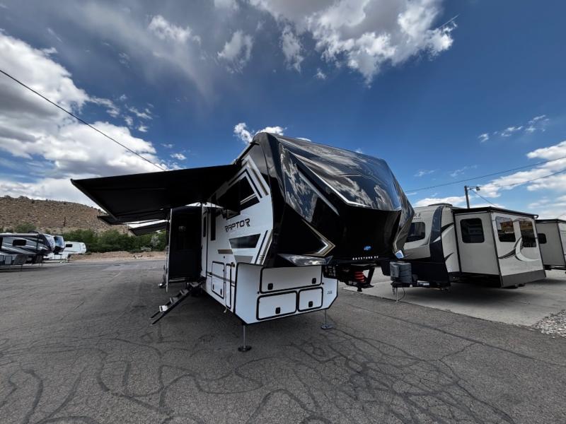 Experience a breath of fresh air with one of these Keystone RV Raptor fifth wheel toy haulers! Their rugged construction consists of a one-piece Alpha Super Flex TPO roof membrane, Dyna Span floor decking, and 5,000 lb. frame-welded tie- downs to keep your toys in place as you travel. Some unexpected conveniences you will appreciate include an Omni-Chill A/C system to keep you cool on those hot summer days, a Furrion backup camera, MaxTurn™ technology with a Helux™ pin box, and a Generation 3 iN-Command smart automation system with Global Connect to make life easier. There is also designer style vinyl flooring throughout, along with hardwood ceiling treatment with LED accent lighting, beach wood and white cabinetry, and many more interior comforts!