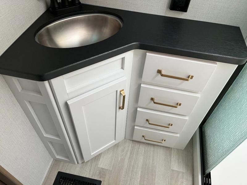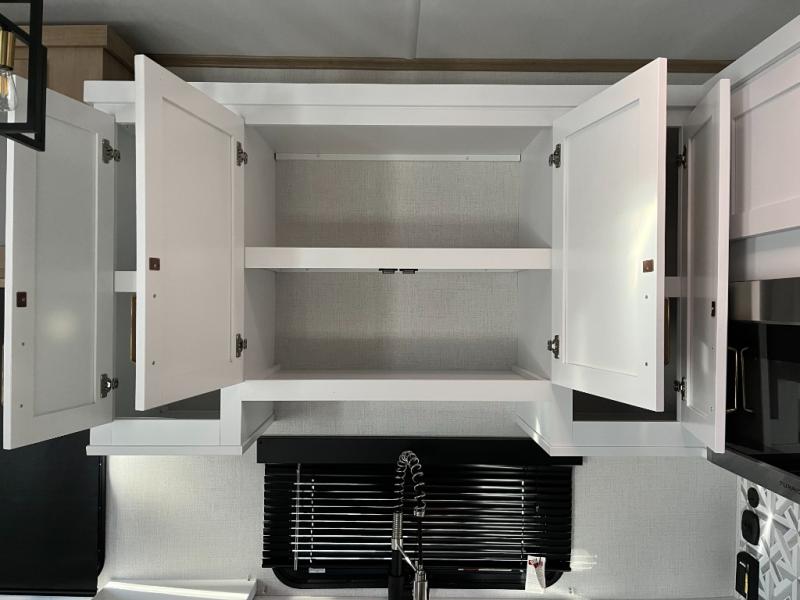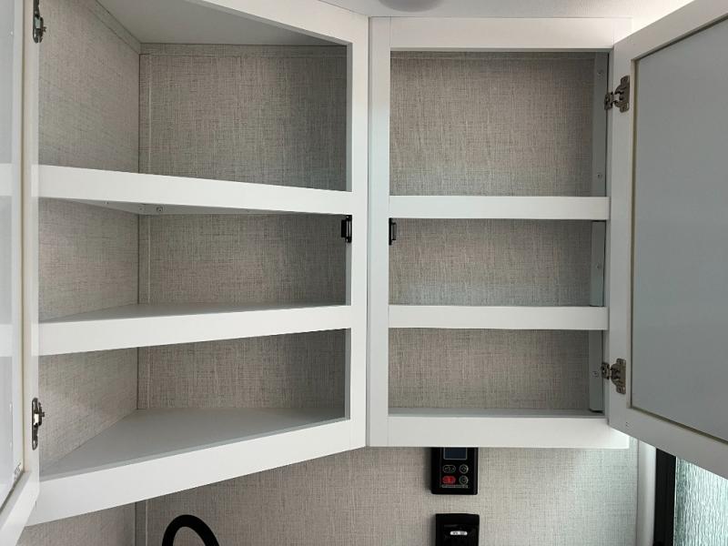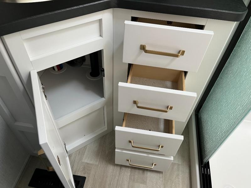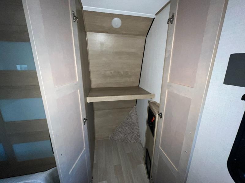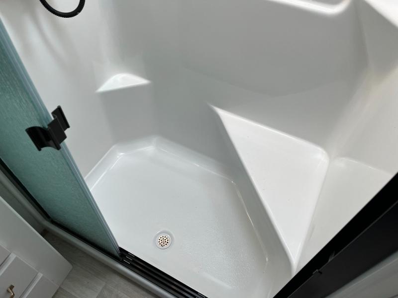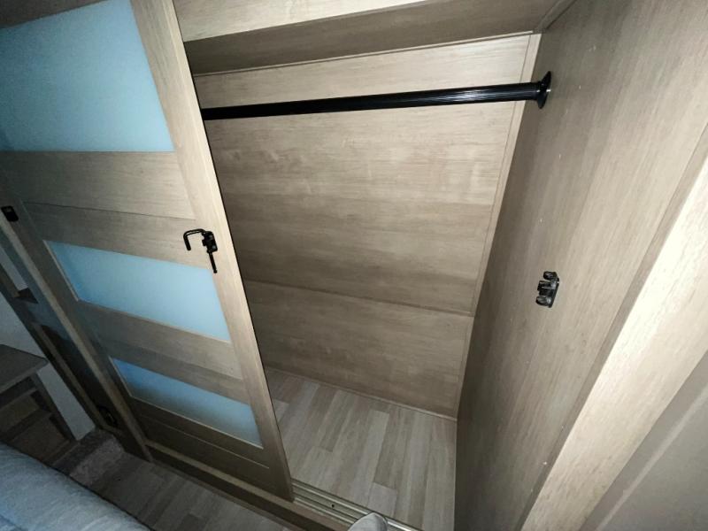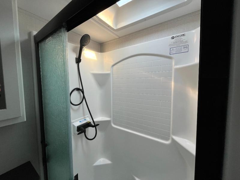 The private bedroom offers a peaceful retreat after a long day of exploration, complete with a comfortable bed, ample storage, and a restful atmosphere. The bathroom includes a roomy shower, quality fixtures, and thoughtful layout to keep your daily routines convenient and refreshing while you’re on the road.