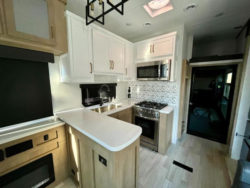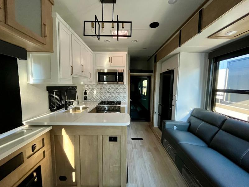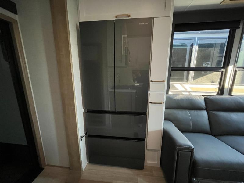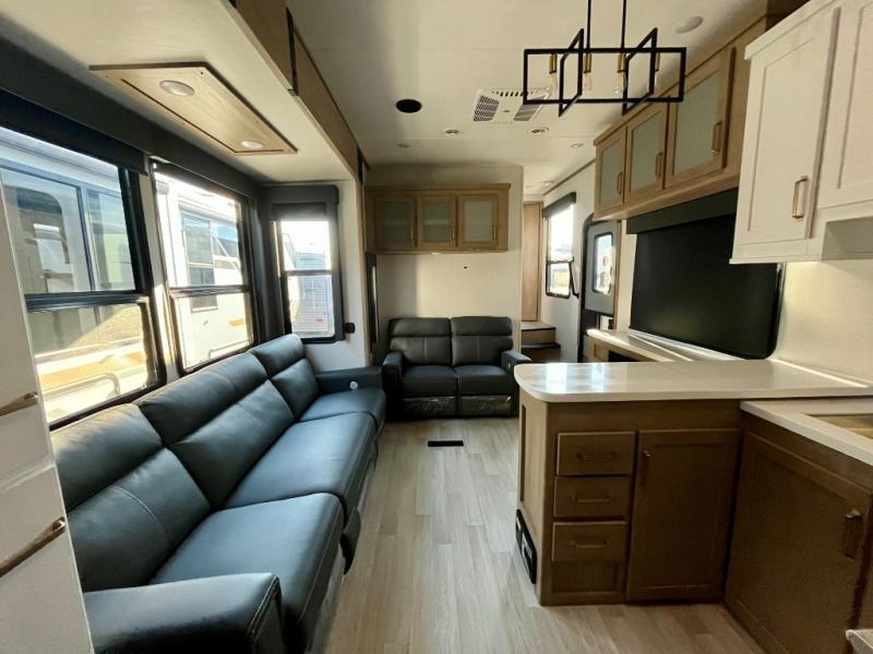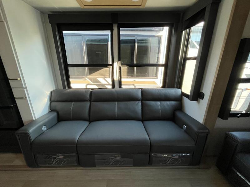 When it’s time to relax, the interior of the Raptor 424 feels more like a high-end motorcoach than a toy hauler. The expansive living area offers plush seating, a spacious entertainment center, and panoramic windows that fill the space with natural light and beautiful views. With slide-outs expanding the living space, you’ll enjoy an open, comfortable environment perfect for unwinding after a day of adventure.