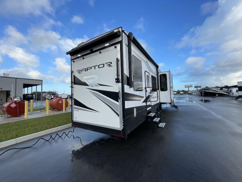 Experience a breath of fresh air with one of these Keystone RV Raptor fifth wheel toy haulers! Their rugged construction consists of a one-piece Alpha Super Flex TPO roof membrane, Dyna Span floor decking, and 5,000 lb. frame-welded tie- downs to keep your toys in place as you travel. Some unexpected conveniences you will appreciate include an Omni-Chill A/C system to keep you cool on those hot summer days, a Furrion backup camera, MaxTurn™ technology with a Helux™ pin box, and a Generation 3 iN-Command smart automation system with Global Connect to make life easier. There is also designer style vinyl flooring throughout, along with hardwood ceiling treatment with LED accent lighting, beach wood and white cabinetry, and many more interior comforts!