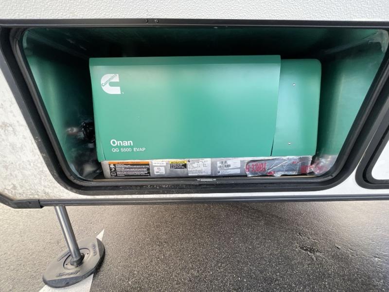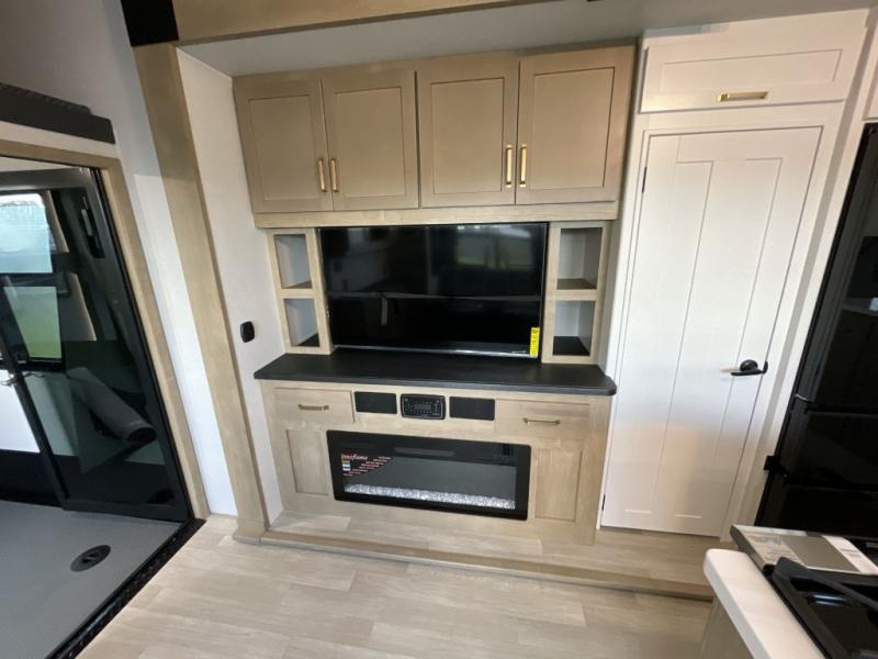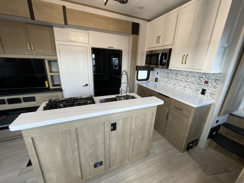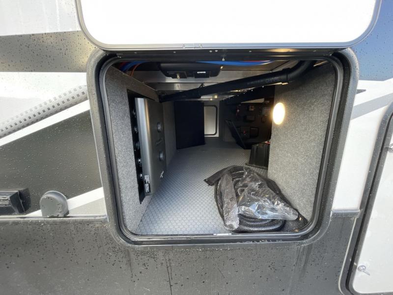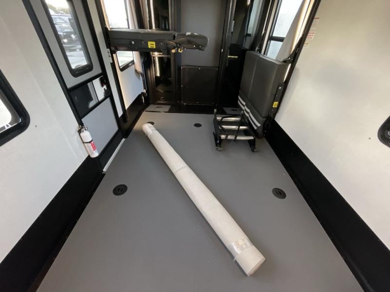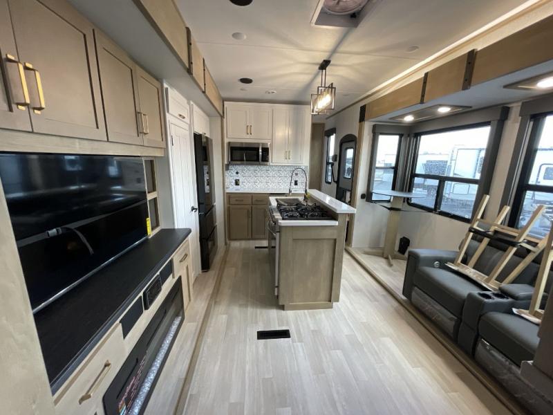 With a 15' garage area, you can bring your favorite off-road toys in this toy hauler! The zero gravity ramp door makes it easy to load them up and once you have arrived you can set up the dual opposing sofas with a table in between, the electric bed above them, and the loft with a twin bed, plus there is even a half bathroom and one of the dual entry doors to the unit. While the chef is preparing dinner on the four burner Lusso range at the kitchen island, two others can sit at the dinette table to play a game or simply socialize all together. When mother nature is raining on your parade, relax on the reclining theater seating with heat, massage, and USB, and enjoy the entertainment center with fireplace and 50" Smart LED TV. The master suite will have you feeling right at home with a king bed slide, a large wardrobe with an area next to it prepped for a washer and dryer, and quick access to the full bathroom which has a residential shower to freshen up in each morning!