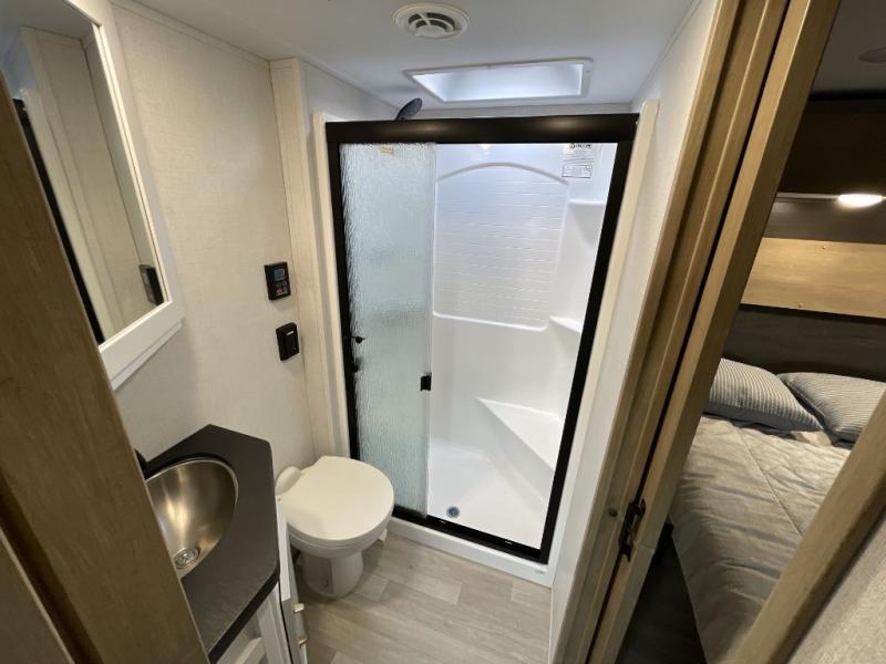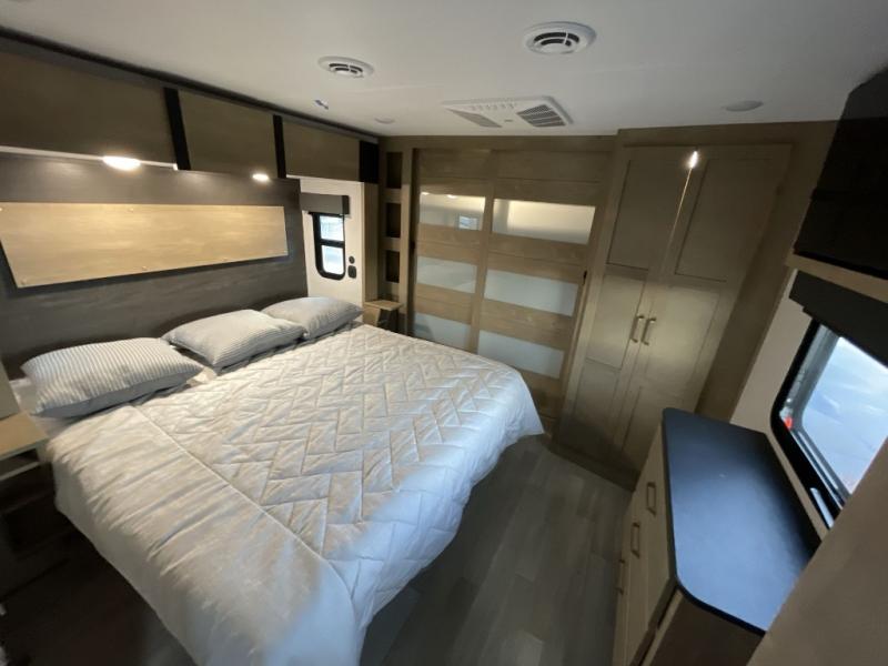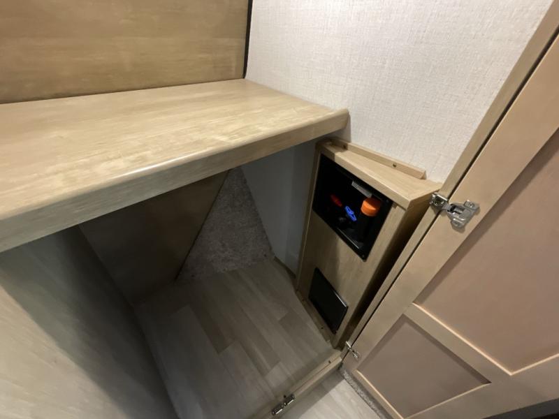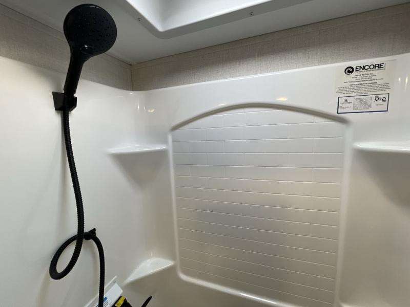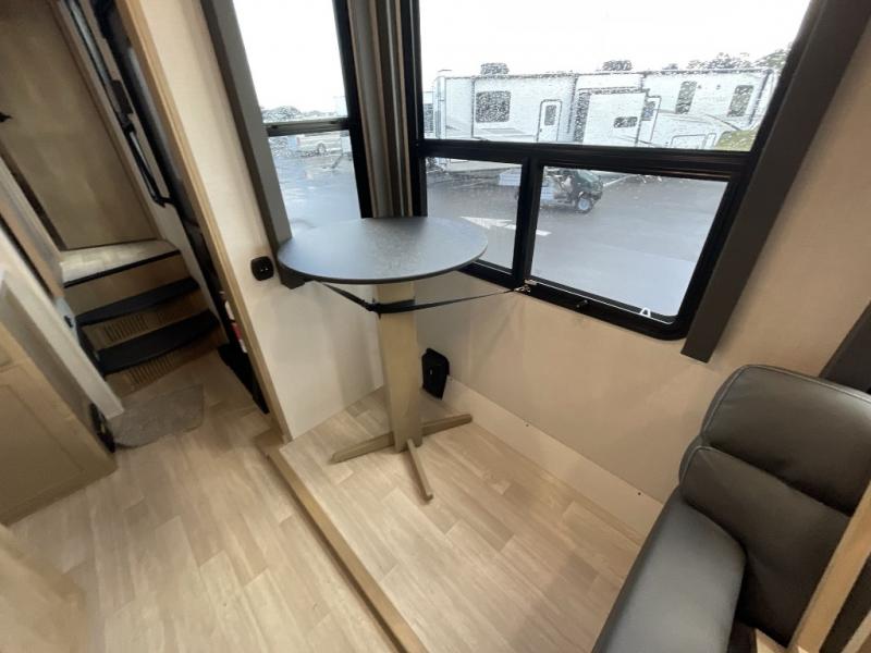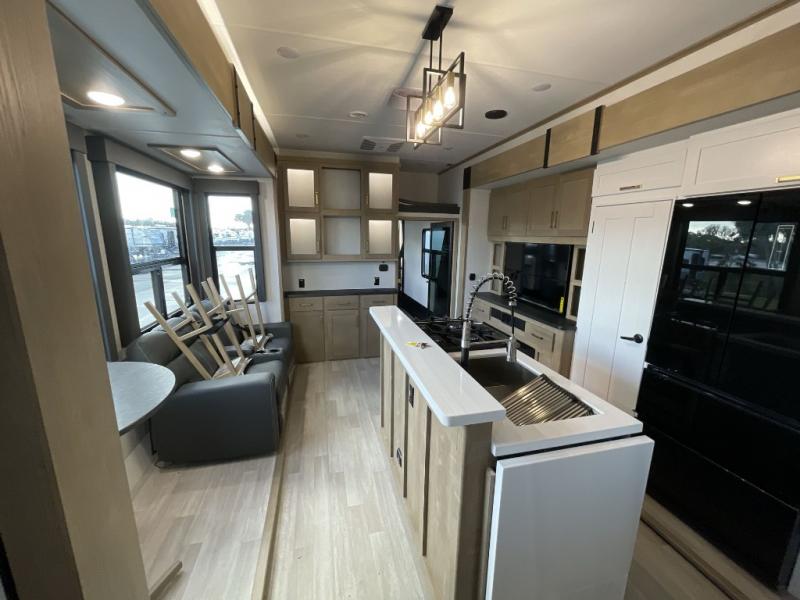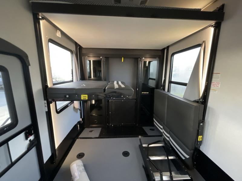 With a 15' garage area, you can bring your favorite off-road toys in this toy hauler! The zero gravity ramp door makes it easy to load them up and once you have arrived you can set up the dual opposing sofas with a table in between, the electric bed above them, and the loft with a twin bed, plus there is even a half bathroom and one of the dual entry doors to the unit. While the chef is preparing dinner on the four burner Lusso range at the kitchen island, two others can sit at the dinette table to play a game or simply socialize all together. When mother nature is raining on your parade, relax on the reclining theater seating with heat, massage, and USB, and enjoy the entertainment center with fireplace and 50" Smart LED TV. The master suite will have you feeling right at home with a king bed slide, a large wardrobe with an area next to it prepped for a washer and dryer, and quick access to the full bathroom which has a residential shower to freshen up in each morning!