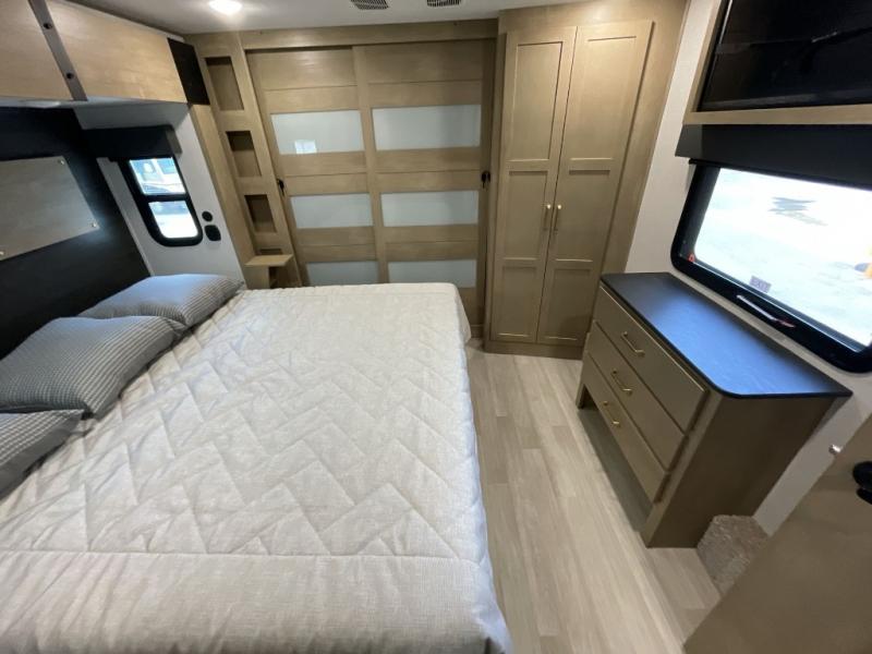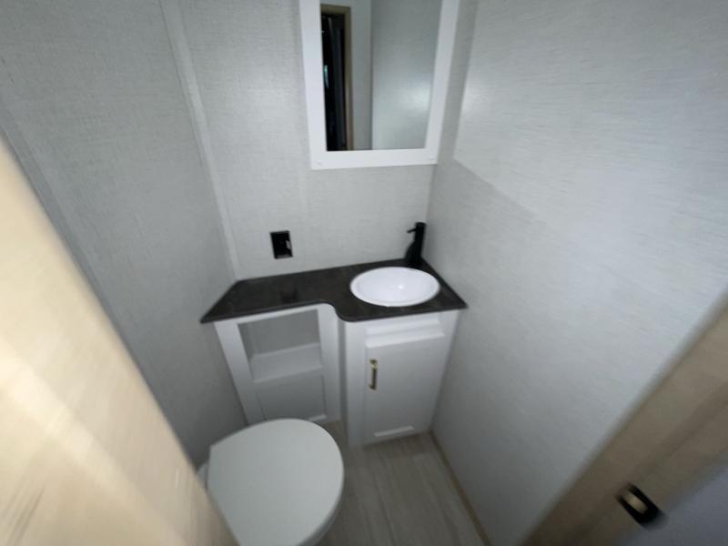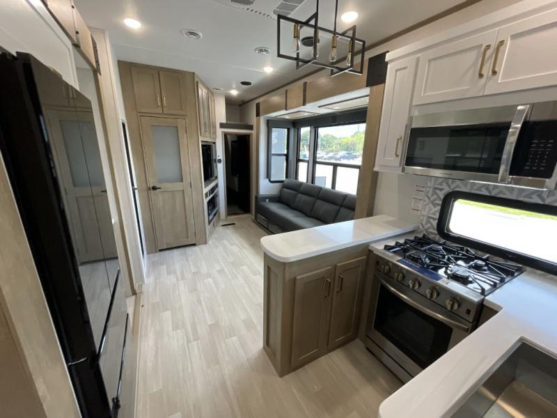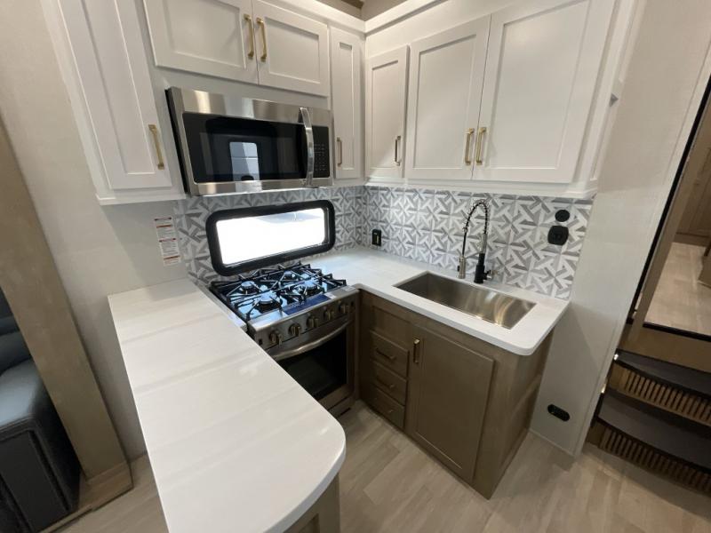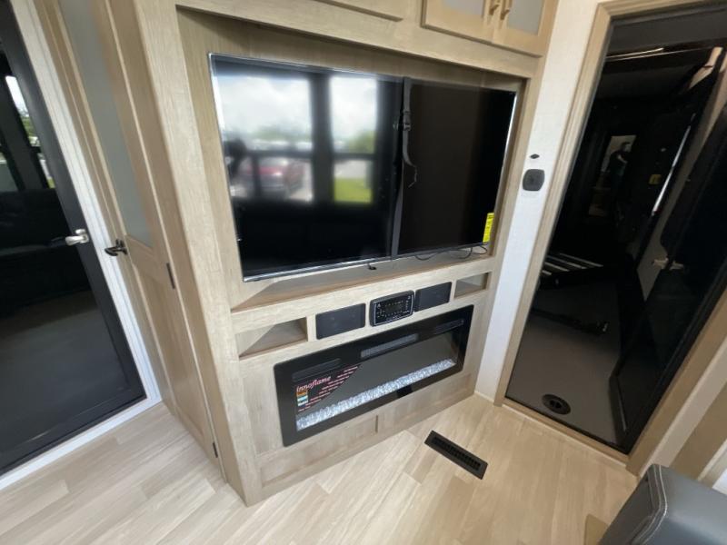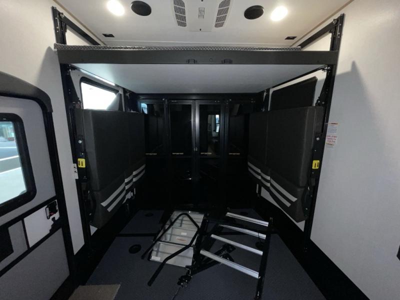 You will be the talk of the campground with a 9' 10" side patio and outside TV on this toy hauler! As you enter the 13' garage area, you will notice an electric bed above dual opposing sofas with a table in between for meals or games, a loft with a twin bed, a half bathroom, and even washer and dryer prep. The 4-seat recliner slide is across from the entertainment center which features a 50" Smart LED TV and a fireplace for a cozy evening indoors. Prepare your best meals with the four burner cooktop in the U-shaped kitchen and freshen up each morning in the dual entry bathroom with the shower. The bathroom also leads directly into the front private bedroom which offers a king bed suite, wireless phone chargers on either side of it, and a wardrobe slide to keep your clothes looking their best!