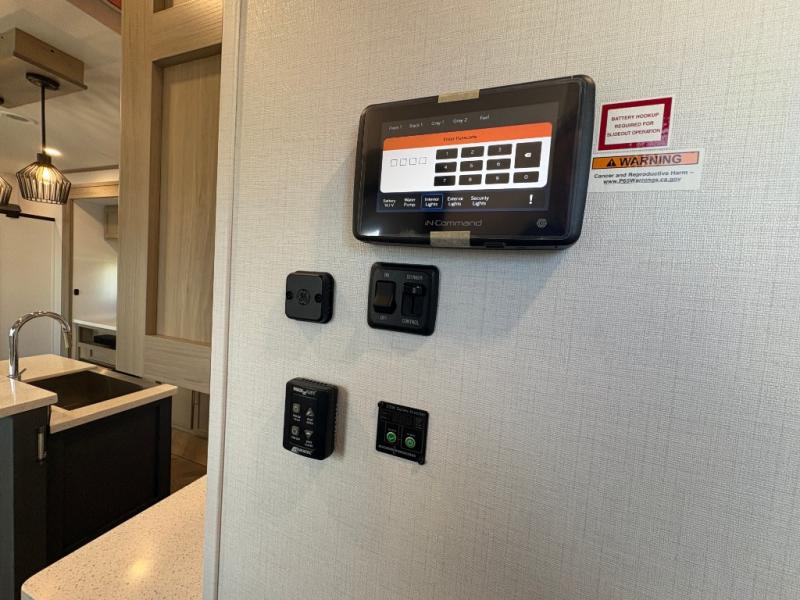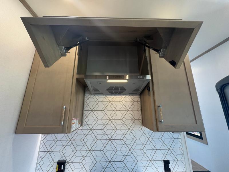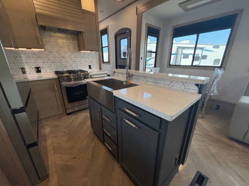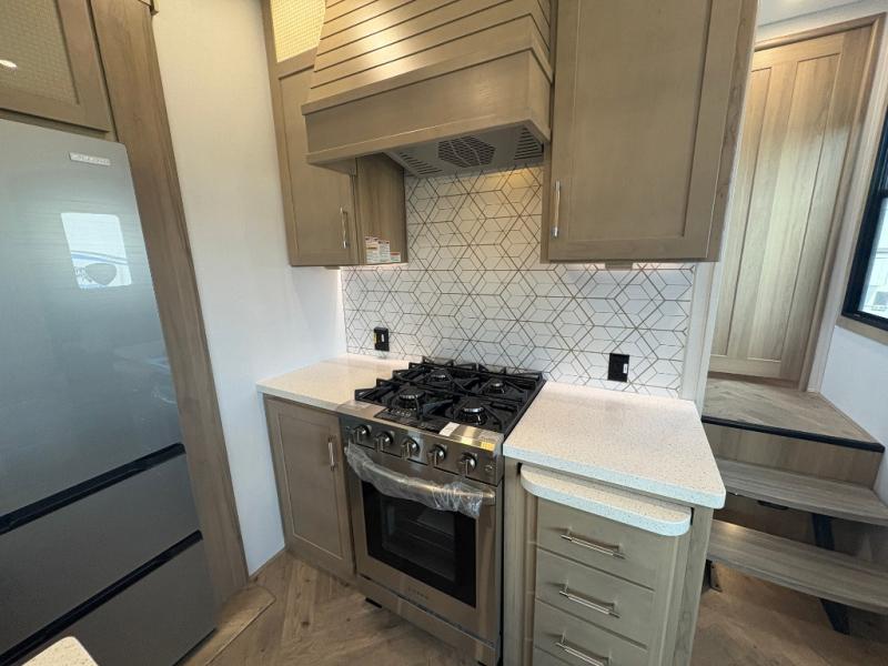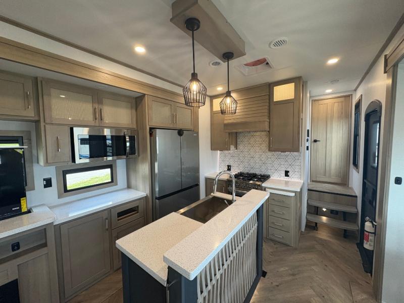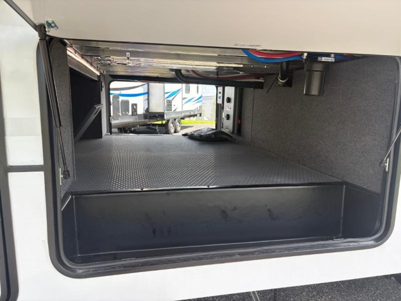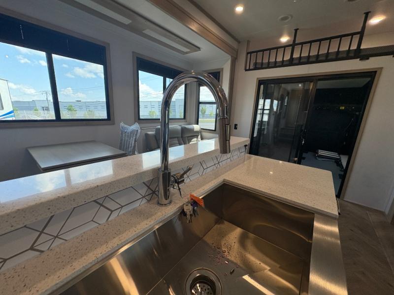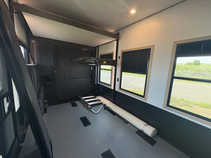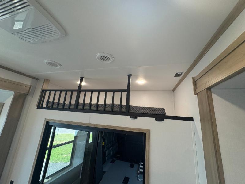 With a 15' garage area, you can bring your favorite off-road toys in this toy hauler! The exclusive ramp door with backup camera makes it easy to load them up and once you have arrived you can set up the dual opposing sofas, the queen bed above them, and the 32" bunk loft, plus there is even one of the dual entry doors to the unit. While the chef is preparing dinner on the Lasus 24" range and oven, three others can sit at the kitchen island with raised countertop and three folding bar stools or at the dinette table to play a game or simply socialize all together. When mother nature is raining on your parade, relax on the reclining theater seating with lumbar and tilting headrest, and enjoy the entertainment center with fireplace and 50" Smart LED TV. The front private bedroom will have you feeling right at home with a king bed slide, a large wardrobe with an area next to it prepped for a washer and dryer, a dresser with hidden storage, and a LED Smart TV. The full bathroom has a 40" x 28" shower with a seat to freshen up in each morning!
