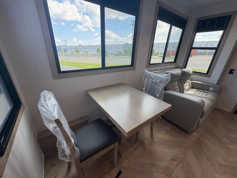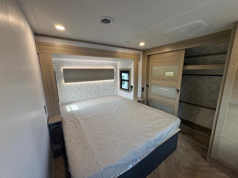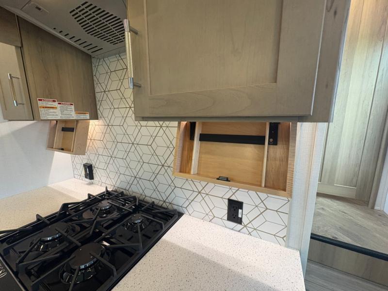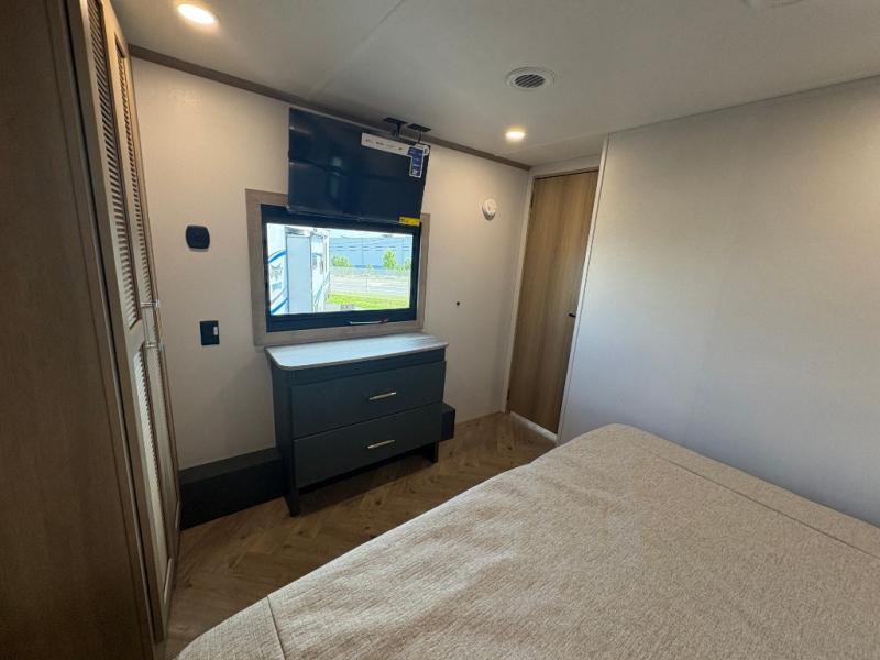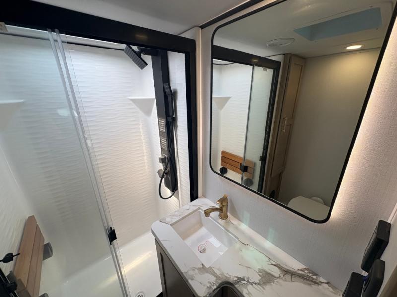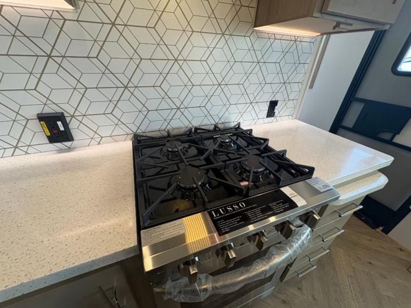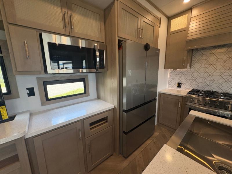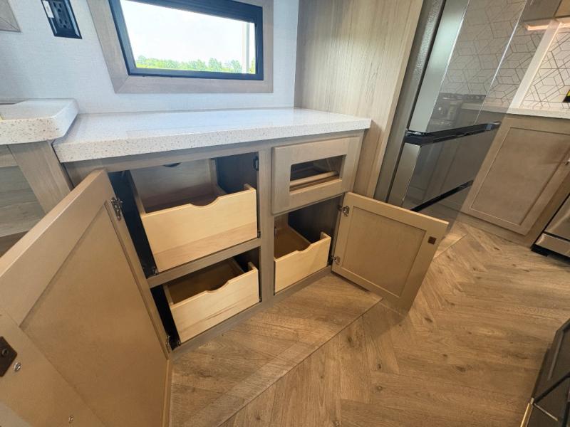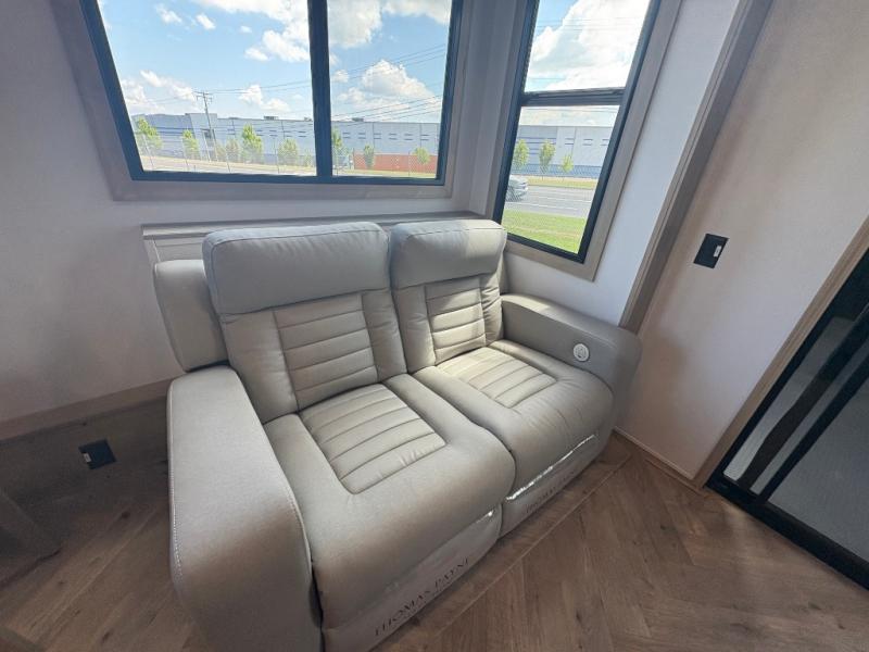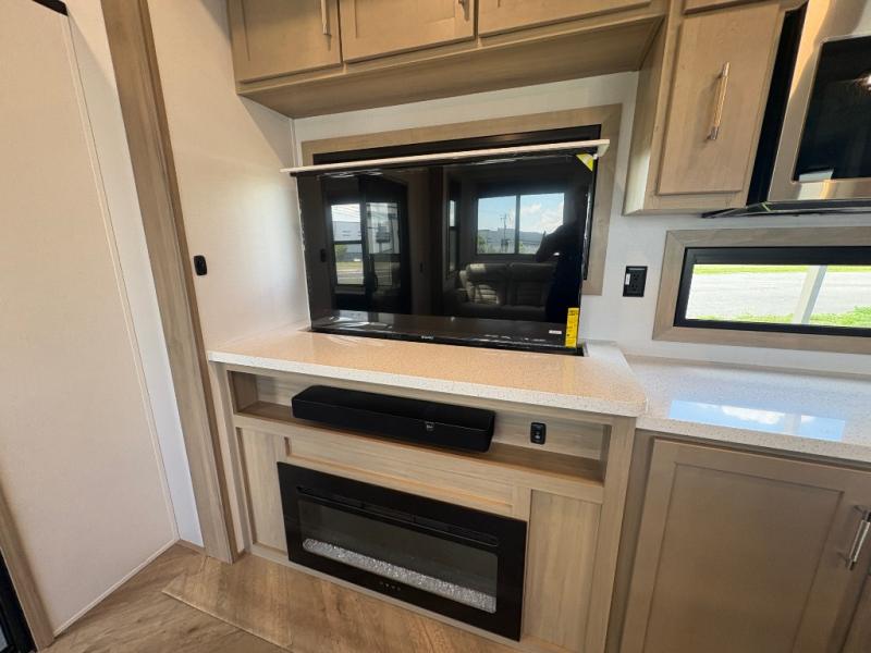 With a 15' garage area, you can bring your favorite off-road toys in this toy hauler! The exclusive ramp door with backup camera makes it easy to load them up and once you have arrived you can set up the dual opposing sofas, the queen bed above them, and the 32" bunk loft, plus there is even one of the dual entry doors to the unit. While the chef is preparing dinner on the Lasus 24" range and oven, three others can sit at the kitchen island with raised countertop and three folding bar stools or at the dinette table to play a game or simply socialize all together. When mother nature is raining on your parade, relax on the reclining theater seating with lumbar and tilting headrest, and enjoy the entertainment center with fireplace and 50" Smart LED TV. The front private bedroom will have you feeling right at home with a king bed slide, a large wardrobe with an area next to it prepped for a washer and dryer, a dresser with hidden storage, and a LED Smart TV. The full bathroom has a 40" x 28" shower with a seat to freshen up in each morning!