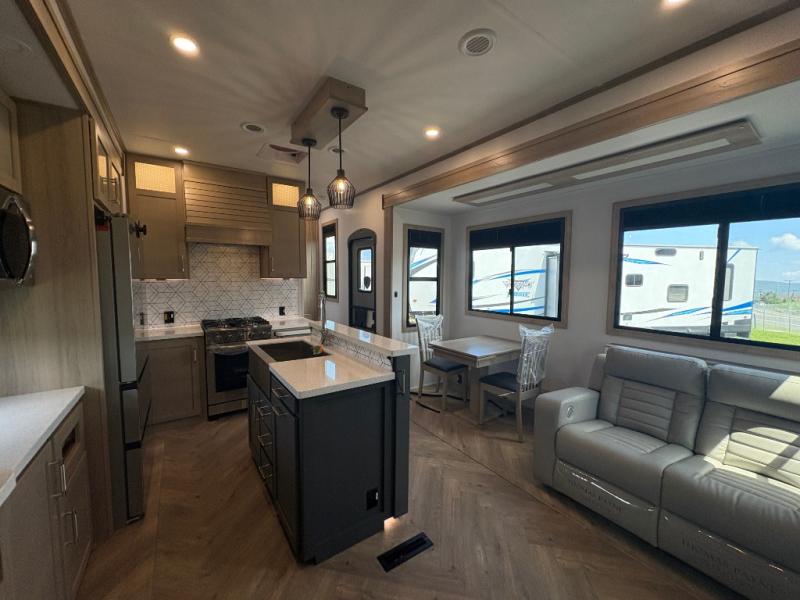 Experience a breath of fresh air with one of these Keystone RV Raptor fifth wheel toy haulers! Their rugged construction consists of a one-piece Alpha Super Flex TPO roof membrane, Dyna Span floor decking, and 5,000 lb. frame-welded tie- downs to keep your toys in place as you travel. Some unexpected conveniences you will appreciate include an Omni-Chill A/C system to keep you cool on those hot summer days, a Furrion backup camera, MaxTurn™ technology with a Helux™ pin box, and a Generation 3 iN-Command smart automation system with Global Connect to make life easier. There is also designer style vinyl flooring throughout, along with hardwood ceiling treatment with LED accent lighting, beach wood and white cabinetry, and many more interior comforts!