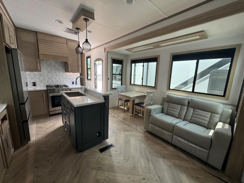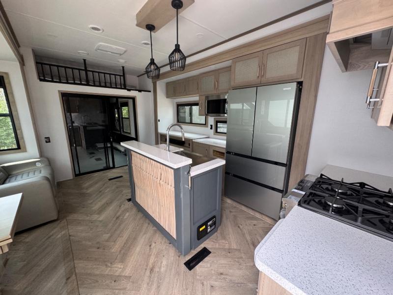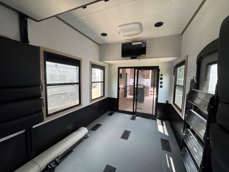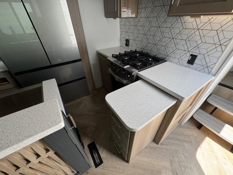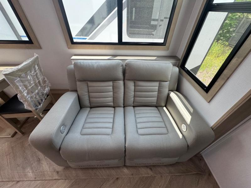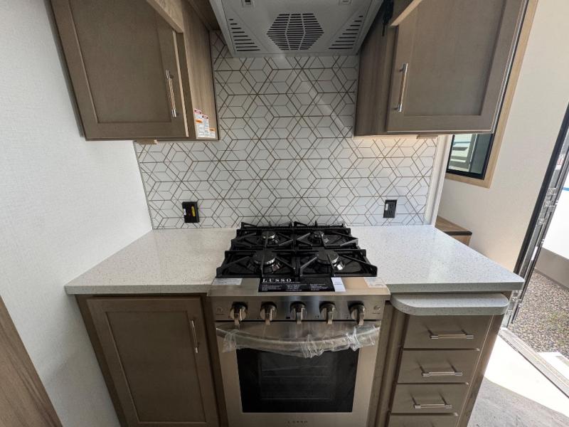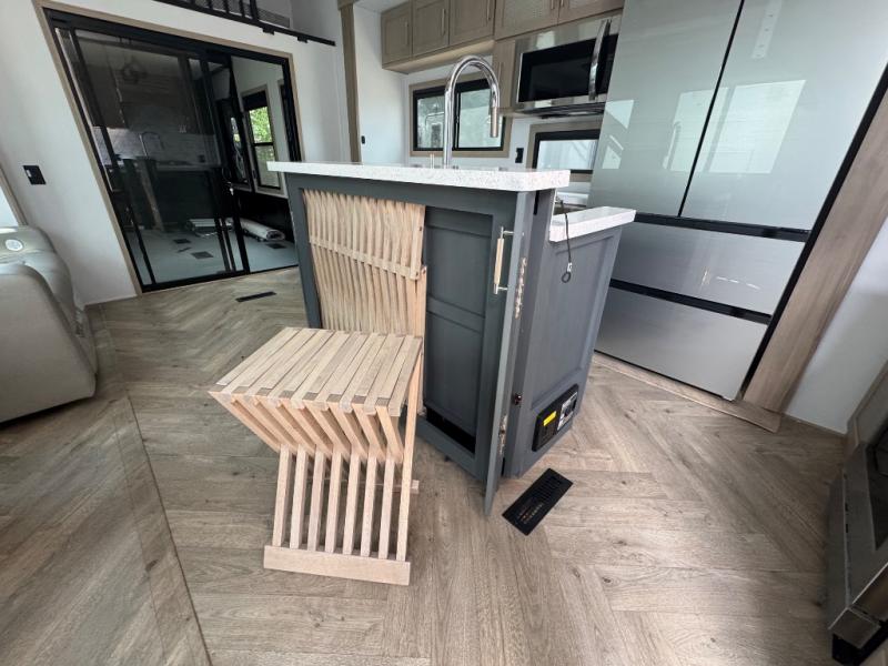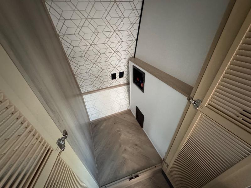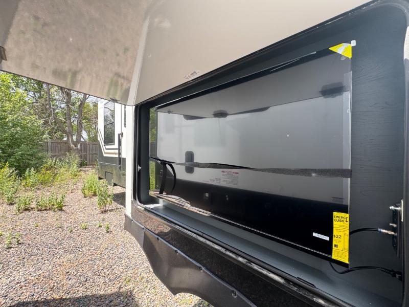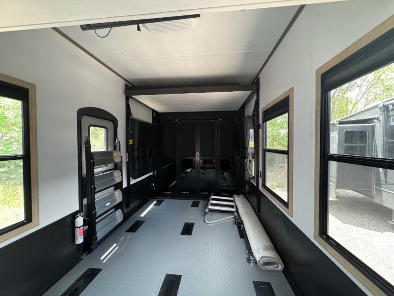 With a 15' garage area, you can bring your favorite off-road toys in this toy hauler! The exclusive ramp door with backup camera makes it easy to load them up and once you have arrived you can set up the dual opposing sofas, the queen bed above them, and the 32" bunk loft, plus there is even one of the dual entry doors to the unit. While the chef is preparing dinner on the Lasus 24" range and oven, three others can sit at the kitchen island with raised countertop and three folding bar stools or at the dinette table to play a game or simply socialize all together. When mother nature is raining on your parade, relax on the reclining theater seating with lumbar and tilting headrest, and enjoy the entertainment center with fireplace and 50" Smart LED TV. The front private bedroom will have you feeling right at home with a king bed slide, a large wardrobe with an area next to it prepped for a washer and dryer, a dresser with hidden storage, and a LED Smart TV. The full bathroom has a 40" x 28" shower with a seat to freshen up in each morning!