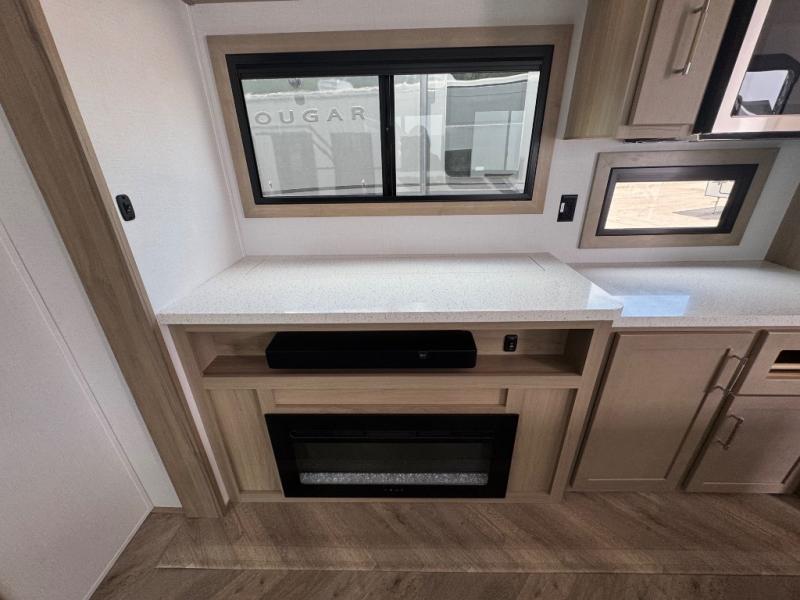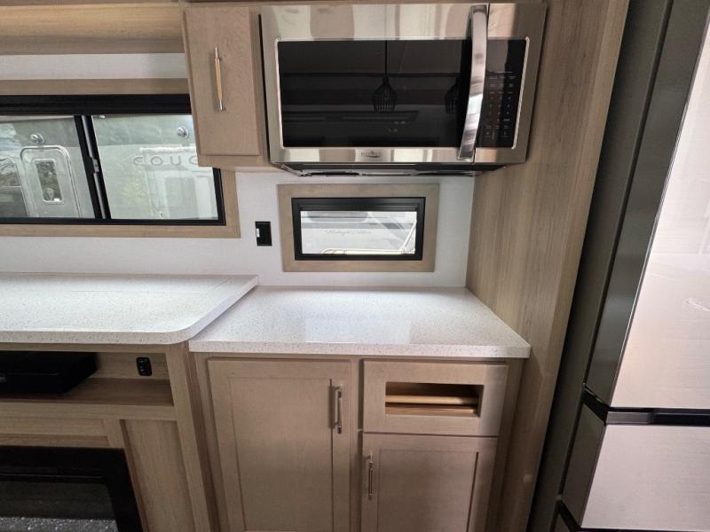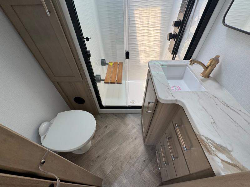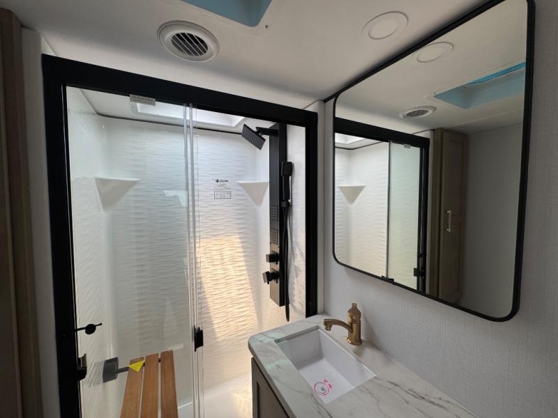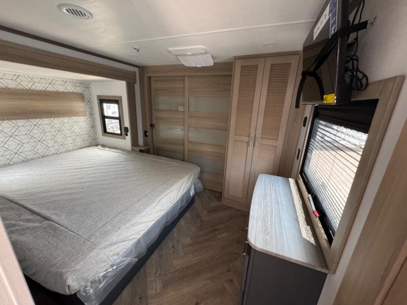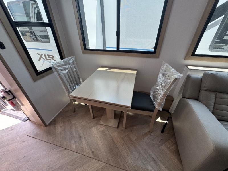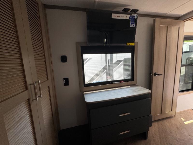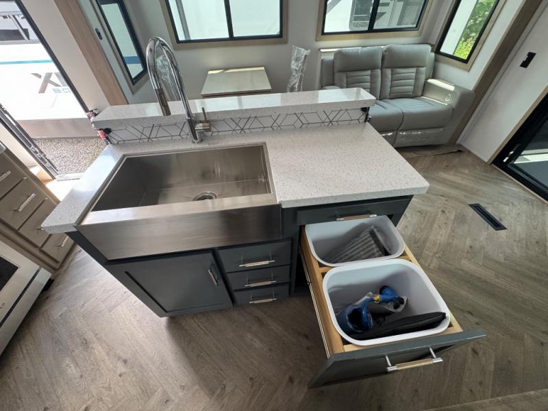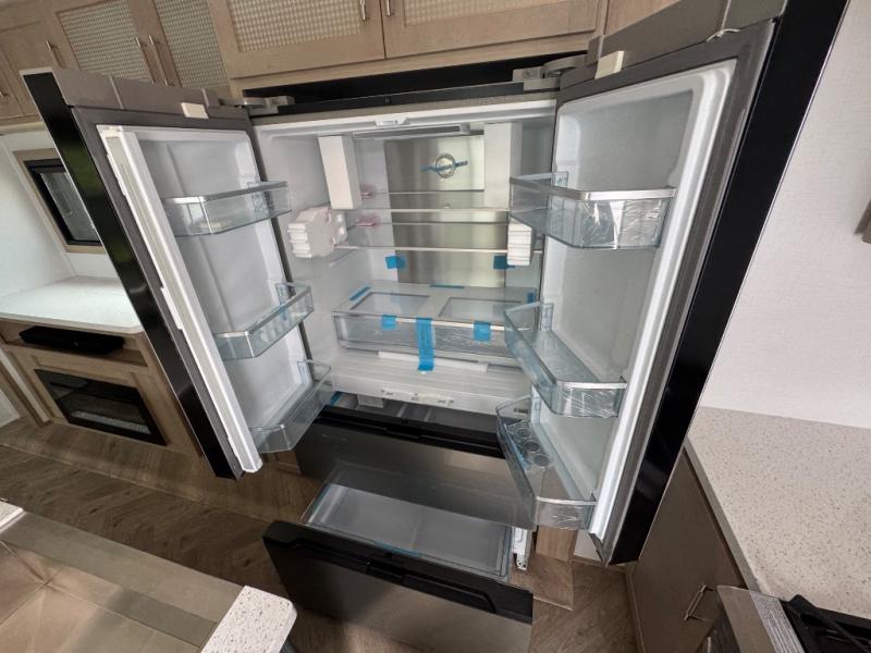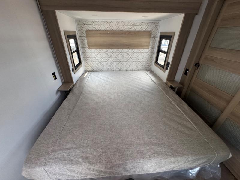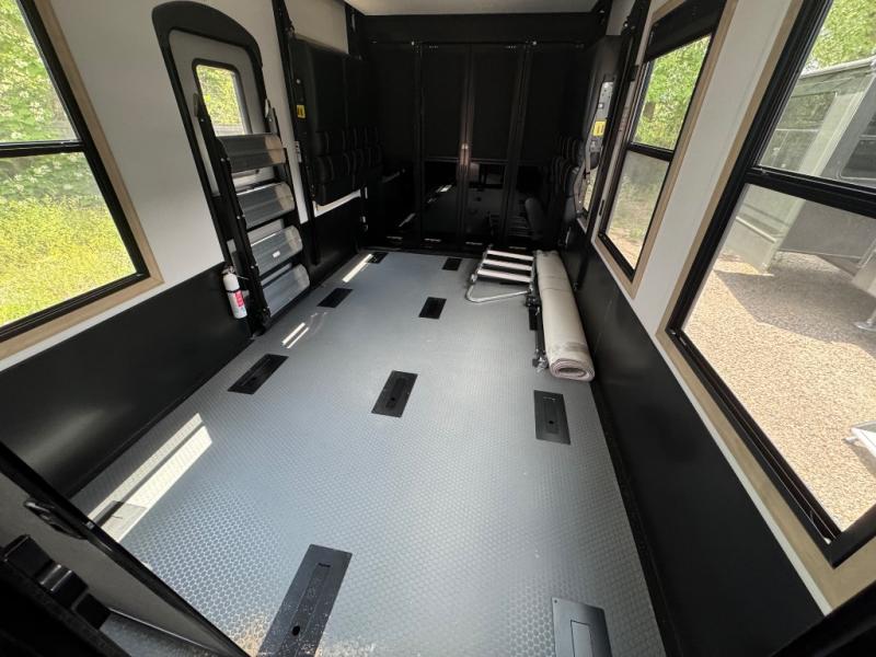With a 15' garage area, you can bring your favorite off-road toys in this toy hauler! The exclusive ramp door with backup camera makes it easy to load them up and once you have arrived you can set up the dual opposing sofas, the queen bed above them, and the 32" bunk loft, plus there is even one of the dual entry doors to the unit. While the chef is preparing dinner on the Lasus 24" range and oven, three others can sit at the kitchen island with raised countertop and three folding bar stools or at the dinette table to play a game or simply socialize all together. When mother nature is raining on your parade, relax on the reclining theater seating with lumbar and tilting headrest, and enjoy the entertainment center with fireplace and 50" Smart LED TV. The front private bedroom will have you feeling right at home with a king bed slide, a large wardrobe with an area next to it prepped for a washer and dryer, a dresser with hidden storage, and a LED Smart TV. The full bathroom has a 40" x 28" shower with a seat to freshen up in each morning!