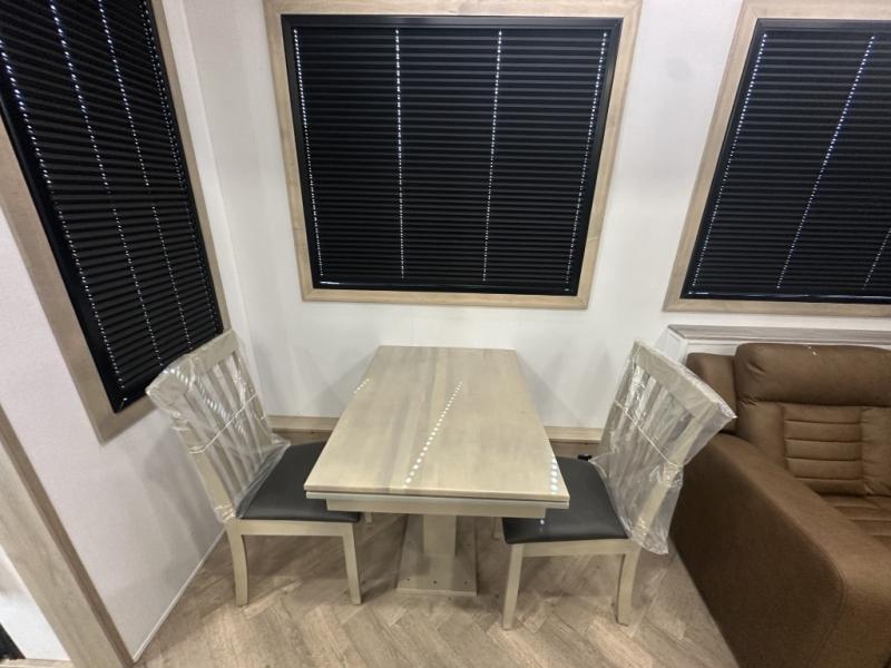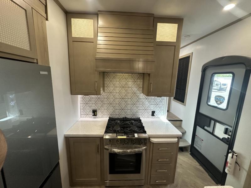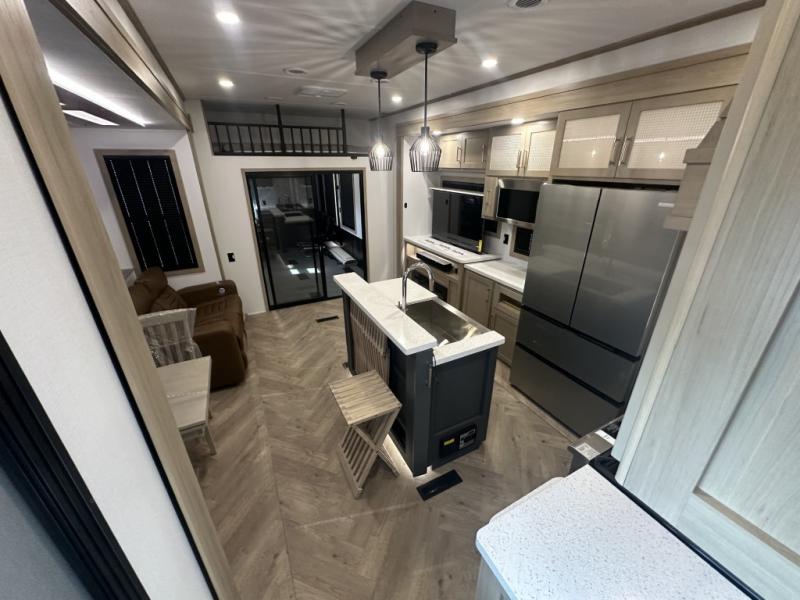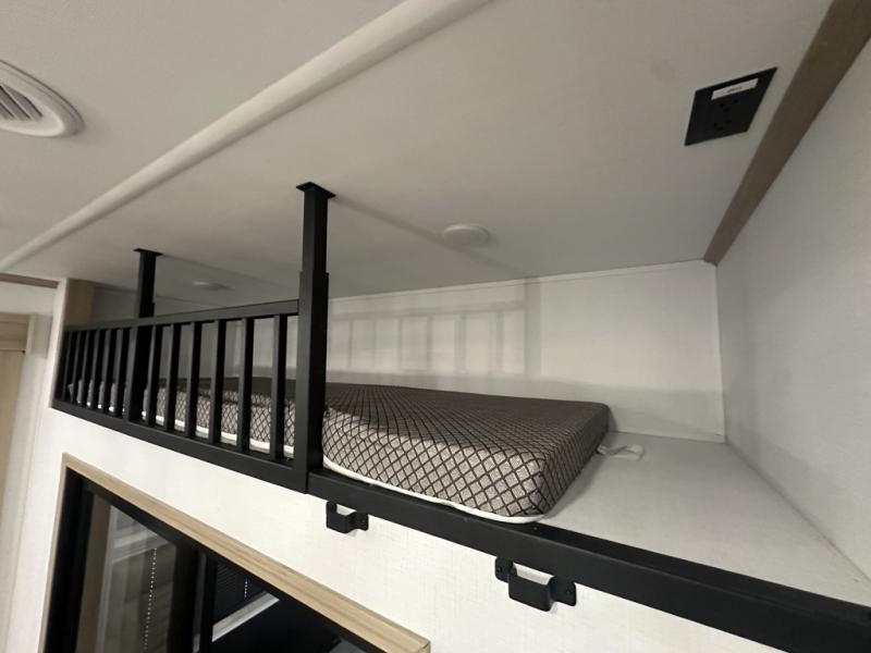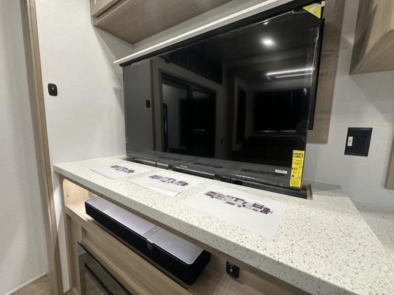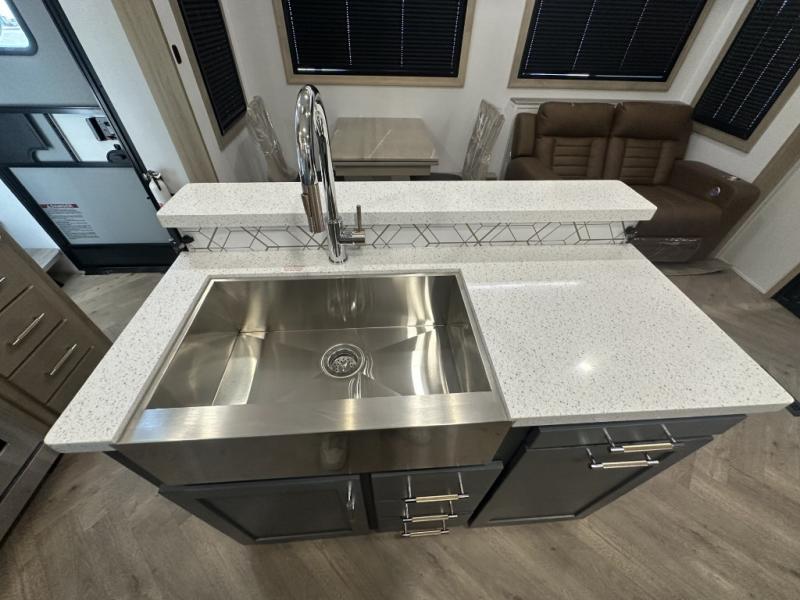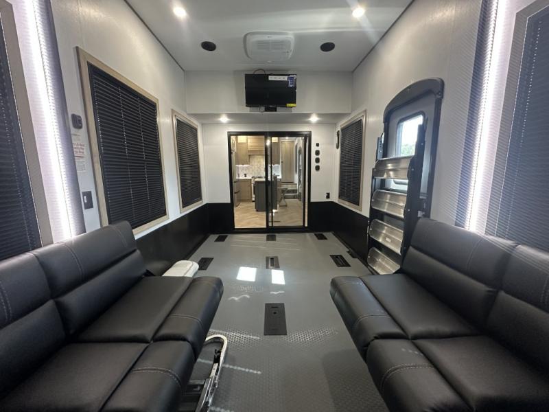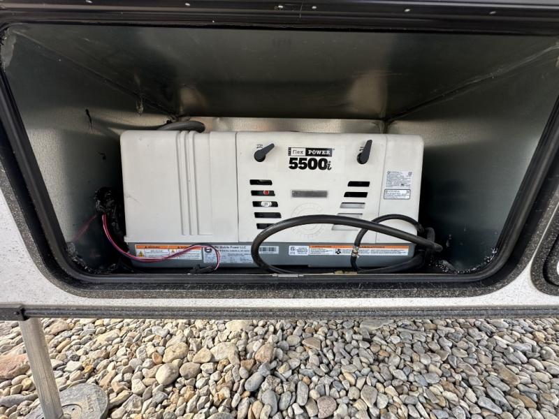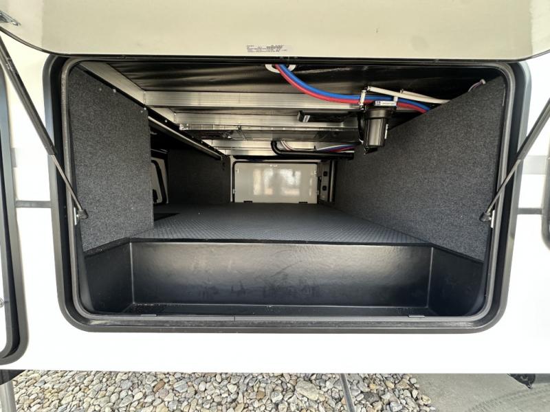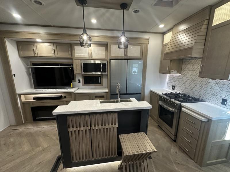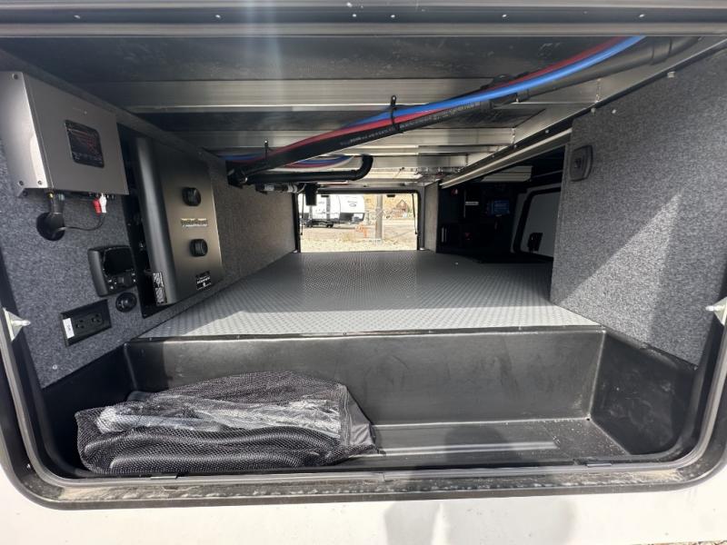 With a 15' garage area, you can bring your favorite off-road toys in this toy hauler! The exclusive ramp door with backup camera makes it easy to load them up and once you have arrived you can set up the dual opposing sofas, the queen bed above them, and the 32" bunk loft, plus there is even one of the dual entry doors to the unit. While the chef is preparing dinner on the Lasus 24" range and oven, three others can sit at the kitchen island with raised countertop and three folding bar stools or at the dinette table to play a game or simply socialize all together. When mother nature is raining on your parade, relax on the reclining theater seating with lumbar and tilting headrest, and enjoy the entertainment center with fireplace and 50" Smart LED TV. The front private bedroom will have you feeling right at home with a king bed slide, a large wardrobe with an area next to it prepped for a washer and dryer, a dresser with hidden storage, and a LED Smart TV. The full bathroom has a 40" x 28" shower with a seat to freshen up in each morning!
