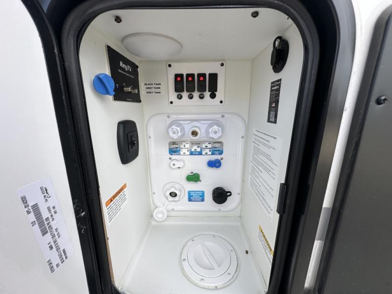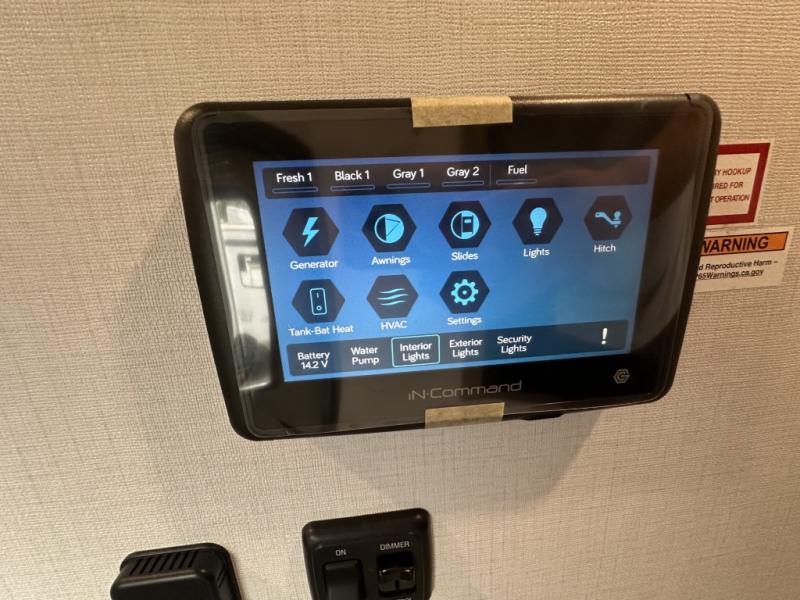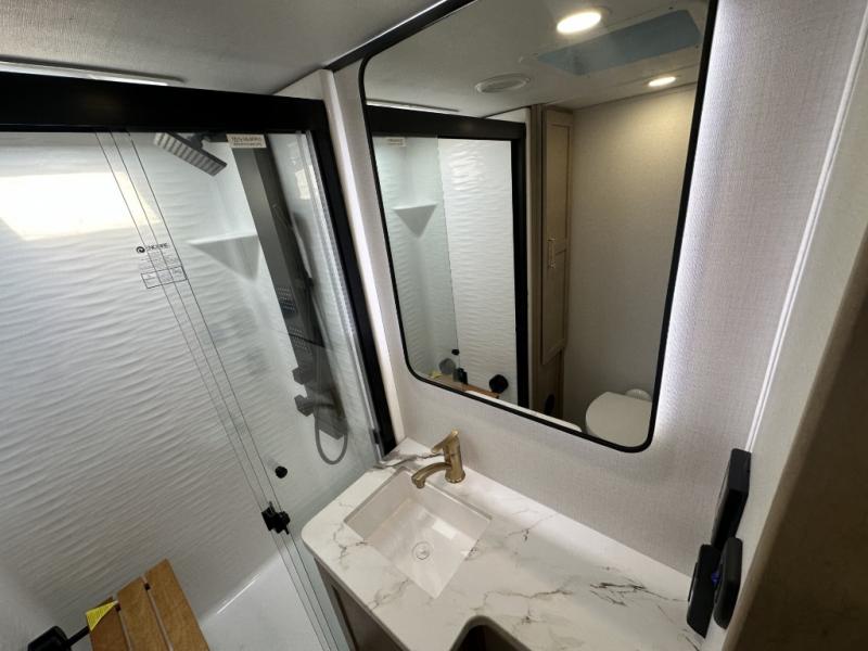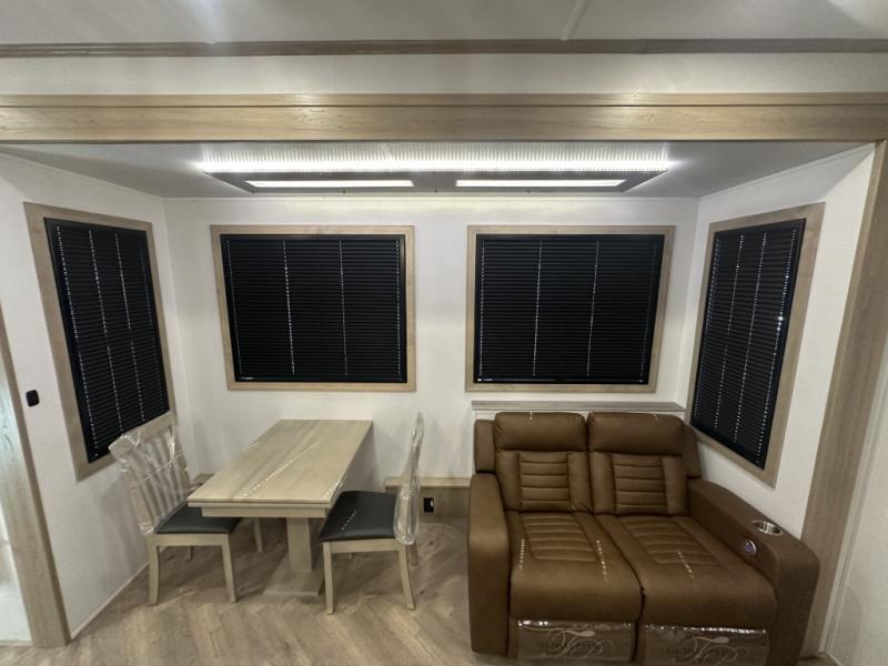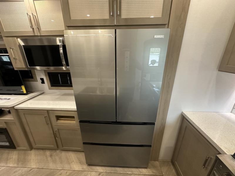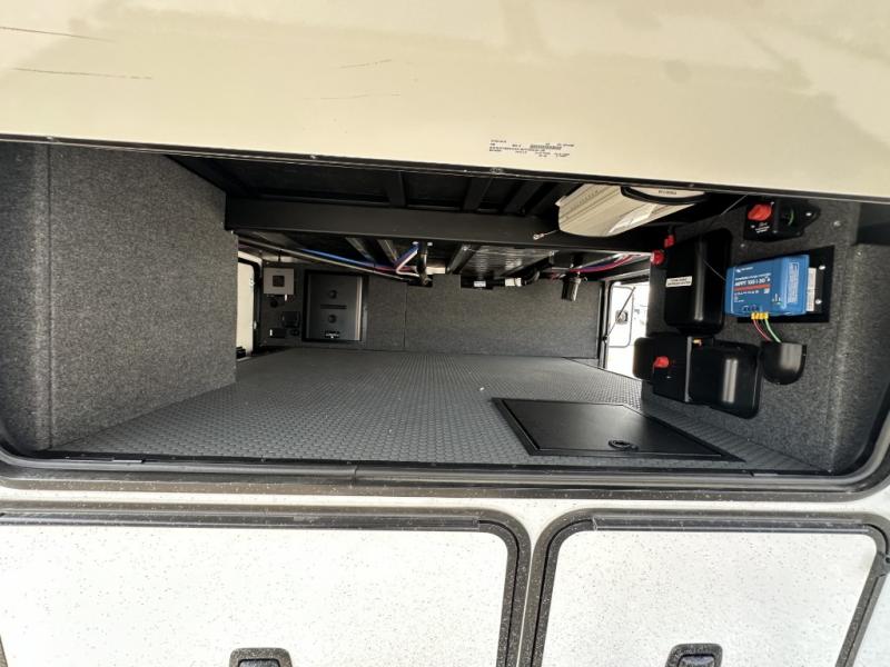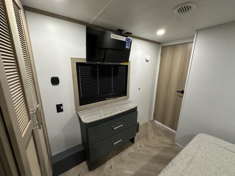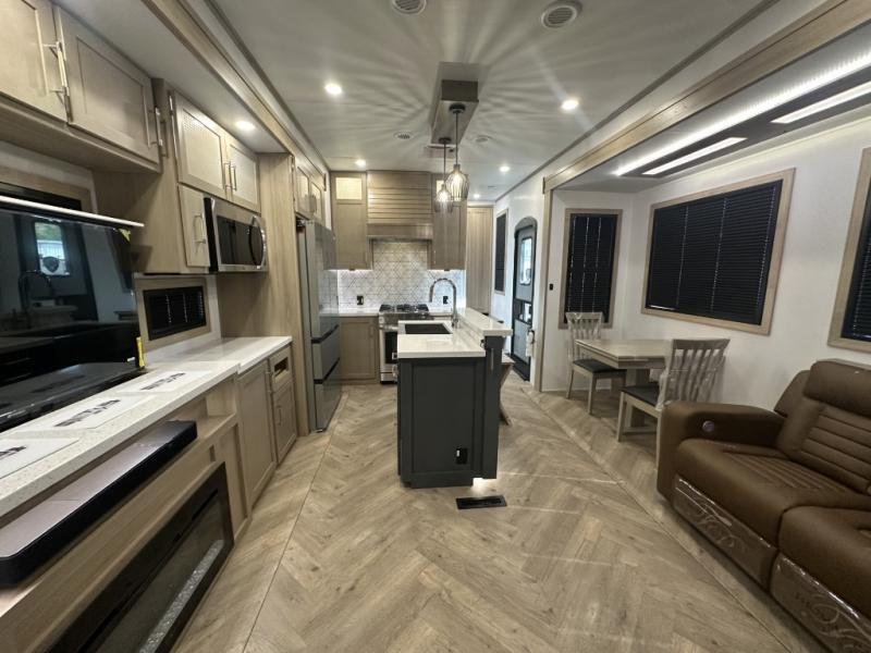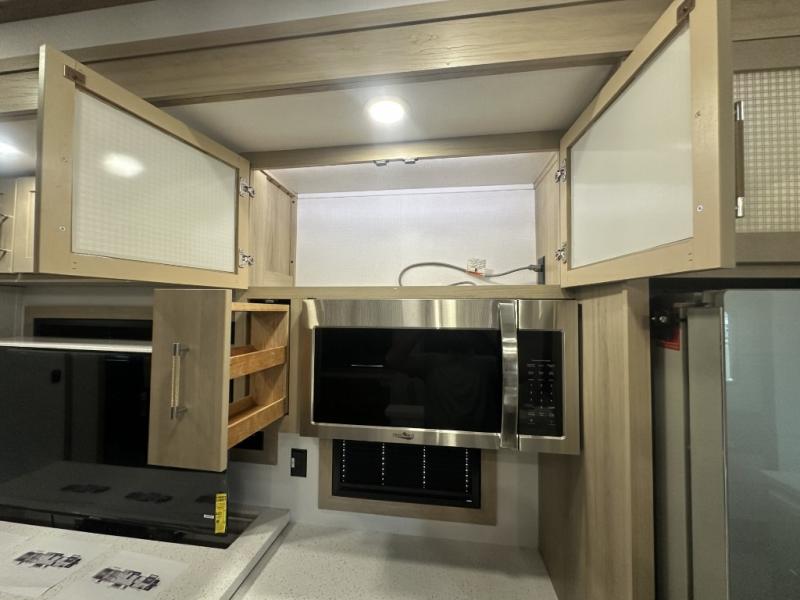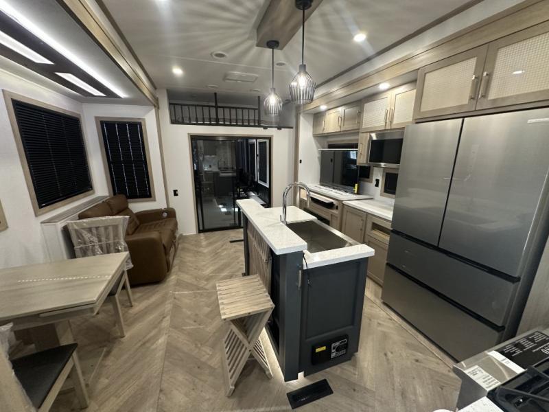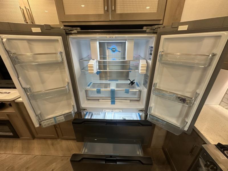With a 15' garage area, you can bring your favorite off-road toys in this toy hauler! The exclusive ramp door with backup camera makes it easy to load them up and once you have arrived you can set up the dual opposing sofas, the queen bed above them, and the 32" bunk loft, plus there is even one of the dual entry doors to the unit. While the chef is preparing dinner on the Lasus 24" range and oven, three others can sit at the kitchen island with raised countertop and three folding bar stools or at the dinette table to play a game or simply socialize all together. When mother nature is raining on your parade, relax on the reclining theater seating with lumbar and tilting headrest, and enjoy the entertainment center with fireplace and 50" Smart LED TV. The front private bedroom will have you feeling right at home with a king bed slide, a large wardrobe with an area next to it prepped for a washer and dryer, a dresser with hidden storage, and a LED Smart TV. The full bathroom has a 40" x 28" shower with a seat to freshen up in each morning!