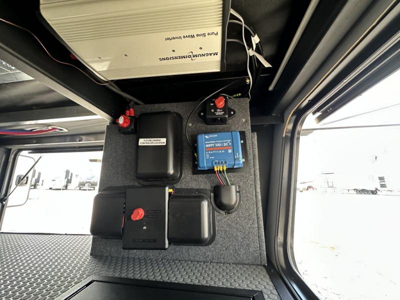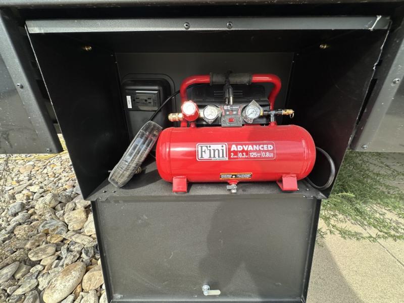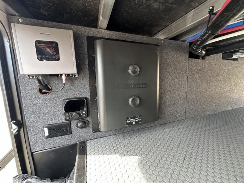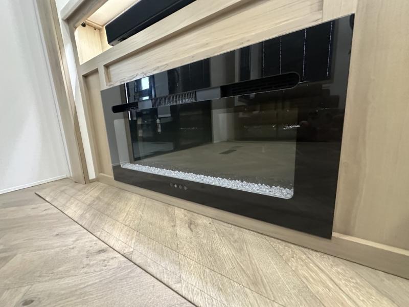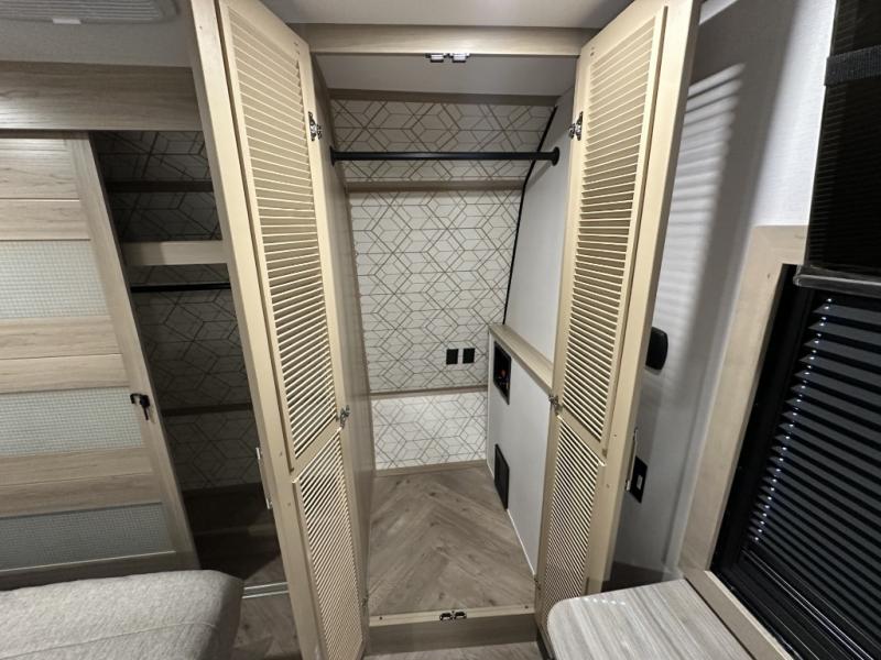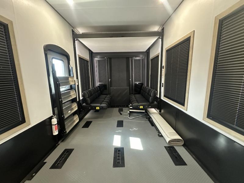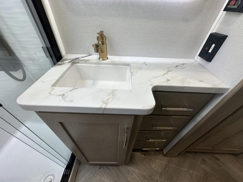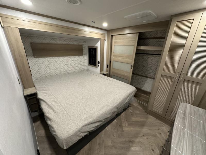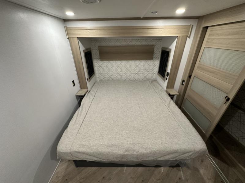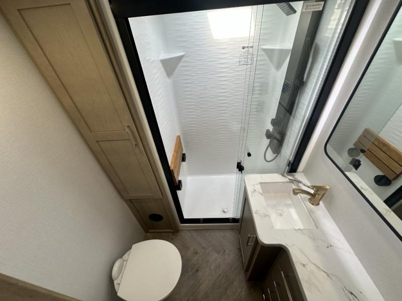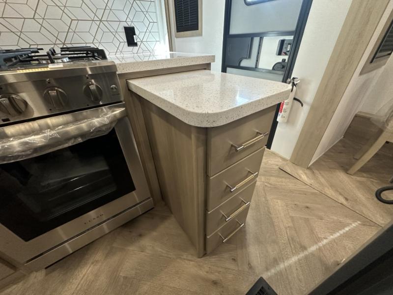 With a 15' garage area, you can bring your favorite off-road toys in this toy hauler! The exclusive ramp door with backup camera makes it easy to load them up and once you have arrived you can set up the dual opposing sofas, the queen bed above them, and the 32" bunk loft, plus there is even one of the dual entry doors to the unit. While the chef is preparing dinner on the Lasus 24" range and oven, three others can sit at the kitchen island with raised countertop and three folding bar stools or at the dinette table to play a game or simply socialize all together. When mother nature is raining on your parade, relax on the reclining theater seating with lumbar and tilting headrest, and enjoy the entertainment center with fireplace and 50" Smart LED TV. The front private bedroom will have you feeling right at home with a king bed slide, a large wardrobe with an area next to it prepped for a washer and dryer, a dresser with hidden storage, and a LED Smart TV. The full bathroom has a 40" x 28" shower with a seat to freshen up in each morning!