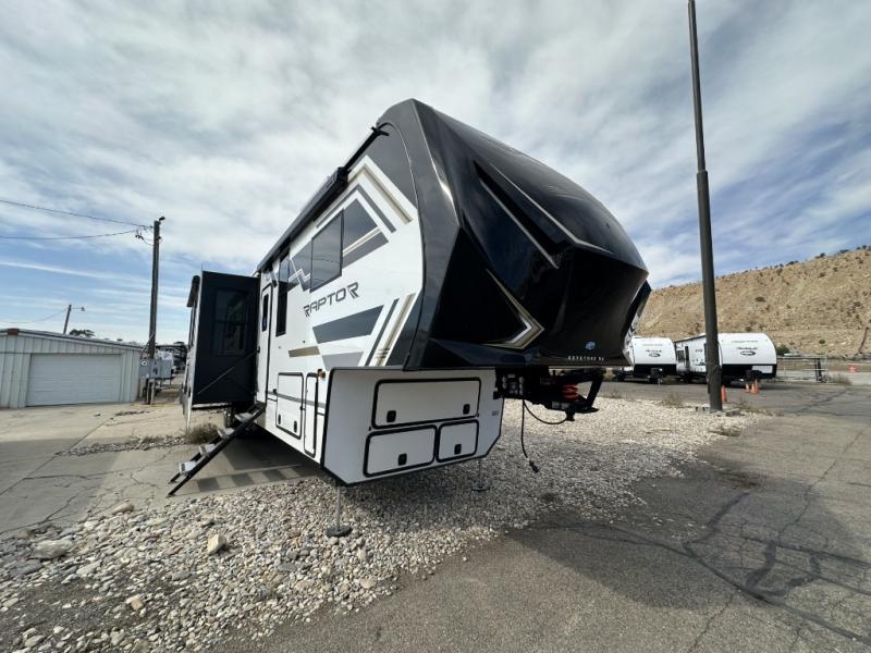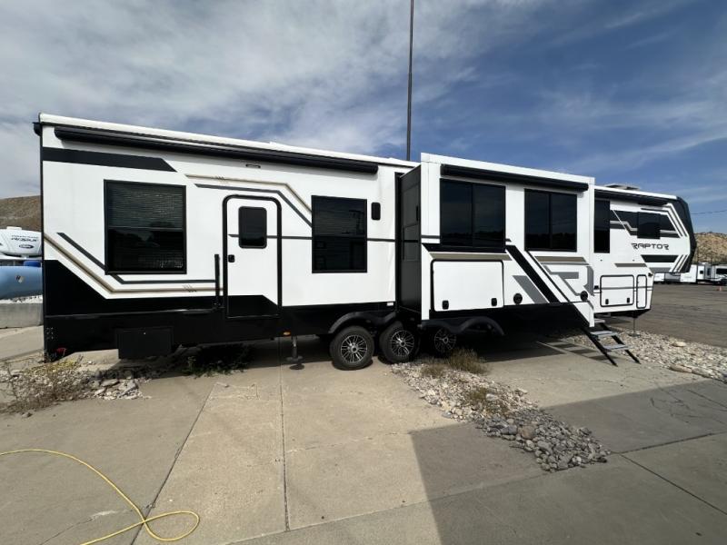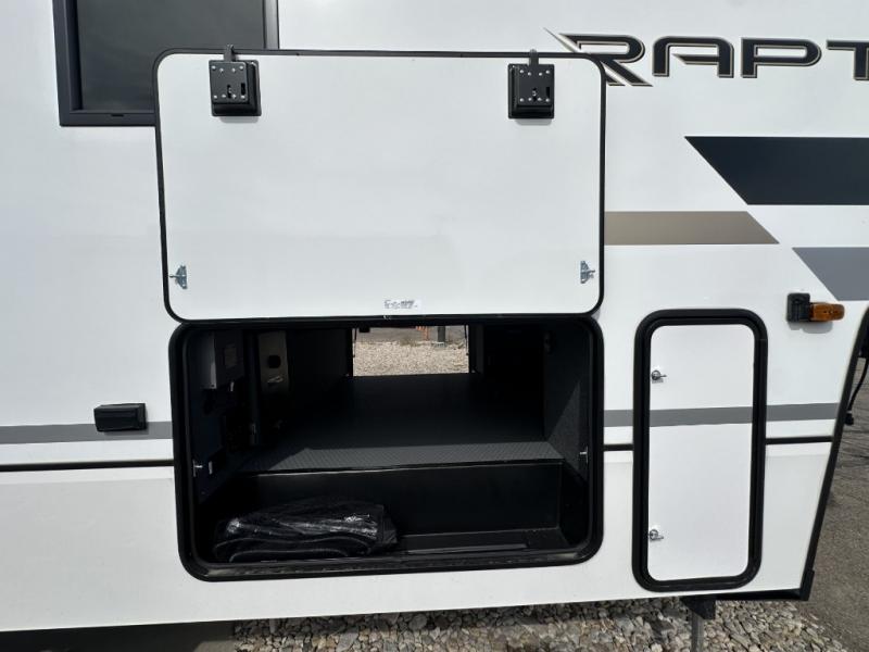 Experience a breath of fresh air with one of these Keystone RV Raptor fifth wheel toy haulers! Their rugged construction consists of a one-piece Alpha Super Flex TPO roof membrane, Dyna Span floor decking, and 5,000 lb. frame-welded tie- downs to keep your toys in place as you travel. Some unexpected conveniences you will appreciate include an Omni-Chill A/C system to keep you cool on those hot summer days, a Furrion backup camera, MaxTurn™ technology with a Helux™ pin box, and a Generation 3 iN-Command smart automation system with Global Connect to make life easier. There is also designer style vinyl flooring throughout, along with hardwood ceiling treatment with LED accent lighting, beach wood and white cabinetry, and many more interior comforts!