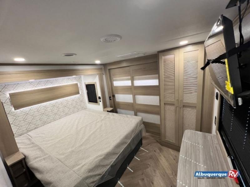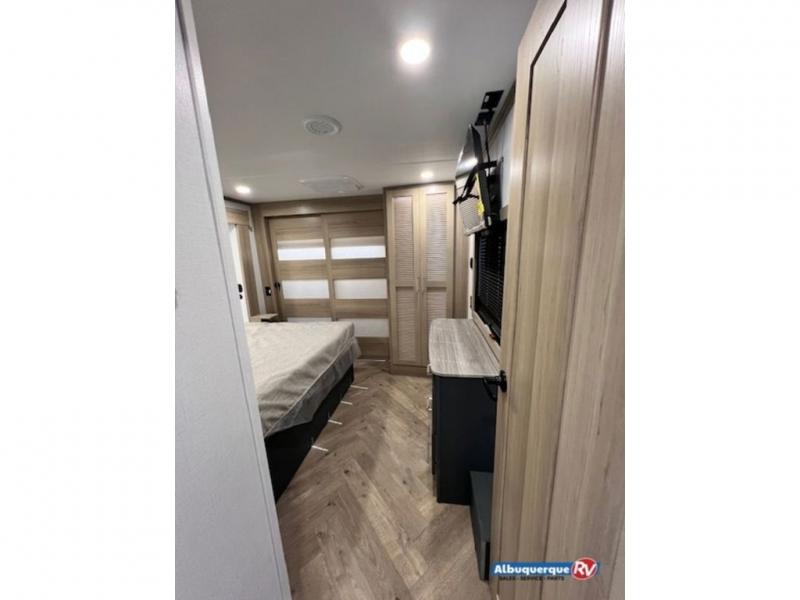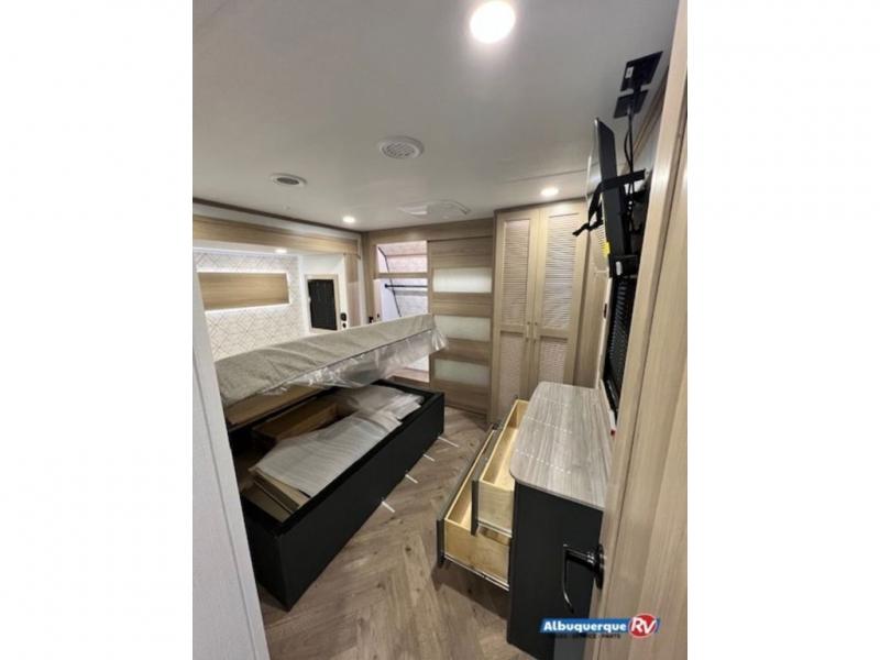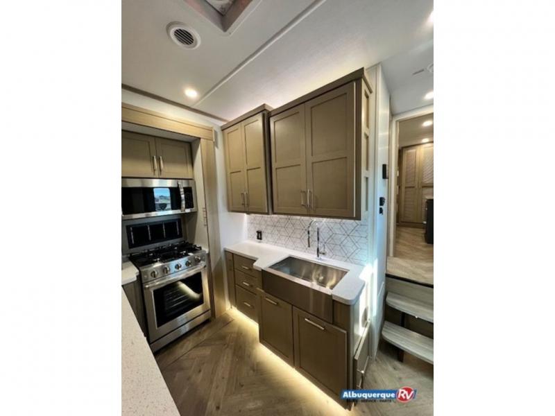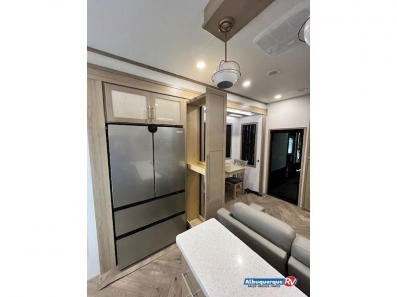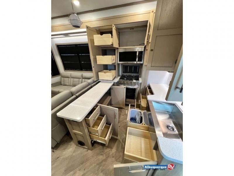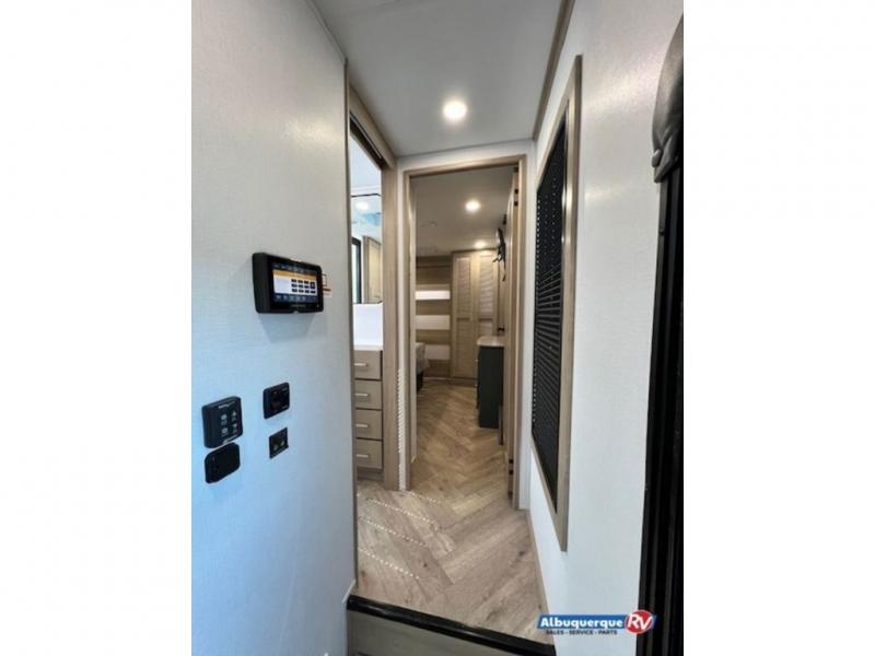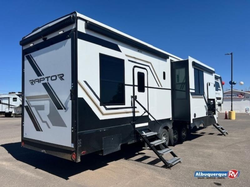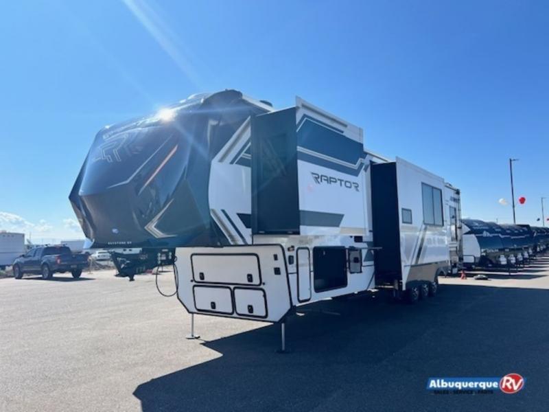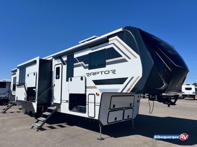 Experience a breath of fresh air with one of these Keystone RV Raptor fifth wheel toy haulers! Their rugged construction consists of a one-piece Alpha Super Flex TPO roof membrane, Dyna Span floor decking, and 5,000 lb. frame-welded tie- downs to keep your toys in place as you travel. Some unexpected conveniences you will appreciate include an Omni-Chill A/C system to keep you cool on those hot summer days, a Furrion backup camera, MaxTurn™ technology with a Helux™ pin box, and a Generation 3 iN-Command smart automation system with Global Connect to make life easier. There is also designer style vinyl flooring throughout, along with hardwood ceiling treatment with LED accent lighting, beach wood and white cabinetry, and many more interior comforts!