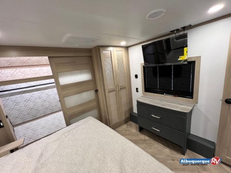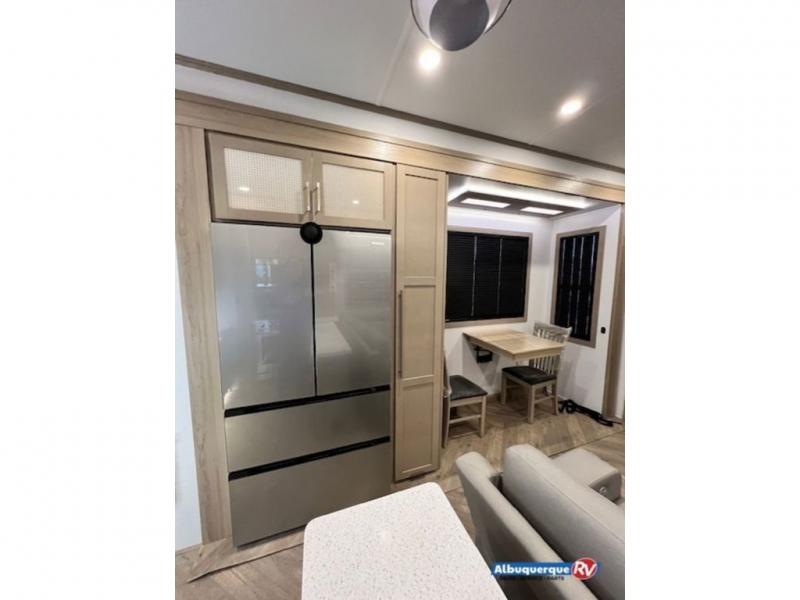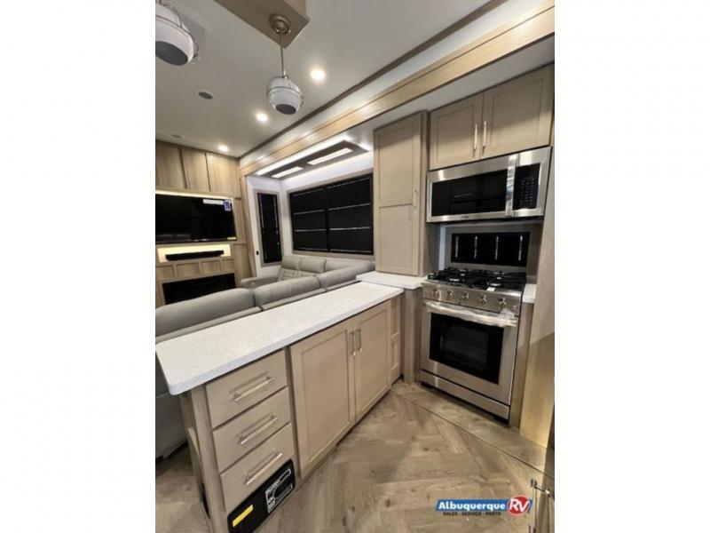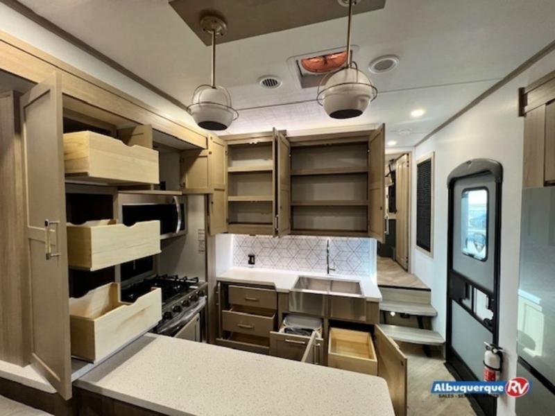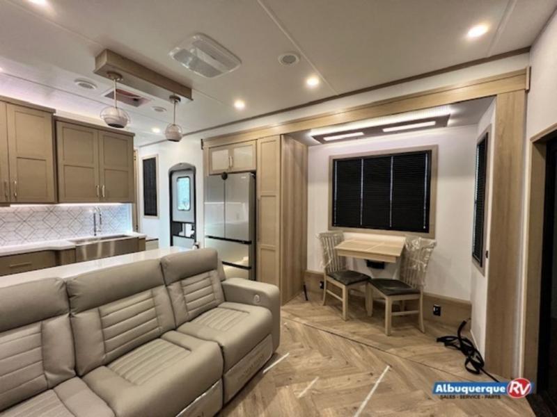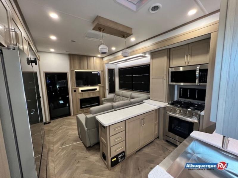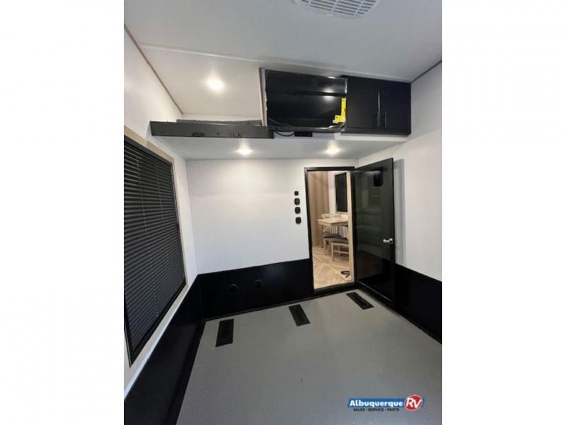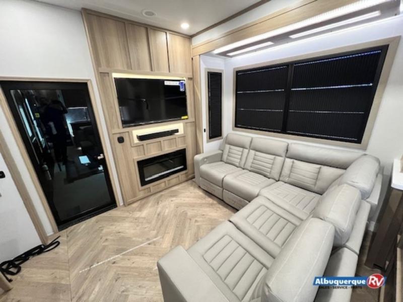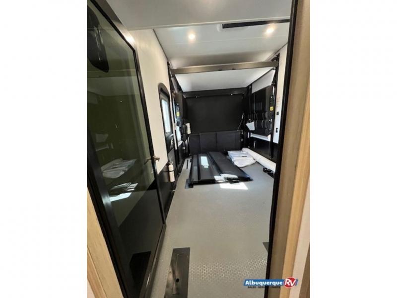 The whole family will love camping in this fifth wheel toy hauler! The front private bedroom has a king bed slide for more interior space, a Smart LED TV, a front large wardrobe, plus washer and dryer prep. Freshen up each morning in the full bathroom with the fiberglass one-piece shower then head to the kitchen to fry up some eggs on the four burner Lusso range and bake some cinnamon rolls in the 24" stainless steel oven. Grab a cold cup of orange juice from the 20 cu. ft. 12 volt refrigerator and enjoy it along with the eggs at the dinette table or in the 14' garage on one of the dual opposing sofas with cupholders. The L-shaped hide-a-bed sofa is conveniently across from the entertainment center with a 50" Smart LED TV and fireplace. As you head into the 14' garage area, you will notice a HappiJac bed with a 32" x 74" mattress, a queen bed above the opposing sofas, Raptor exclusive frame welded tie downs, and one of the dual entry doors to the unit!