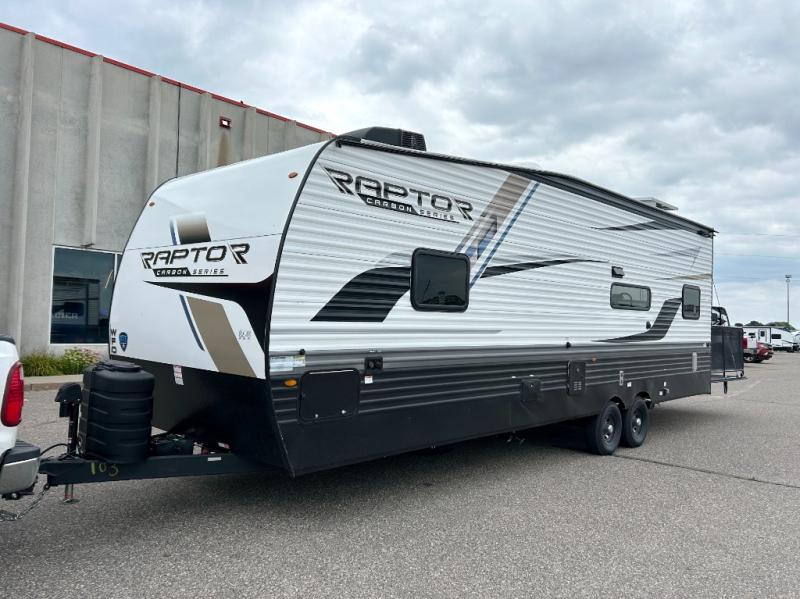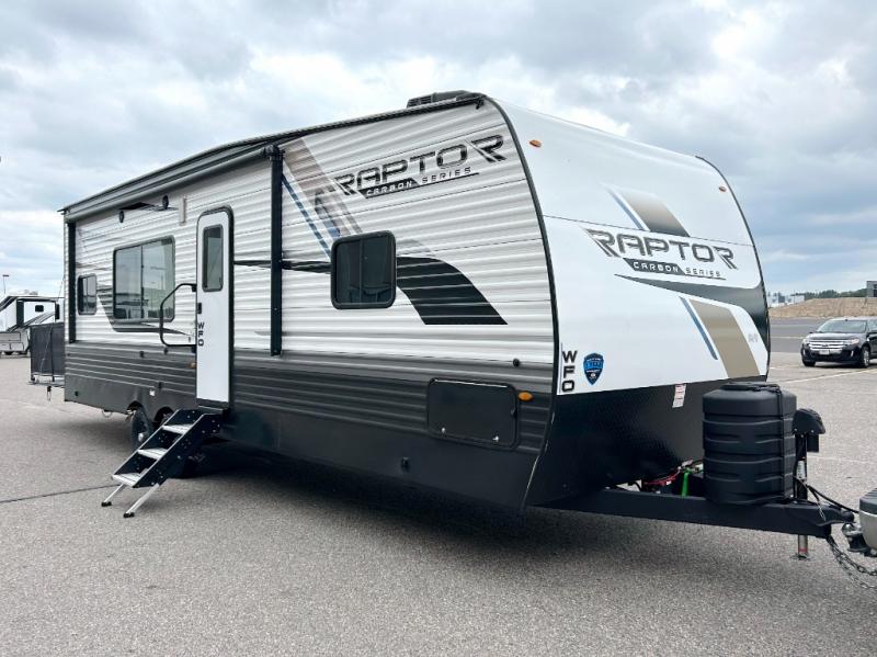 Each Raptor Carbon Series toy hauler travel trailer is built with a 10" I-beam frame, laminated sidewalls with double-welded aluminum construction, plus Dexter E-Z lube 6,000 lb. axles with self-adjusting brakes, electric stabilizer jacks for easy setup, and MORyde step above steps for stability on any type of ground you camp on. On the interior, designer style vinyl flooring throughout, pull-down window shades for privacy at night, and LED lighting throughout. You will appreciate the Girard tankless on-demand water heater for showering both inside and out, and you can also customize your trailer by adding a few options if you wish. The optional patio package will provide you with a raised outdoor living area to enjoy, and the optional SolarFlex protect 220 allows you the ability to decide how you want to camp. Choose your favorite model today!